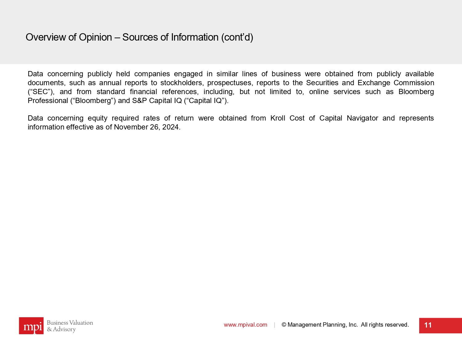 Overview of Opinion – Sources of Information (cont’d) Data concerning publicly held companies engaged in similar lines of business were obtained from publicly available documents, such as annual reports to stockholders, prospectuses, reports to the Securities and Exchange Commission (“SEC”), and from standard financial references, including, but not limited to, online services such as Bloomberg Professional (“Bloomberg”) and S&P Capital IQ (“Capital IQ”) . Data concerning equity required rates of return were obtained from Kroll Cost of Capital Navigator and represents information effective as of November 26 , 2024 . www.mpival.com | © Management Planning, Inc. All rights reserved. 11