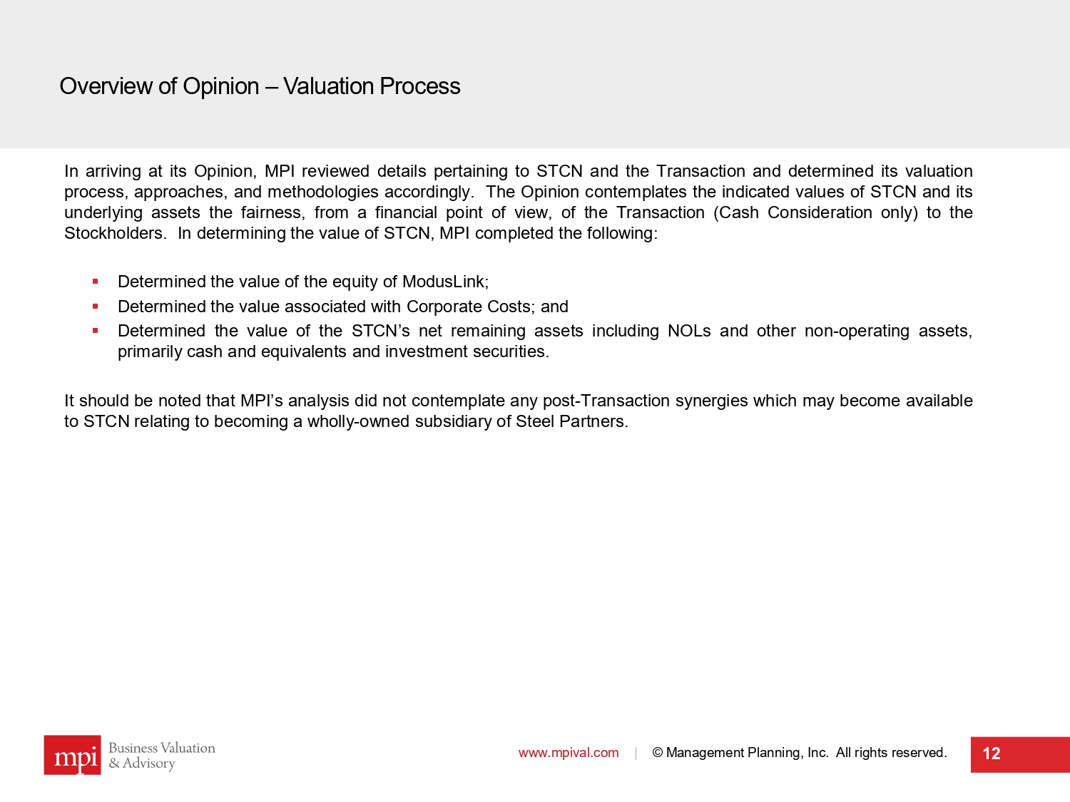 Overview of Opinion – Valuation Process In arriving at its Opinion, MPI reviewed details pertaining to STCN and the Transaction and determined its valuation process, approaches, and methodologies accordingly . The Opinion contemplates the indicated values of STCN and its underlying assets the fairness, from a financial point of view, of the Transaction (Cash Consideration only) to the Stockholders . In determining the value of STCN, MPI completed the following : ▪ Determined the value of the equity of ModusLink ; ▪ Determined the value associated with Corporate Costs ; and ▪ Determined the value of the STCN’s net remaining assets including NOLs and other non - operating assets, primarily cash and equivalents and investment securities . It should be noted that MPI’s analysis did not contemplate any post - Transaction synergies which may become available to STCN relating to becoming a wholly - owned subsidiary of Steel Partners . www.mpival.com | © Management Planning, Inc. All rights reserved. 12