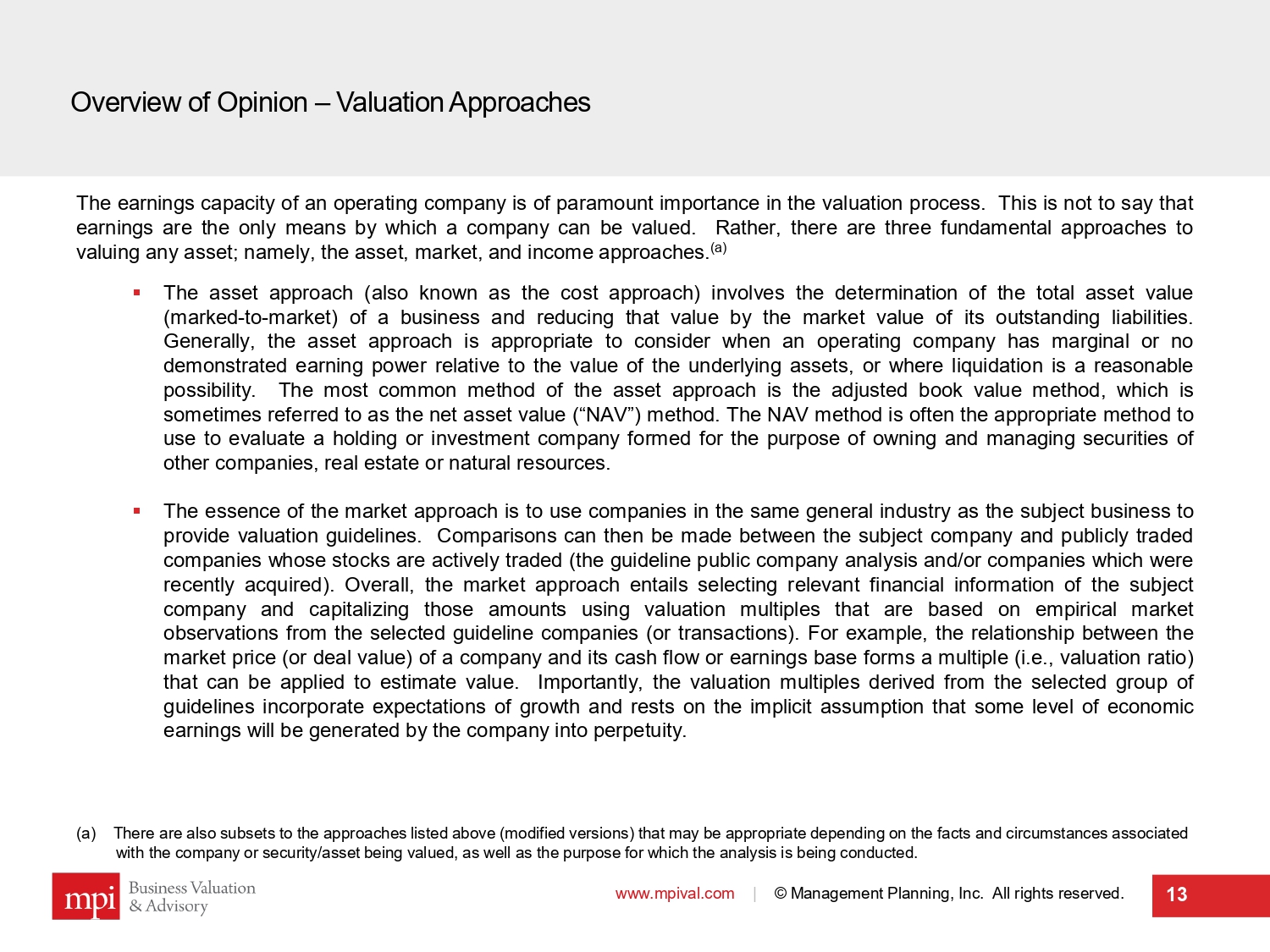 Overview of Opinion – Valuation Approaches The earnings capacity of an operating company is of paramount importance in the valuation process . This is not to say that earnings are the only means by which a company can be valued . Rather, there are three fundamental approaches to valuing any asset ; namely, the asset, market, and income approaches . (a) ▪ The asset approach (also known as the cost approach) involves the determination of the total asset value (marked - to - market) of a business and reducing that value by the market value of its outstanding liabilities . Generally, the asset approach is appropriate to consider when an operating company has marginal or no demonstrated earning power relative to the value of the underlying assets, or where liquidation is a reasonable possibility . The most common method of the asset approach is the adjusted book value method, which is sometimes referred to as the net asset value (“NAV”) method . The NAV method is often the appropriate method to use to evaluate a holding or investment company formed for the purpose of owning and managing securities of other companies, real estate or natural resources . ▪ The essence of the market approach is to use companies in the same general industry as the subject business to provide valuation guidelines . Comparisons can then be made between the subject company and publicly traded companies whose stocks are actively traded (the guideline public company analysis and/or companies which were recently acquired) . Overall, the market approach entails selecting relevant financial information of the subject company and capitalizing those amounts using valuation multiples that are based on empirical market observations from the selected guideline companies (or transactions) . For example, the relationship between the market price (or deal value) of a company and its cash flow or earnings base forms a multiple (i . e . , valuation ratio) that can be applied to estimate value . Importantly, the valuation multiples derived from the selected group of guidelines incorporate expectations of growth and rests on the implicit assumption that some level of economic earnings will be generated by the company into perpetuity . www.mpival.com | © Management Planning, Inc. All rights reserved. 13 (a) There are also subsets to the approaches listed above (modified versions) that may be appropriate depending on the facts and circumstances associated with the company or security/asset being valued, as well as the purpose for which the analysis is being conducted .