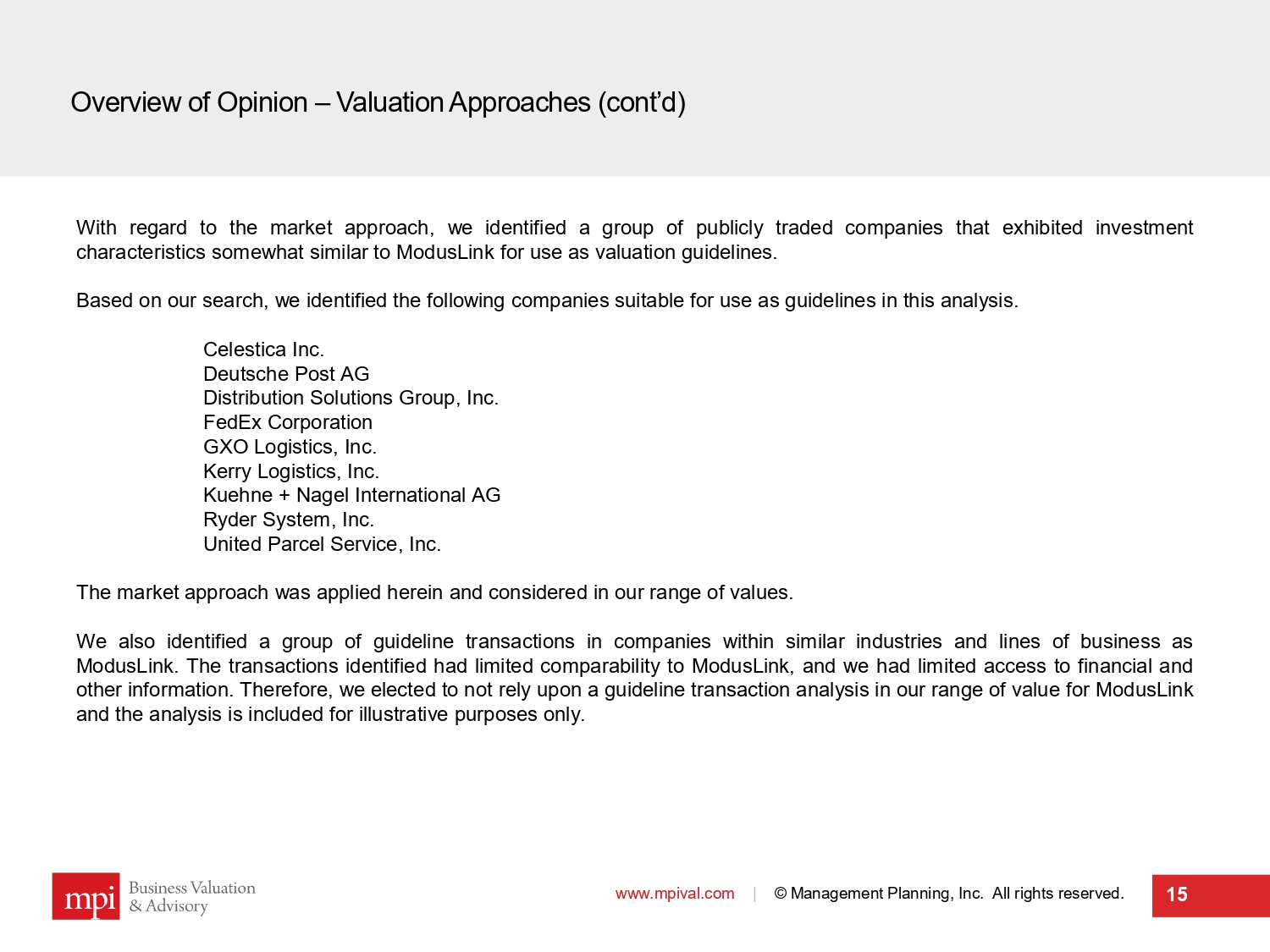 Overview of Opinion – Valuation Approaches (cont’d) With regard to the market approach, we identified a group of publicly traded companies that exhibited investment characteristics somewhat similar to ModusLink for use as valuation guidelines . Based on our search, we identified the following companies suitable for use as guidelines in this analysis . Celestica Inc. Deutsche Post AG Distribution Solutions Group, Inc. FedEx Corporation GXO Logistics, Inc. Kerry Logistics, Inc. Kuehne + Nagel International AG Ryder System, Inc. United Parcel Service, Inc. The market approach was applied herein and considered in our range of values . We also identified a group of guideline transactions in companies within similar industries and lines of business as ModusLink . The transactions identified had limited comparability to ModusLink , and we had limited access to financial and other information . Therefore, we elected to not rely upon a guideline transaction analysis in our range of value for ModusLink and the analysis is included for illustrative purposes only . www.mpival.com | © Management Planning, Inc. All rights reserved. 15