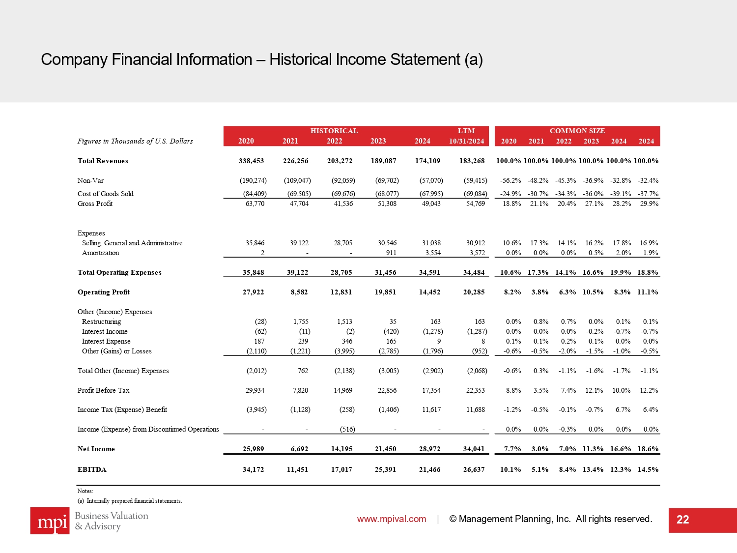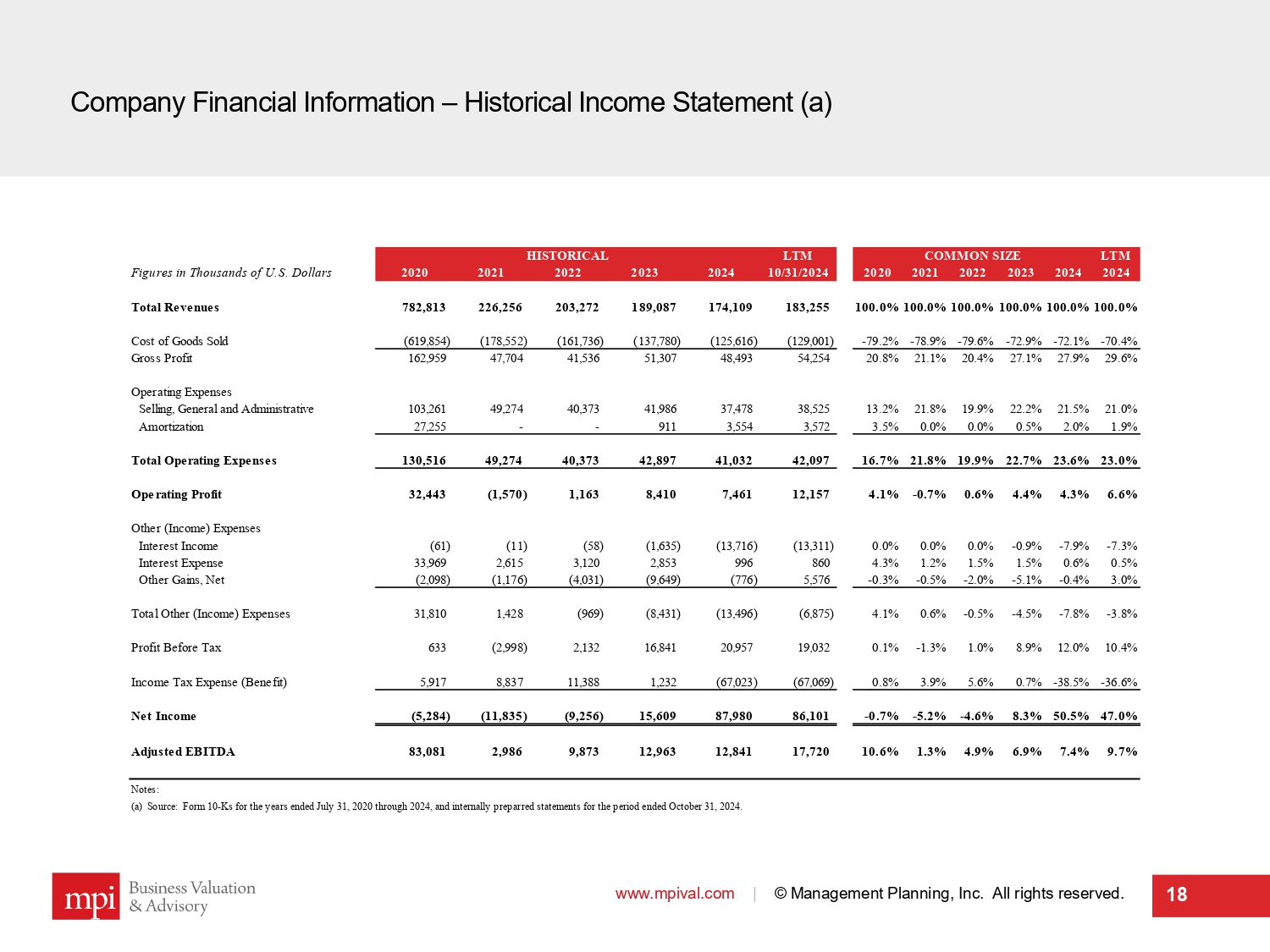Company Financial Information – Historical Income Statement (a) www.mpival.com | © Management Planning, Inc. All rights reserved. 18 HISTORICAL LTM COMMON SIZE LTM Figures in Thousands of U.S. Dollars 2020 2021 2022 2023 2024 10/31/2024 2020 2021 2022 2023 2024 2024 Total Revenues 782,813 226,256 203,272 189,087 174,109 183,255 100.0%100.0%100.0%100.0%100.0%100.0% Cost of Goods Sold (619,854) (178,552) (161,736) (137,780) (125,616) (129,001) -79.2% -78.9% -79.6% -72.9% -72.1% -70.4% Gross Profit 162,959 47,704 41,536 51,307 48,493 54,254 20.8% 21.1% 20.4% 27.1% 27.9% 29.6% Operating Expenses Selling, General and Administrative 103,261 49,274 40,373 41,986 37,478 38,525 13.2% 21.8% 19.9% 22.2% 21.5% 21.0% Amortization 27,255 - - 911 3,554 3,572 3.5% 0.0% 0.0% 0.5% 2.0% 1.9% Total Operating Expenses 130,516 49,274 40,373 42,897 41,032 42,097 16.7% 21.8% 19.9% 22.7% 23.6% 23.0% Operating Profit 32,443 (1,570) 1,163 8,410 7,461 12,157 4.1% -0.7% 0.6% 4.4% 4.3% 6.6% Other (Income) Expenses Interest Income (61) (11) (58) (1,635) (13,716) (13,311) 0.0% 0.0% 0.0% -0.9% -7.9% -7.3% Interest Expense 33,969 2,615 3,120 2,853 996 860 4.3% 1.2% 1.5% 1.5% 0.6% 0.5% Other Gains, Net (2,098) (1,176) (4,031) (9,649) (776) 5,576 -0.3% -0.5% -2.0% -5.1% -0.4% 3.0% Total Other (Income) Expenses 31,810 1,428 (969) (8,431) (13,496) (6,875) 4.1% 0.6% -0.5% -4.5% -7.8% -3.8% Profit Before Tax 633 (2,998) 2,132 16,841 20,957 19,032 0.1% -1.3% 1.0% 8.9% 12.0% 10.4% Income Tax Expense (Benefit) 5,917 8,837 11,388 1,232 (67,023) (67,069) 0.8% 3.9% 5.6% 0.7% -38.5% -36.6% Net Income (5,284) (11,835) (9,256) 15,609 87,980 86,101 -0.7% -5.2% -4.6% 8.3% 50.5% 47.0% Adjusted EBITDA 83,081 2,986 9,873 12,963 12,841 17,720 10.6% 1.3% 4.9% 6.9% 7.4% 9.7% Notes: (a) Source: Form 10-Ks for the years ended July 31, 2020 through 2024, and internally preparred statements for the period ended October 31, 2024.