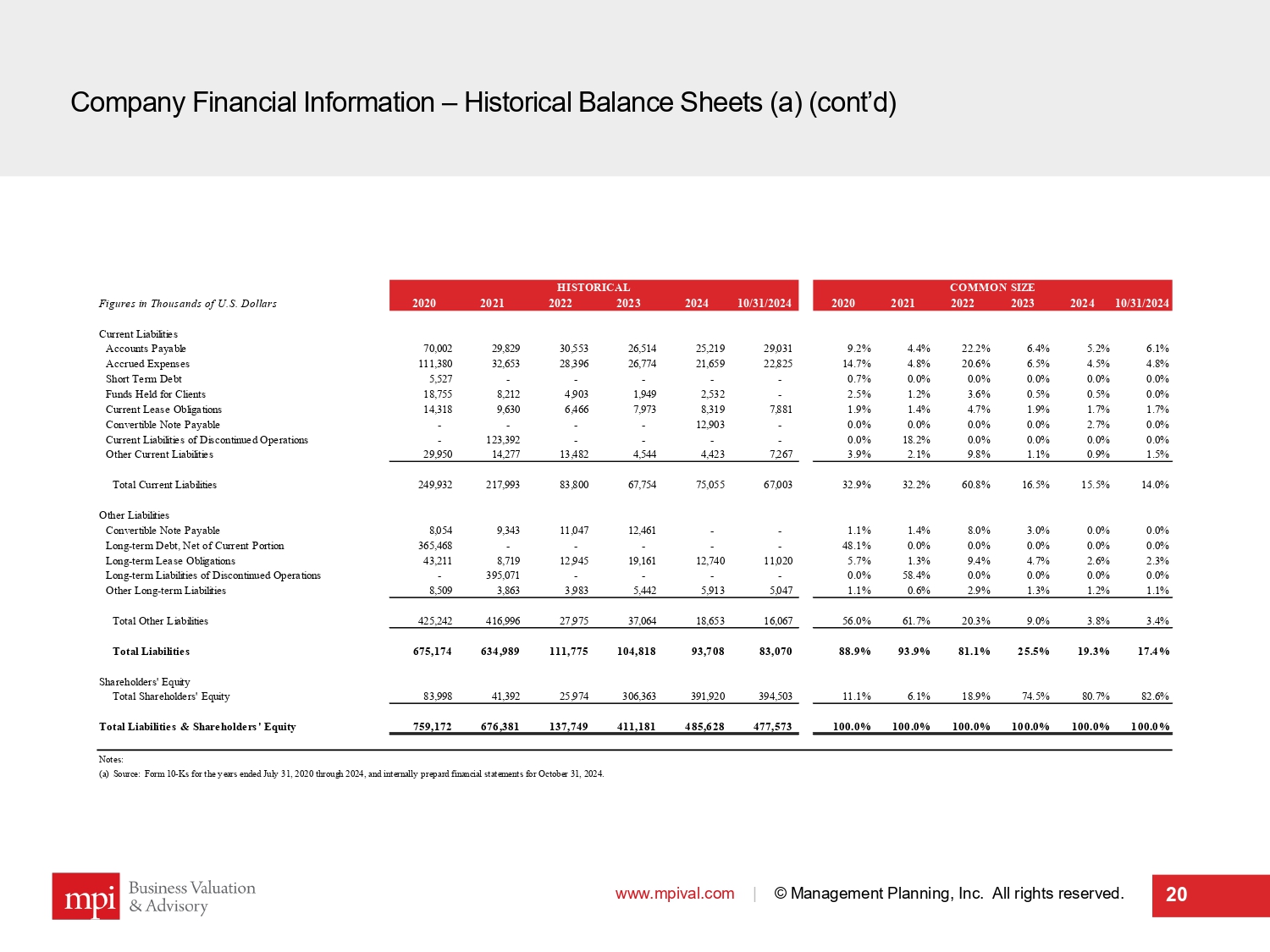 Company Financial Information – Historical Balance Sheets (a) www.mpival.com | © Management Planning, Inc. All rights reserved. 19 HISTORICAL COMMON SIZE Figures in Thousands of U.S. Dollars 2020 2021 2022 2023 2024 10/31/2024 2020 2021 2022 2023 2024 10/31/2024 Current Assets Cash and Cash Equivalents 75,887 58,117 53,142 121,372 248,614 233,927 10.0% 8.6% 38.6% 29.5% 51.2% 49.0% Accounts Receivable 93,072 36,547 40,083 28,616 33,443 34,543 12.3% 5.4% 29.1% 7.0% 6.9% 7.2% Inventories, Net 15,354 9,043 8,151 8,569 6,733 8,667 2.0% 1.3% 5.9% 2.1% 1.4% 1.8% Funds Held for Clients 18,755 8,212 4,903 2,031 2,576 - 2.5% 1.2% 3.6% 0.5% 0.5% 0.0% Current Assets of Discontinued Operations - 96,522 - - - - 0.0% 14.3% 0.0% 0.0% 0.0% 0.0% Other Current Assets 20,475 4,958 3,551 158,686 4,462 6,620 2.7% 0.7% 2.6% 38.6% 0.9% 1.4% Total Current Assets 223,543 213,399 109,830 319,274 295,828 283,757 29.4% 31.6% 79.7% 77.6% 60.9% 59.4% Fixed Assets, Net 79,678 4,616 3,534 3,698 5,536 5,642 10.5% 0.7% 2.6% 0.9% 1.1% 1.2% Other Assets Operating Lease Right-of-use Assets 56,140 18,253 19,655 27,098 20,748 18,555 7.4% 2.7% 14.3% 6.6% 4.3% 3.9% Other Intangible Assets, Net 135,263 - - 34,589 31,036 30,143 17.8% 0.0% 0.0% 8.4% 6.4% 6.3% Goodwill 257,128 - - 22,785 19,703 19,703 33.9% 0.0% 0.0% 5.5% 4.1% 4.1% Long-term Assets of Discontinued Operations - 434,421 - - - - 0.0% 64.2% 0.0% 0.0% 0.0% 0.0% Investments - - - - 41,376 48,693 0.0% 0.0% 0.0% 0.0% 8.5% 10.2% Deferred Tax Asset - - - 317 68,315 - 0.0% 0.0% 0.0% 0.1% 14.1% 0.0% Other Assets 7,420 5,692 4,730 3,420 3,086 71,080 1.0% 0.8% 3.4% 0.8% 0.6% 14.9% Total Other Assets 455,951 458,366 24,385 88,209 184,264 188,174 60.1% 67.8% 17.7% 21.5% 37.9% 39.4% Total Assets 759,172 676,381 137,749 411,181 485,628 477,573 100.0% 100.0% 100.0% 100.0% 100.0% 100.0% Notes: (a) Source: Form 10-Ks for the years ended July 31, 2020 through 2024, and internally prepard financial statements for October 31, 2024.