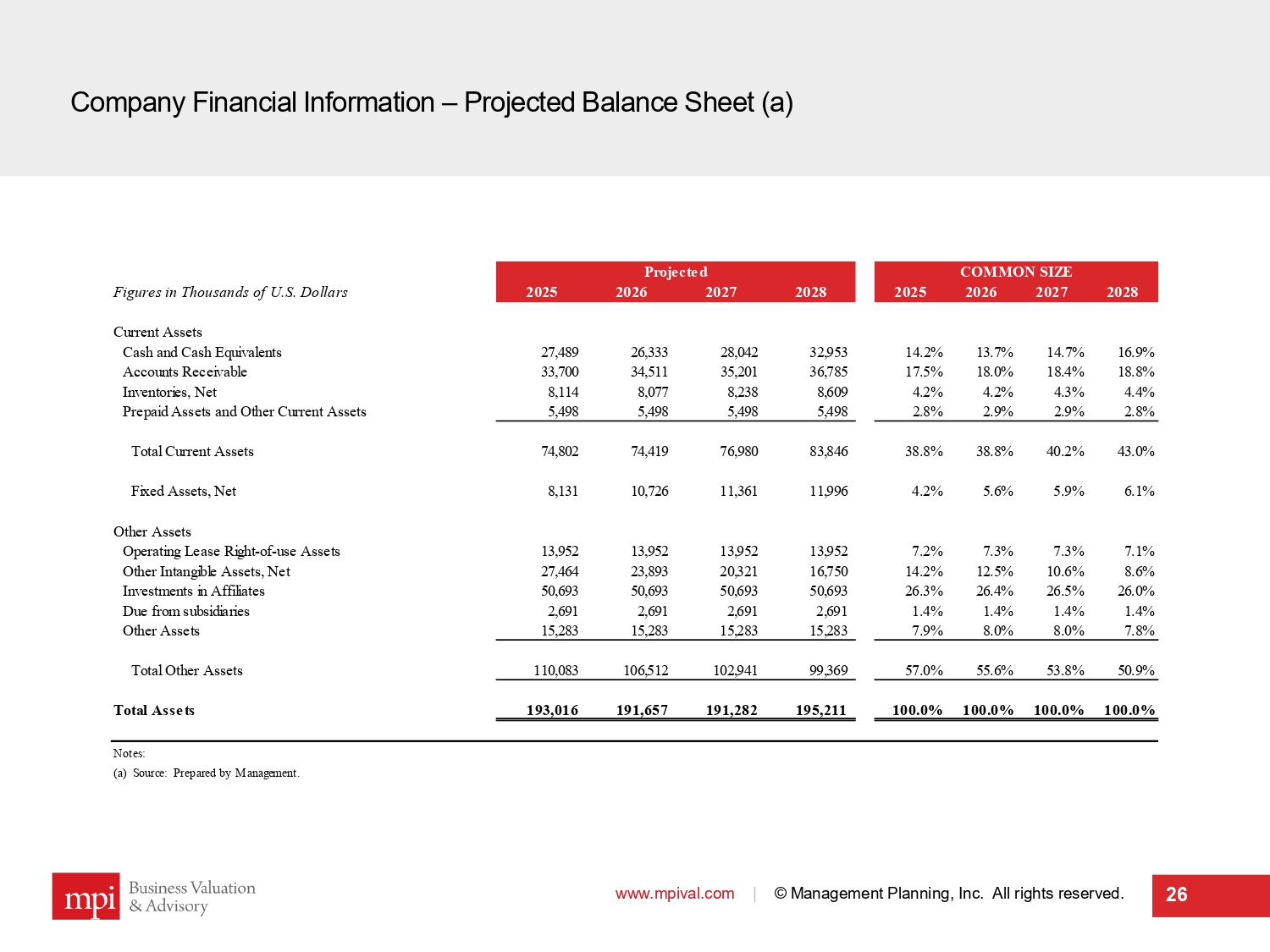 Company Financial Information – Projected Income Statement (a) www.mpival.com | © Management Planning, Inc. All rights reserved. 25 PROJECTED COMMON SIZE Figures in Thousands of U.S. Dollars 2025 2026 2027 2028 2025 2026 2027 2028 Total Revenues 184,729 187,500 191,250 199,856 100.0%100.0%100.0%100.0% Non-Var (66,449) (67,446) (68,795) (71,890) -36.0% -36.0% -36.0% -36.0% Cost of Goods Sold (68,402) (69,428) (70,571) (72,787) -37.0% -37.0% -36.9% -36.4% Gross Profit 49,878 50,626 51,884 55,178 27.0% 27.0% 27.1% 27.6% Expenses Selling, General and Administrative 31,820 34,173 34,856 36,425 17.2% 18.2% 18.2% 18.2% Amortization 3,571 3,571 3,571 3,571 1.9% 1.9% 1.9% 1.8% Total Operating Expenses 35,392 37,744 38,428 39,996 19.2% 20.1% 20.1% 20.0% Operating Profit 14,486 12,882 13,456 15,182 7.8% 6.9% 7.0% 7.6% Other (Income) Expenses Restructuring 7,100 1,000 1,000 1,000 3.8% 0.5% 0.5% 0.5% Interest Income (825) (825) (825) (825) -0.4% -0.4% -0.4% -0.4% Interest Expense (0) (0) (0) (0) 0.0% 0.0% 0.0% 0.0% Other (Gains) or Losses (834) (750) (750) (750) -0.5% -0.4% -0.4% -0.4% Total Other (Income) Expenses 5,441 (575) (575) (575) 2.9% -0.3% -0.3% -0.3% Profit Before Tax 9,045 13,457 14,031 15,757 4.9% 7.2% 7.3% 7.9% Income Tax (Expense) Benefit (2,500) (2,600) (2,700) (2,800) -1.4% -1.4% -1.4% -1.4% Net Income 6,545 10,857 11,331 12,957 3.5% 5.8% 5.9% 6.5% EBITDA 14,157 18,568 19,142 20,868 7.7% 9.9% 10.0% 10.4% Notes: (a) Source: Prepared by Management.