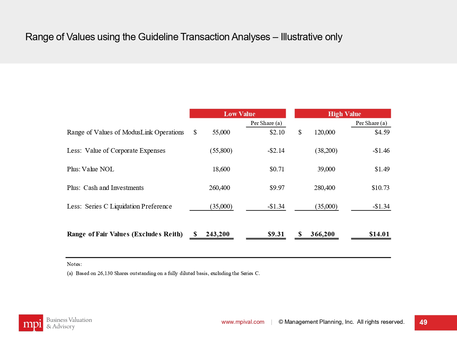 Ranges of Value using the Guideline Public Company Analyses www.mpival.com | © Management Planning, Inc. All rights reserved. 48 Low Value High Value Per Share (a) Per Share (a) Range of Values of ModusLink Operations 55,000$ $2.10 120,000$ $4.59 Less: Value of Corporate Expenses (55,800) -$2.14 (38,200) -$1.46 Plus: Value NOL 18,600 $0.71 39,000 $1.49 Plus: Cash and Investments 260,400 $9.97 280,400 $10.73 Less: Series C Liquidation Preference (35,000) -$1.34 (35,000) -$1.34 Range of Fair Values (Excludes Reith) 243,200$ $9.31 366,200$ $14.01 Notes: (a) Based on 26,130 Shares outstanding on a fully diluted basis, excluding the Series C.
