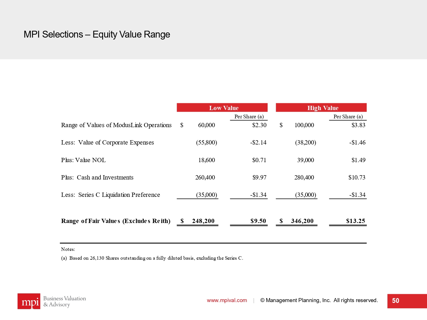 Range of Values using the Guideline Transaction Analyses – Illustrative only www.mpival.com | © Management Planning, Inc. All rights reserved. 49 Low Value High Value Per Share (a) Per Share (a) Range of Values of ModusLink Operations 55,000$ $2.10 120,000$ $4.59 Less: Value of Corporate Expenses (55,800) -$2.14 (38,200) -$1.46 Plus: Value NOL 18,600 $0.71 39,000 $1.49 Plus: Cash and Investments 260,400 $9.97 280,400 $10.73 Less: Series C Liquidation Preference (35,000) -$1.34 (35,000) -$1.34 Range of Fair Values (Excludes Reith) 243,200$ $9.31 366,200$ $14.01 Notes: (a) Based on 26,130 Shares outstanding on a fully diluted basis, excluding the Series C.