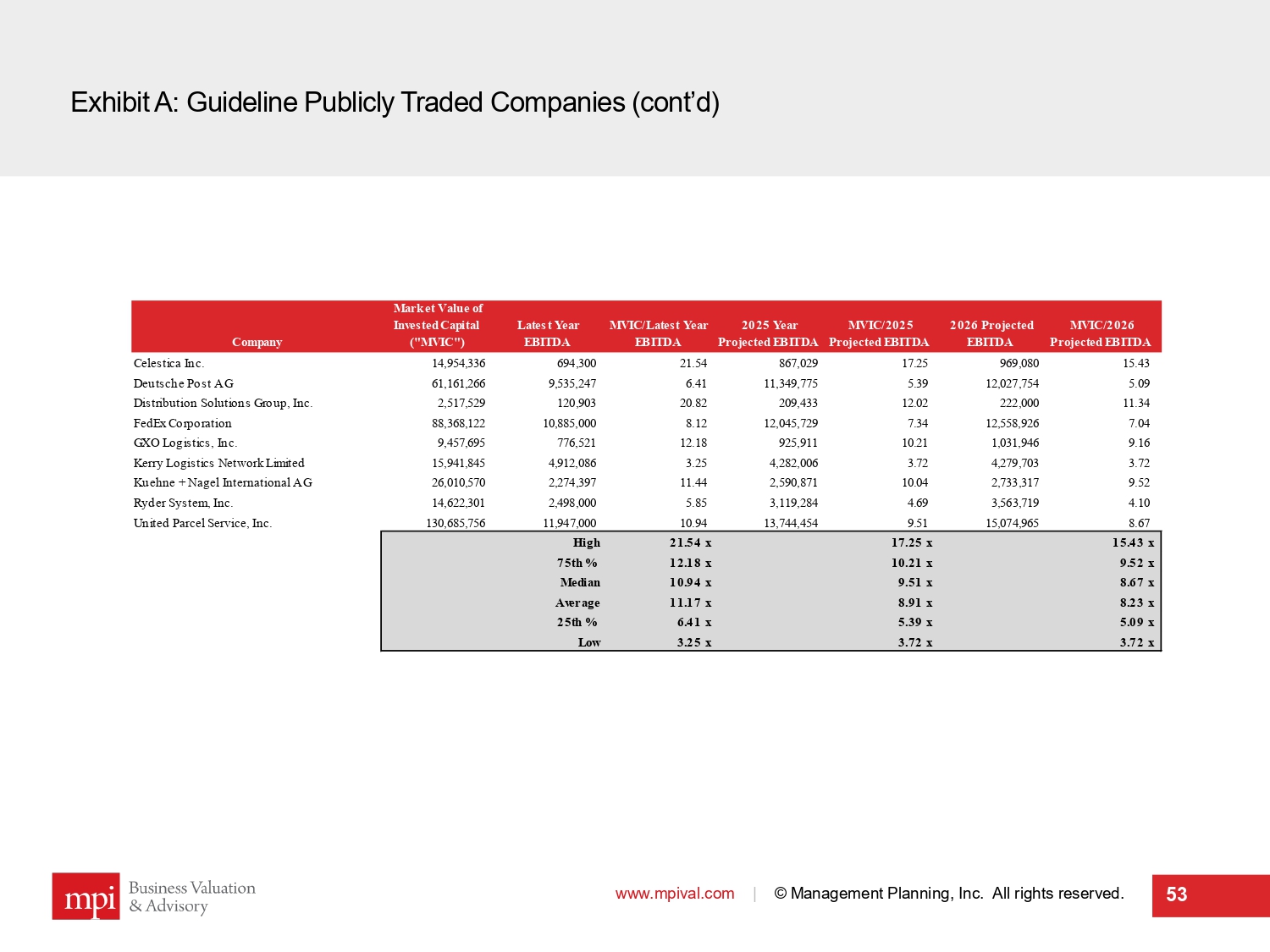 Exhibit A: Guideline Publicly Traded Companies www.mpival.com | © Management Planning, Inc. All rights reserved. 52 Company Market Value of Invested Capital ("MVIC") Latest Year Net Sales/Revenues MVIC/Latest Year Net Sales/Revenues 2025 Year Projected Net Sales/Revenues MVIC/2025 Projected Net Sales/Revenues 2026 Year Projected Net Sales/Revenues MVIC/2026 Projected Net Sales/Revenues Celestica Inc. 14,954,336 9,240,800 1.62 10,575,284 1.4 11,946,356 1.3 Deutsche Post AG 61,161,266 83,233,000 0.73 86,929,579 0.7 90,240,105 0.7 Distribution Solutions Group, Inc. 2,517,529 1,728,880 1.46 2,001,500 1.3 2,091,000 1.2 FedEx Corporation 88,368,122 87,591,000 1.01 90,638,709 1.0 94,708,588 0.9 GXO Logistics, Inc. 9,457,695 11,049,000 0.86 12,927,835 0.7 13,863,426 0.7 Kerry Logistics Network Limited 15,941,845 49,643,008 0.32 55,358,981 0.3 57,524,186 0.3 Kuehne + Nagel International AG 26,010,570 23,731,000 1.10 24,685,979 1.1 25,409,400 1.0 Ryder System, Inc. 14,622,301 12,470,000 1.17 13,807,229 1.1 14,824,003 1.0 United Parcel Service, Inc. 130,685,756 90,686,000 1.44 94,682,547 1.4 99,171,389 1.3 High 1.62x 1.41x 1.32x 75th % 1.44x 1.26x 1.20x Median 1.10x 1.05x 0.99x Average 1.08x 0.98x 0.93x 25th % 0.86x 0.73x 0.68x Low 0.32x 0.29x 0.28x