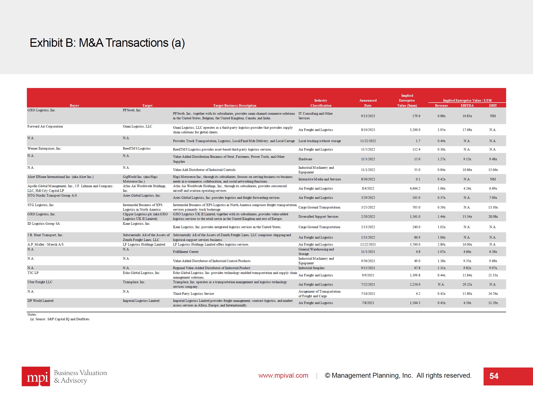 Exhibit B: M&A Transactions (a) www.mpival.com | © Management Planning, Inc. All rights reserved. 54 Implied Industry Announced Enterprise Buyer Target Target Business Description Classification Date Value ($mm) Revenue EBITDA EBIT GXO Logistics, Inc. PFSweb, Inc. PFSweb, Inc., together with its subsidiaries, provides omni-channel commerce solutions in the United States, Belgium, the United Kingdom, Canada, and India. IT Consulting and Other Services 9/13/2023 179.6 0.88x 10.83x NM Forward Air Corporation Omni Logistics, LLC Omni Logistics, LLC operates as a third-party logistics provider that provides supply chain solutions for global clients. Air Freight and Logistics 8/10/2023 3,200.0 1.95x 17.68x N.A. N.A. N.A. Provides Truck Transportation, Logistics, Local/Final Mile Delivery, and Local Cartage Local trucking without storage 11/22/2022 1.7 0.44x N.A. N.A. Werner Enterprises, Inc. ReedTMS Logistics ReedTMS Logistics provides asset-based third-party logistics services. Air Freight and Logistics 11/5/2022 112.4 0.30x N.A. N.A. N.A. N.A. Value-Added Distribution Business of Strut, Fasteners, Power Tools, and Other Supplies Hardware 11/1/2022 15.0 1.27x 9.13x 9.48x N.A. N.A. Value-Add Distributor of Industrial Controls Industrial Machinery and Equipment 11/1/2022 35.0 0.84x 10.86x 13.06x Alset EHome International Inc. (nka:Alset Inc.) GigWorld Inc. (nka:Hapi Metaverse Inc.) Hapi Metaverse Inc., through its subsidiaries, focuses on serving business-to-business needs in e-commerce, collaboration, and social networking functions. Interactive Media and Services 8/30/2022 0.1 9.42x N.A. NM Apollo Global Management, Inc.; J.F. Lehman and Company, LLC; Hill City Capital LP Atlas Air Worldwide Holdings, Inc. Atlas Air Worldwide Holdings, Inc., through its subsidiaries, provides outsourced aircraft and aviation operating services. Air Freight and Logistics 8/4/2022 4,664.2 1.06x 4.26x 6.69x NTG Nordic Transport Group A/S Aries Global Logistics, Inc. Aries Global Logistics, Inc. provides logistics and freight forwarding services. Air Freight and Logistics 3/29/2022 105.0 0.37x N.A. 7.00x STG Logistics, Inc. Intermodal Business of XPS Logistics in North America Intermodal Business of XPS Logistics in North America comprises freight transportation services primarily truck brokerage. Cargo Ground Transportation 3/25/2022 705.0 0.59x N.A. 13.30x GXO Logistics, Inc. Clipper Logistics plc (nka:GXO Logistics UK II Limited) GXO Logistics UK II Limited, together with its subsidiaries, provides value-added logistics services to the retail sector in the United Kingdom and rest of Europe. Diversified Support Services 2/20/2022 1,561.0 1.44x 13.34x 28.08x ID Logistics Group SA Kane Logistics, Inc. Kane Logistics, Inc. provides integrated logistics services in the United States. Cargo Ground Transportation 2/13/2022 240.0 1.02x N.A. N.A. J.B. Hunt Transport, Inc. Substantially All of the Assets of Zenith Freight Lines, LLC Substantially All of the Assets of Zenith Freight Lines, LLC comprises shipping and logistical support services business. Air Freight and Logistics 1/31/2022 86.9 1.00x N.A. N.A. A.P. Møller - Mærsk A/S LF Logistics Holdings Limited LF Logistics Holdings Limited offers logistics services. Air Freight and Logistics 12/22/2021 3,760.0 2.89x 16.00x N.A. N.A. N.A. Fulfillment Center General Warehousing and Storage 11/1/2021 4.8 1.07x 4.60x 6.38x N.A. N.A. Value-Added Distributor of Industrial Control Products Industrial Machinery and Equipment 9/30/2021 49.0 1.38x 9.33x 9.68x N.A. N.A. Regional Value-Added Distributor of Industrial Product Industrial Suuplies 9/15/2021 67.8 1.31x 9.82x 9.97x TJC LP Echo Global Logistics, Inc. Echo Global Logistics, Inc. provides technology-enabled transportation and supply chain management solutions. Air Freight and Logistics 9/9/2021 1,399.8 0.44x 15.84x 21.33x Uber Freight LLC Transplace, Inc. Transplace, Inc. operates as a transportation management and logistics technology services company. Air Freight and Logistics 7/22/2021 2,250.0 N.A. 29.22x N.A. N.A. N.A. Third-Party Logistics Service Arragement of Transportation of Freight and Cargo 7/16/2021 4.2 0.42x 15.89x 24.76x DP World Limited Imperial Logistics Limited Imperial Logistics Limited provides freight management, contract logistics, and market access services in Africa, Europe, and Internationally. Air Freight and Logistics 7/8/2021 1,564.3 0.43x 4.50x 11.29x Notes: (a) Source: S&P Capital IQ and DealStats Implied Enterprise Value / LTM