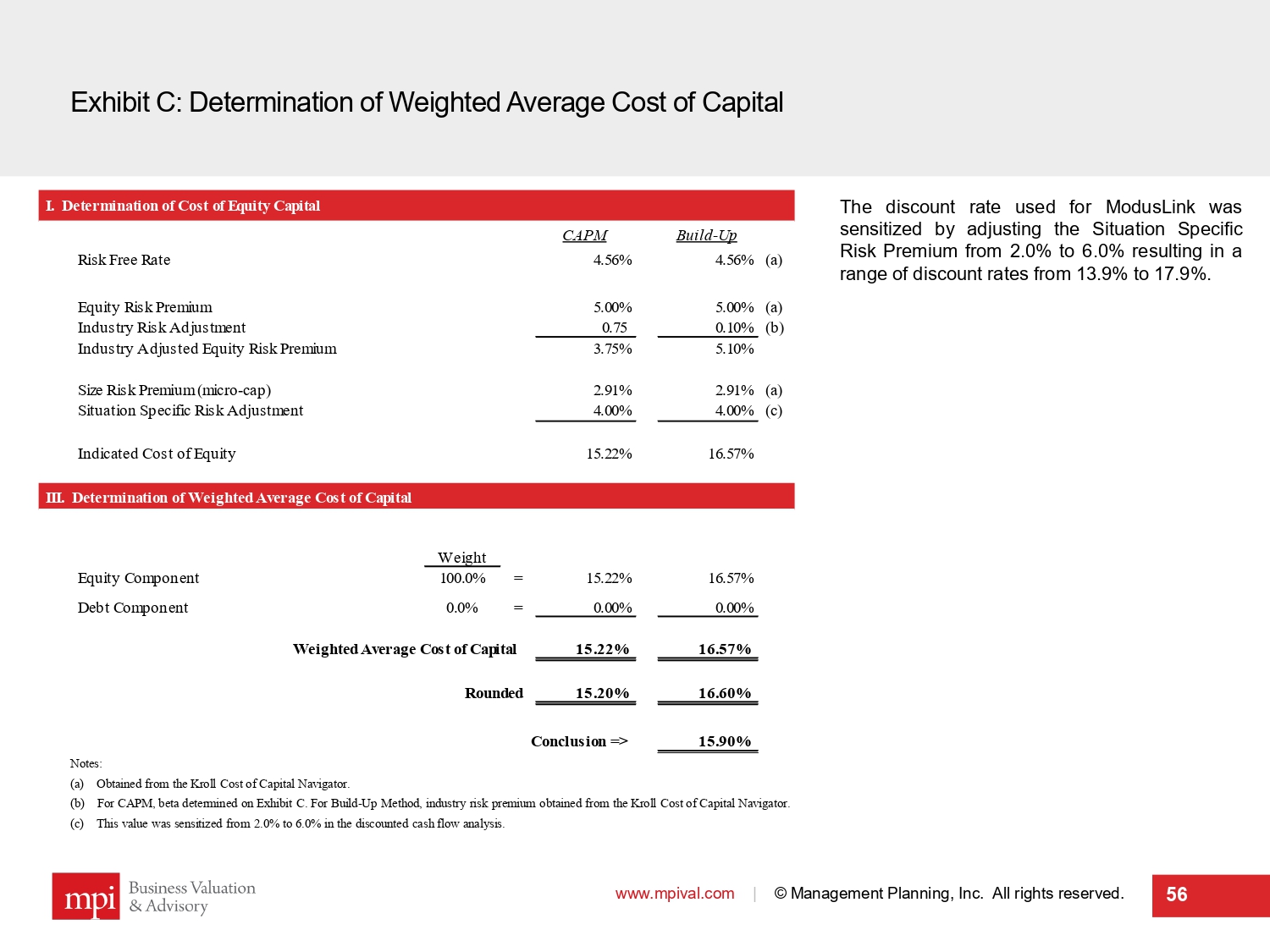 Exhibit C: Determination of Weighted Average Cost of Capital www.mpival.com | © Management Planning, Inc. All rights reserved. 56 Notes : (a) Obtained from the Kroll Cost of Capital Navigator . (b) For CAPM, beta determined on Exhibit C . For Build - Up Method, industry risk premium obtained from the Kroll Cost of Capital Navigator . (c) This value was sensitized from 2 . 0 % to 6 . 0 % in the discounted cash flow analysis . I. Determination of Cost of Equity Capital CAPM Build-Up Risk Free Rate 4.56% 4.56% (a) Equity Risk Premium 5.00% 5.00% (a) Industry Risk Adjustment 0.75 0.10% (b) Industry Adjusted Equity Risk Premium 3.75% 5.10% Size Risk Premium (micro-cap) 2.91% 2.91% (a) Situation Specific Risk Adjustment 4.00% 4.00% (c) Indicated Cost of Equity 15.22% 16.57% III. Determination of Weighted Average Cost of Capital Weight Equity Component 100.0% = 15.22% 16.57% Debt Component 0.0% = 0.00% 0.00% Weighted Average Cost of Capital 15.22% 16.57% Rounded 15.20% 16.60% Conclusion => 15.90% The discount rate used for ModusLink was sensitized by adjusting the Situation Specific Risk Premium from 2 . 0 % to 6 . 0 % resulting in a range of discount rates from 13 . 9 % to 17 . 9 % .
