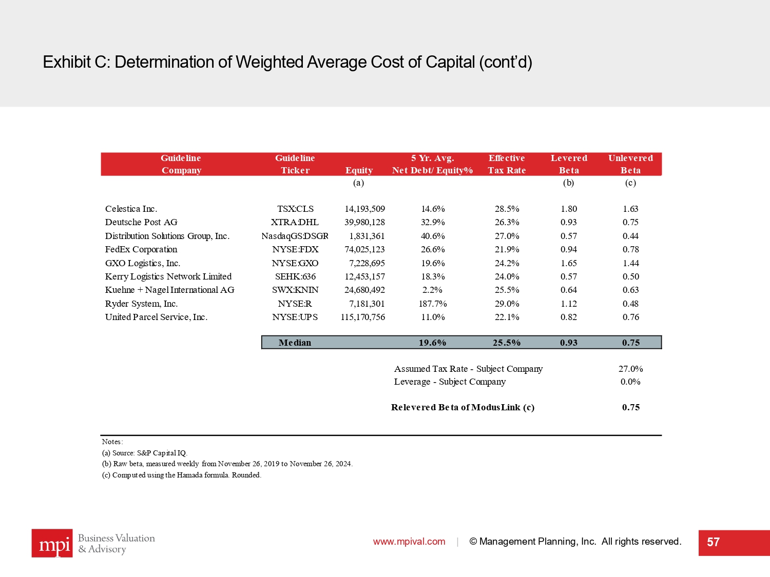 Exhibit C: Determination of Weighted Average Cost of Capital (cont’d) www.mpival.com | © Management Planning, Inc. All rights reserved. 57 Guideline Guideline 5 Yr. Avg. Effective Levered Unlevered Company Ticker Equity Net Debt/ Equity% Tax Rate Beta Beta (a) (b) (c) Celestica Inc. TSX:CLS 14,193,509 14.6% 28.5% 1.80 1.63 Deutsche Post AG XTRA:DHL 39,980,128 32.9% 26.3% 0.93 0.75 Distribution Solutions Group, Inc. NasdaqGS:DSGR 1,831,361 40.6% 27.0% 0.57 0.44 FedEx Corporation NYSE:FDX 74,025,123 26.6% 21.9% 0.94 0.78 GXO Logistics, Inc. NYSE:GXO 7,228,695 19.6% 24.2% 1.65 1.44 Kerry Logistics Network Limited SEHK:636 12,453,157 18.3% 24.0% 0.57 0.50 Kuehne + Nagel International AG SWX:KNIN 24,680,492 2.2% 25.5% 0.64 0.63 Ryder System, Inc. NYSE:R 7,181,301 187.7% 29.0% 1.12 0.48 United Parcel Service, Inc. NYSE:UPS 115,170,756 11.0% 22.1% 0.82 0.76 Median 19.6% 25.5% 0.93 0.75 Assumed Tax Rate - Subject Company 27.0% Leverage - Subject Company 0.0% Relevered Beta of ModusLink (c) 0.75 Notes: (a) Source: S&P Capital IQ. (b) Raw beta, measured weekly from November 26, 2019 to November 26, 2024. (c) Computed using the Hamada formula. Rounded.