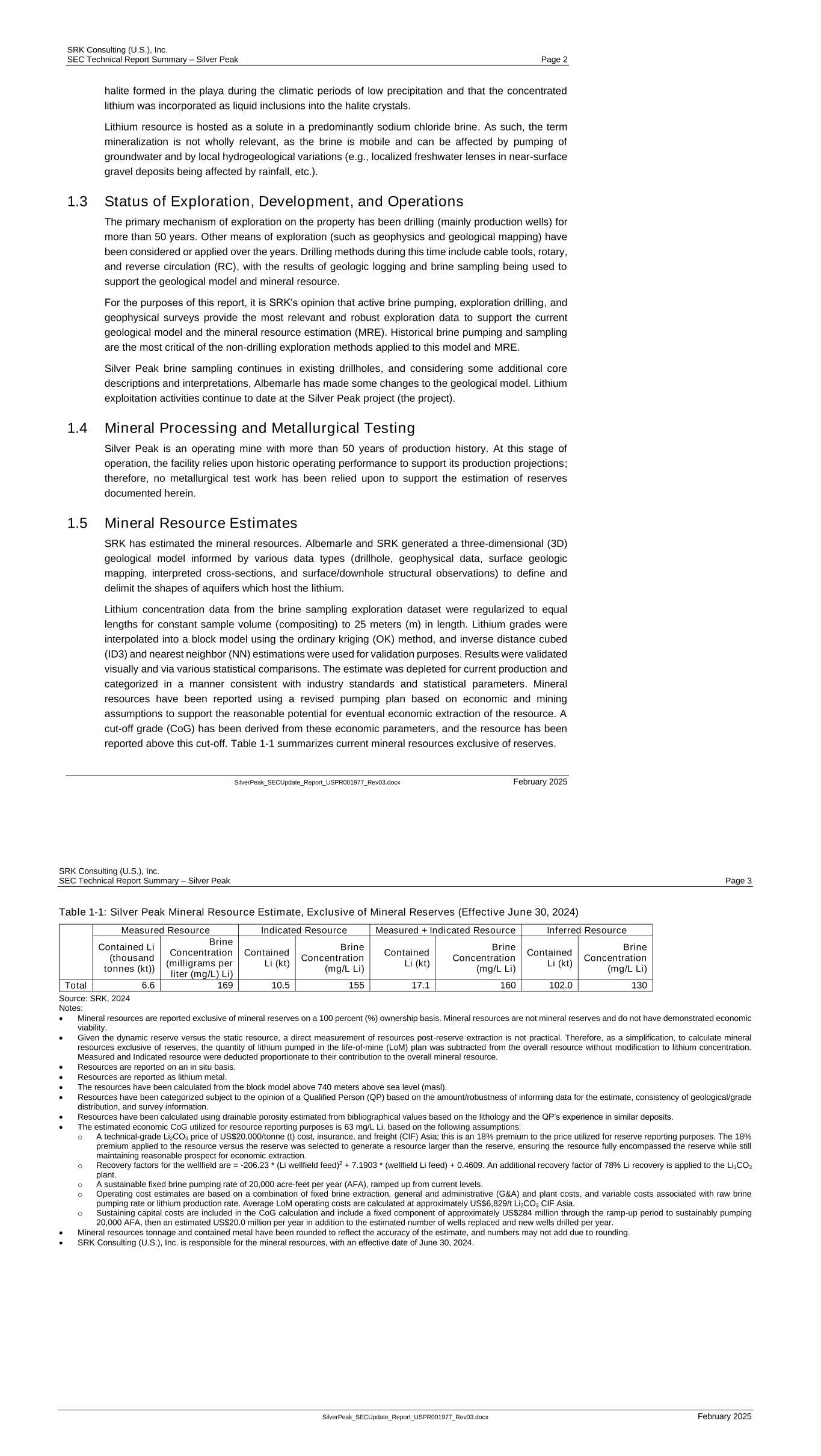 SRK Consulting (U.S.), Inc. SEC Technical Report Summary – Silver Peak Page 2 SilverPeak_SECUpdate_Report_USPR001977_Rev03.docx February 2025 halite formed in the playa during the climatic periods of low precipitation and that the concentrated lithium was incorporated as liquid inclusions into the halite crystals. Lithium resource is hosted as a solute in a predominantly sodium chloride brine. As such, the term mineralization is not wholly relevant, as the brine is mobile and can be affected by pumping of groundwater and by local hydrogeological variations (e.g., localized freshwater lenses in near-surface gravel deposits being affected by rainfall, etc.). 1.3 Status of Exploration, Development, and Operations The primary mechanism of exploration on the property has been drilling (mainly production wells) for more than 50 years. Other means of exploration (such as geophysics and geological mapping) have been considered or applied over the years. Drilling methods during this time include cable tools, rotary, and reverse circulation (RC), with the results of geologic logging and brine sampling being used to support the geological model and mineral resource. For the purposes of this report, it is SRK’s opinion that active brine pumping, exploration drilling, and geophysical surveys provide the most relevant and robust exploration data to support the current geological model and the mineral resource estimation (MRE). Historical brine pumping and sampling are the most critical of the non-drilling exploration methods applied to this model and MRE. Silver Peak brine sampling continues in existing drillholes, and considering some additional core descriptions and interpretations, Albemarle has made some changes to the geological model. Lithium exploitation activities continue to date at the Silver Peak project (the project). 1.4 Mineral Processing and Metallurgical Testing Silver Peak is an operating mine with more than 50 years of production history. At this stage of operation, the facility relies upon historic operating performance to support its production projections; therefore, no metallurgical test work has been relied upon to support the estimation of reserves documented herein. 1.5 Mineral Resource Estimates SRK has estimated the mineral resources. Albemarle and SRK generated a three-dimensional (3D) geological model informed by various data types (drillhole, geophysical data, surface geologic mapping, interpreted cross-sections, and surface/downhole structural observations) to define and delimit the shapes of aquifers which host the lithium. Lithium concentration data from the brine sampling exploration dataset were regularized to equal lengths for constant sample volume (compositing) to 25 meters (m) in length. Lithium grades were interpolated into a block model using the ordinary kriging (OK) method, and inverse distance cubed (ID3) and nearest neighbor (NN) estimations were used for validation purposes. Results were validated visually and via various statistical comparisons. The estimate was depleted for current production and categorized in a manner consistent with industry standards and statistical parameters. Mineral resources have been reported using a revised pumping plan based on economic and mining assumptions to support the reasonable potential for eventual economic extraction of the resource. A cut-off grade (CoG) has been derived from these economic parameters, and the resource has been reported above this cut-off. Table 1-1 summarizes current mineral resources exclusive of reserves. SRK Consulting (U.S.), Inc. SEC Technical Report Summary – Silver Peak Page 3 SilverPeak_SECUpdate_Report_USPR001977_Rev03.docx February 2025 Table 1-1: Silver Peak Mineral Resource Estimate, Exclusive of Mineral Reserves (Effective June 30, 2024) Measured Resource Indicated Resource Measured + Indicated Resource Inferred Resource Contained Li (thousand tonnes (kt)) Brine Concentration (milligrams per liter (mg/L) Li) Contained Li (kt) Brine Concentration (mg/L Li) Contained Li (kt) Brine Concentration (mg/L Li) Contained Li (kt) Brine Concentration (mg/L Li) Total 6.6 169 10.5 155 17.1 160 102.0 130 Source: SRK, 2024 Notes: • Mineral resources are reported exclusive of mineral reserves on a 100 percent (%) ownership basis. Mineral resources are not mineral reserves and do not have demonstrated economic viability. • Given the dynamic reserve versus the static resource, a direct measurement of resources post-reserve extraction is not practical. Therefore, as a simplification, to calculate mineral resources exclusive of reserves, the quantity of lithium pumped in the life-of-mine (LoM) plan was subtracted from the overall resource without modification to lithium concentration. Measured and Indicated resource were deducted proportionate to their contribution to the overall mineral resource. • Resources are reported on an in situ basis. • Resources are reported as lithium metal. • The resources have been calculated from the block model above 740 meters above sea level (masl). • Resources have been categorized subject to the opinion of a Qualified Person (QP) based on the amount/robustness of informing data for the estimate, consistency of geological/grade distribution, and survey information. • Resources have been calculated using drainable porosity estimated from bibliographical values based on the lithology and the QP’s experience in similar deposits. • The estimated economic CoG utilized for resource reporting purposes is 63 mg/L Li, based on the following assumptions: o A technical-grade Li2CO3 price of US$20,000/tonne (t) cost, insurance, and freight (CIF) Asia; this is an 18% premium to the price utilized for reserve reporting purposes. The 18% premium applied to the resource versus the reserve was selected to generate a resource larger than the reserve, ensuring the resource fully encompassed the reserve while still maintaining reasonable prospect for economic extracti