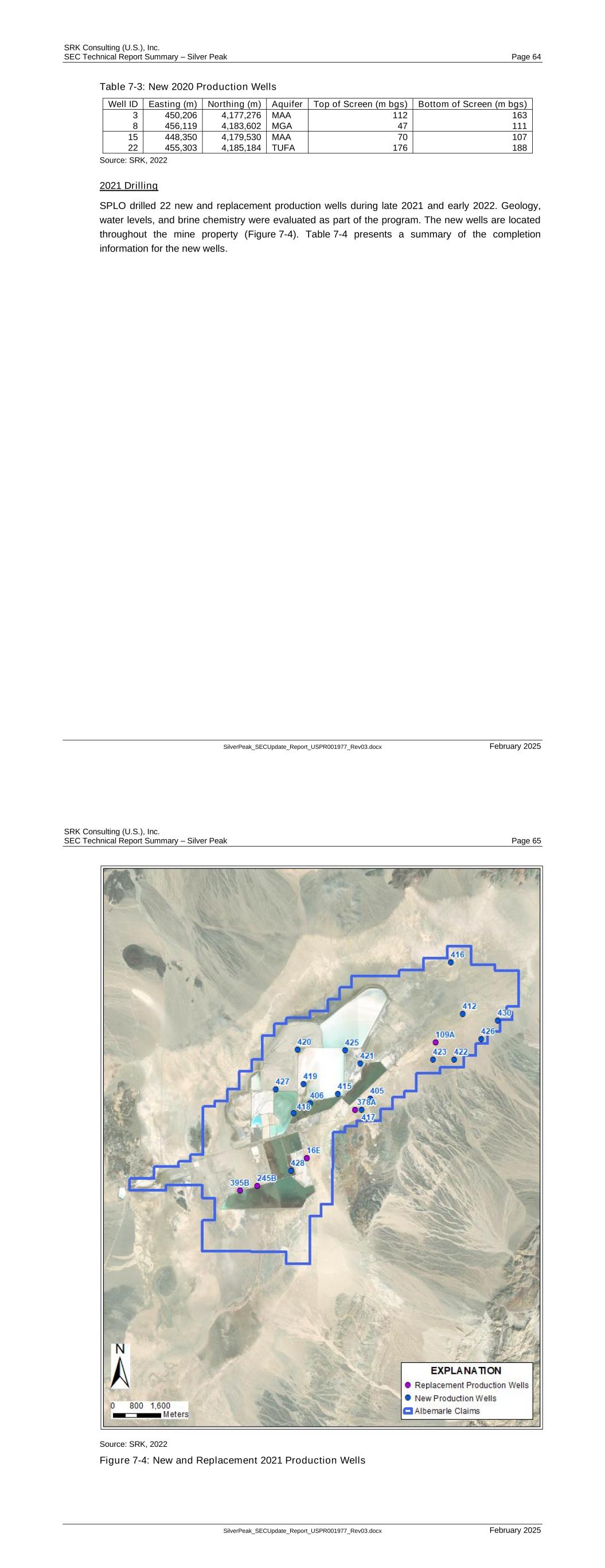 SRK Consulting (U.S.), Inc. SEC Technical Report Summary – Silver Peak Page 64 SilverPeak_SECUpdate_Report_USPR001977_Rev03.docx February 2025 Table 7-3: New 2020 Production Wells Well ID Easting (m) Northing (m) Aquifer Top of Screen (m bgs) Bottom of Screen (m bgs) 3 450,206 4,177,276 MAA 112 163 8 456,119 4,183,602 MGA 47 111 15 448,350 4,179,530 MAA 70 107 22 455,303 4,185,184 TUFA 176 188 Source: SRK, 2022 2021 Drilling SPLO drilled 22 new and replacement production wells during late 2021 and early 2022. Geology, water levels, and brine chemistry were evaluated as part of the program. The new wells are located throughout the mine property (Figure 7-4). Table 7-4 presents a summary of the completion information for the new wells. SRK Consulting (U.S.), Inc. SEC Technical Report Summary – Silver Peak Page 65 SilverPeak_SECUpdate_Report_USPR001977_Rev03.docx February 2025 Source: SRK, 2022 Figure 7-4: New and Replacement 2021 Production Wells