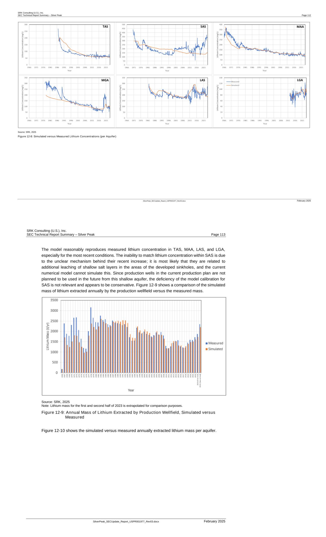 SRK Consulting (U.S.), Inc. SEC Technical Report Summary – Silver Peak Page 112 SilverPeak_SECUpdate_Report_USPR001977_Rev03.docx February 2025 Source: SRK, 2025 Figure 12-8: Simulated versus Measured Lithium Concentrations (per Aquifer) SRK Consulting (U.S.), Inc. SEC Technical Report Summary – Silver Peak Page 113 SilverPeak_SECUpdate_Report_USPR001977_Rev03.docx February 2025 The model reasonably reproduces measured lithium concentration in TAS, MAA, LAS, and LGA, especially for the most recent conditions. The inability to match lithium concentration within SAS is due to the unclear mechanism behind their recent increase; it is most likely that they are related to additional leaching of shallow salt layers in the areas of the developed sinkholes, and the current numerical model cannot simulate this. Since production wells in the current production plan are not planned to be used in the future from this shallow aquifer, the deficiency of the model calibration for SAS is not relevant and appears to be conservative. Figure 12-9 shows a comparison of the simulated mass of lithium extracted annually by the production wellfield versus the measured mass. Source: SRK, 2025 Note: Lithium mass for the first and second half of 2023 is extrapolated for comparison purposes. Figure 12-9: Annual Mass of Lithium Extracted by Production Wellfield, Simulated versus Measured Figure 12-10 shows the simulated versus measured annually extracted lithium mass per aquifer.