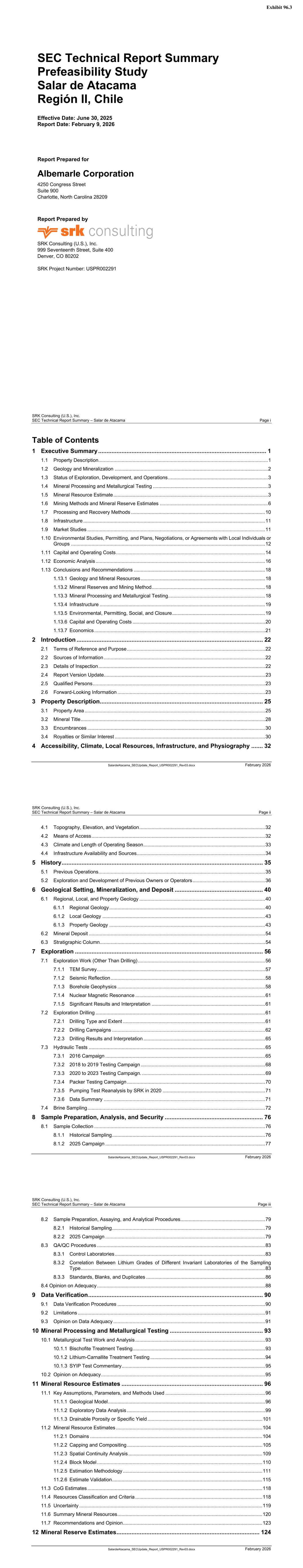SEC Technical Report Summary Prefeasibility Study Salar de Atacama Región II, Chile Effective Date: June 30, 2025 Report Date: February 9, 2026 Report Prepared for Albemarle Corporation 4250 Congress Street Suite 900 Charlotte, North Carolina 28209 Report Prepared by SRK Consulting (U.S.), Inc. 999 Seventeenth Street, Suite 400 Denver, CO 80202 SRK Project Number: USPR002291 Exhibit 96.3 SRK Consulting (U.S.), Inc. SEC Technical Report Summary – Salar de Atacama Page i SalardeAtacama_SECUpdate_Report_USPR002291_Rev03.docx February 2026 Table of Contents 1 Executive Summary ..................................................................................................... 1 1.1 Property Description ............................................................................................................................ 1 1.2 Geology and Mineralization ................................................................................................................ 2 1.3 Status of Exploration, Development, and Operations ......................................................................... 3 1.4 Mineral Processing and Metallurgical Testing .................................................................................... 3 1.5 Mineral Resource Estimate ................................................................................................................. 3 1.6 Mining Methods and Mineral Reserve Estimates ............................................................................... 6 1.7 Processing and Recovery Methods .................................................................................................. 10 1.8 Infrastructure ..................................................................................................................................... 11 1.9 Market Studies .................................................................................................................................. 11 1.10 Environmental Studies, Permitting, and Plans, Negotiations, or Agreements with Local Individuals or Groups .............................................................................................................................................. 12 1.11 Capital and Operating Costs ............................................................................................................. 14 1.12 Economic Analysis ............................................................................................................................ 16 1.13 Conclusions and Recommendations ................................................................................................ 18 1.13.1 Geology and Mineral Resources ........................................................................................... 18 1.13.2 Mineral Reserves and Mining Method ................................................................................... 18 1.13.3 Mineral Processing and Metallurgical Testing ....................................................................... 18 1.13.4 Infrastructure ......................................................................................................................... 19 1.13.5 Environmental, Permitting, Social, and Closure .................................................................... 19 1.13.6 Capital and Operating Costs ................................................................................................. 20 1.13.7 Economics ............................................................................................................................. 21 2 Introduction ................................................................................................................ 22 2.1 Terms of Reference and Purpose ..................................................................................................... 22 2.2 Sources of Information ...................................................................................................................... 22 2.3 Details of Inspection .......................................................................................................................... 22 2.4 Report Version Update ...................................................................................................................... 23 2.5 Qualified Persons .............................................................................................................................. 23 2.6 Forward-Looking Information ............................................................................................................ 23 3 Property Description .................................................................................................. 25 3.1 Property Area .................................................................................................................................... 25 3.2 Mineral Title ....................................................................................................................................... 28 3.3 Encumbrances .................................................................................................................................. 30 3.4 Royalties or Similar Interest .............................................................................................................. 30 4 Accessibility, Climate, Local Resources, Infrastructure, and Physiography ....... 32 SRK Consulting (U.S.), Inc. SEC Technical Report Summary – Salar de Atacama Page ii SalardeAtacama_SECUpdate_Report_USPR002291_Rev03.docx February 2026 4.1 Topography, Elevation, and Vegetation ............................................................................................ 32 4.2 Means of Access ............................................................................................................................... 32 4.3 Climate and Length of Operating Season .................................................................