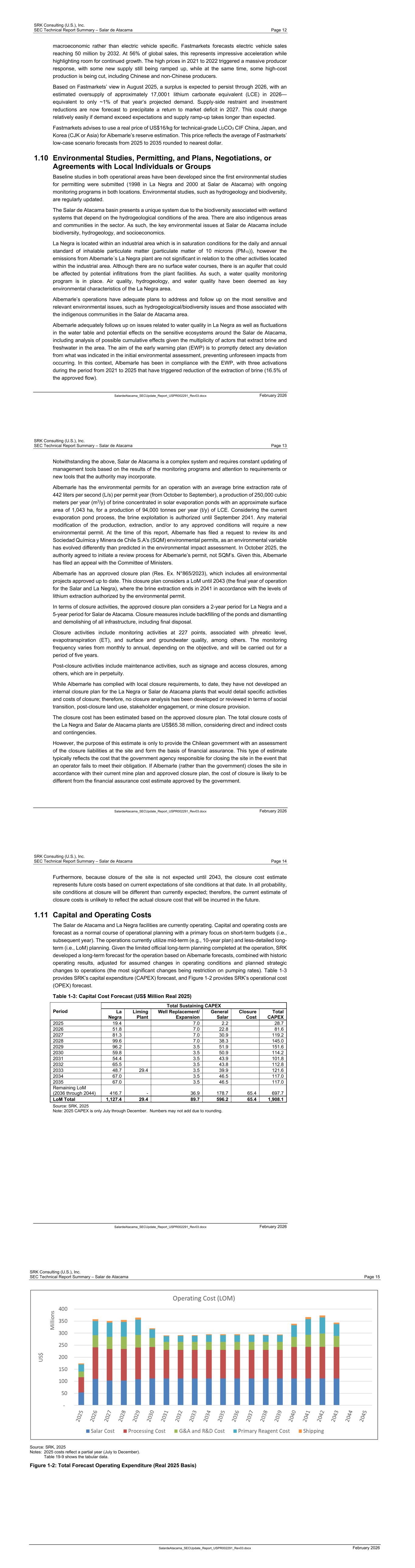 SRK Consulting (U.S.), Inc. SEC Technical Report Summary – Salar de Atacama Page 256 SalardeAtacama_SECUpdate_Report_USPR002291_Rev03.docx February 2026 SRK reviewed the Albemarle forward-looking 10-year forecast and then developed a life-of-project forecast based on the continuation of the operation. Based on Albemarle’s mid-range forecasts, SRK has assumed a long-term average of approximately US$35.9 million per operating year in sustaining CAPEX at the Salar, inclusive of well replacement. Deducting the well replacement costs results in a non-well replacement average CAPEX of around US$29.8 million per year at the Salar. At La Negra, SRK has assumed an additional US$52.1 million per operating year for years after the 10-year forecast based on mid-range forecasts. Table 18-1 presents capital estimates for the next 10 years and the life of the reserve. Total capital costs over this period (July 2025 to December 2044) are estimated at US$1.9 billion in 2025 real dollars. Table 18-1: Capital Cost Forecast ($M Real 2025) Total Sustaining CAPEX Period La Negra Liming Plant Well Replacement/ Expansion General Salar Closure Cost Total CAPEX 2025 19.4 7.0 2.2 28.7 2026 51.8 7.0 22.8 81.6 2027 81.3 7.0 30.9 119.2 2028 99.6 7.0 38.3 145.0 2029 96.2 3.5 51.9 151.6 2030 59.8 3.5 50.9 114.2 2031 54.4 3.5 43.9 101.8 2032 65.5 3.5 43.8 112.8 2033 48.7 29.4 3.5 39.9 121.6 2034 67.0 3.5 46.5 117.0 2035 67.0 3.5 46.5 117.0 Remaining LoM (2036 through 2044) 416.7 - 36.9 178.7 65.4 697.7 LoM Total 1,127.4 29.4 89.7 596.2 65.4 1,908.1 Source: SRK, 2025 Note: 2025 CAPEX is only July through December. 18.2 Operating Cost Estimates Operating costs are site specific (e.g., they do not include corporate overheads, although there are overheads for Albemarle Chile). Note that for internal reporting purposes, Albemarle allocates brine production costs to the year the brine is processed (i.e., an approximate 24-month delay from the actual cost being incurred). SRK developed a cost model to reflect future production costs based on existing available cost models. To develop this cost forecast, SRK worked with site personnel (including reviewing unofficial forecasts) and developed a simplified operating cost model based on fixed and variable costs, adjusted for changes in operations, as appropriate. SRK notes that in some cases, the existing cost forecasts contained planned improvements or efficiency gains as a result of internal processes. In some cases, SRK has excluded the impact of these exercises, as the impact is not certain. In evaluating the historic costs and discussing the cost profile with Albemarle, the majority of the Salar de Atacama/La Negra costs are fixed. However, there are material changes planned for the operation that may affect the cost basis for the operation. These changes include the following: Pumping rate restrictions SRK Consulting (U.S.), Inc. SEC Technical Report Summary – Salar de Atacama Page 257 SalardeAtacama_SECUpdate_Report_USPR002291_Rev03.docx February 2026 Water supply restrictions Brine, water, and waste transport optimization Likely long-term requirement to add a liming plant at the Salar For the reduced pumping portion of the mine plan, electricity, natural gas, and water consumption were adjusted for La Negra. All other fixed costs were maintained at full operational levels to ensure that the facility can ramp up at the end of pumping restrictions. Fixed operating costs at the Salar and the La Negra facility are expected to average US$110.1 million and US$125.2 million per year, respectively. Beyond fixed costs, SRK also applied variable unit costs to a range of cost inputs, including the following: Raw materials: o Soda ash (modeled individually) o Lime (modeled individually) o HCl (modeled individually) o Shipping (modeled individually) For key raw materials (including soda ash, lime, HCl and packaging) and shipping, SRK individually applied unit consumption based on expected rates. Actual and short-range forecast expenditures based on expected pricing and unit consumption rates were provided by Albemarle for soda ash, lime, HCl, and brine transport and packaging. Shipping costs are estimated utilizing freight indices. Table 18-2 presents unit consumption and costs for these items. Table 18-2: Key Assumptions, Variable Cost Model Item Consumption Rate (t/t LCE) Unit Cost (US$/t) 2025 2026+ 2025 2026+ Soda ash 2.32 2.15 284.54 284.54 Lime 0.27 0.26 266.69 263.17 HCl 0.41 0.42 383.88 375.00 Shipping 1 1 104.00 104.00 Source: SRK, 2025 Note: The reported lime consumption is applicable to La Negra operations in the long term. With the assumed requirement to add liming at the Salar, the assumed consumption rate increases. As seen in Table 18-2, soda ash is the most important component of these key variable costs. Albemarle provided the long-term price assumption for soda ash, but SRK also tested the sensitivity of the Project economics to soda ash consumption, as described in Section 18. Based on this operating cost model, Figure 18-1 shows the total annual forecast operating costs for the Salar de Atacama/La Negra operations. SRK Consulting (U.S.), Inc. SEC Technical Report Summary – Salar de Atacama Page 258 SalardeAtacama_SECUpdate_Report_USPR002291_Rev03.docx February 2026 Source: SRK, 2025 Note: 2025 costs reflect 2 partial year (July to December). Figure 18-1: Total Forecast OPEX (Real 2025 Basis) SRK Consulting (U.S.), Inc. SEC Technical Report Summary – Salar de Atacama Page 259 SalardeAtacama_SECUpdate_Report_USPR002291_Rev03.docx February 2026 19 Economic Analysis As with the capital and operating cost forecasts, the economic analysis is inherently a forward-looking exercise. These estimates rely upon a range of assumptions and forecasts that are subject to change depending upon macroeconomic conditions, operating strategy, and new data collected through future operations. SRK has not included the production of byproduct streams in this analysis. However, the