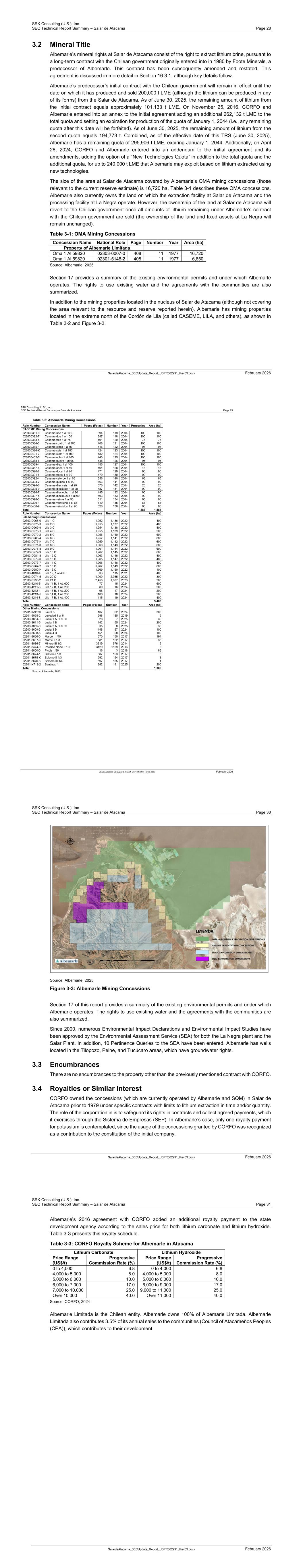 SRK Consulting (U.S.), Inc. SEC Technical Report Summary – Salar de Atacama Page 28 SalardeAtacama_SECUpdate_Report_USPR002291_Rev03.docx February 2026 3.2 Mineral Title Albemarle’s mineral rights at Salar de Atacama consist of the right to extract lithium brine, pursuant to a long-term contract with the Chilean government originally entered into in 1980 by Foote Minerals, a predecessor of Albemarle. This contract has been subsequently amended and restated. This agreement is discussed in more detail in Section 16.3.1, although key details follow. Albemarle’s predecessor’s initial contract with the Chilean government will remain in effect until the date on which it has produced and sold 200,000 t LME (although the lithium can be produced in any of its forms) from the Salar de Atacama. As of June 30, 2025, the remaining amount of lithium from the initial contract equals approximately 101,133 t LME. On November 25, 2016, CORFO and Albemarle entered into an annex to the initial agreement adding an additional 262,132 t LME to the total quota and setting an expiration for production of the quota of January 1, 2044 (i.e., any remaining quota after this date will be forfeited). As of June 30, 2025, the remaining amount of lithium from the second quota equals 194,773 t. Combined, as of the effective date of this TRS (June 30, 2025), Albemarle has a remaining quota of 295,906 t LME, expiring January 1, 2044. Additionally, on April 26, 2024, CORFO and Albemarle entered into an addendum to the initial agreement and its amendments, adding the option of a “New Technologies Quota” in addition to the total quota and the additional quota, for up to 240,000 t LME that Albemarle may exploit based on lithium extracted using new technologies. The size of the area at Salar de Atacama covered by Albemarle’s OMA mining concessions (those relevant to the current reserve estimate) is 16,720 ha. Table 3-1 describes these OMA concessions. Albemarle also currently owns the land on which the extraction facility at Salar de Atacama and the processing facility at La Negra operate. However, the ownership of the land at Salar de Atacama will revert to the Chilean government once all amounts of lithium remaining under Albemarle’s contract with the Chilean government are sold (the ownership of the land and fixed assets at La Negra will remain unchanged). Table 3-1: OMA Mining Concessions Concession Name National Role Page Number Year Area (ha) Property of Albemarle Limitada Oma 1 Al 59820 02303-0007-0 408 11 1977 16,720 Oma 1 Al 59820 02301-5148-2 408 11 1977 6,850 Source: Albemarle, 2025 Section 17 provides a summary of the existing environmental permits and under which Albemarle operates. The rights to use existing water and the agreements with the communities are also summarized. In addition to the mining properties located in the nucleus of Salar de Atacama (although not covering the area relevant to the resource and reserve reported herein), Albemarle has mining properties located in the extreme north of the Cordón de Lila (called CASEME, LILA, and others), as shown in Table 3-2 and Figure 3-3. SRK Consulting (U.S.), Inc. SEC Technical Report Summary – Salar de Atacama Page 29 SalardeAtacama_SECUpdate_Report_USPR002291_Rev03.docx February 2026 Table 3-2: Albemarle Mining Concessions Source: Albemarle, 2025 Role Number Concession Name Pages (Fojas) Number Year Properties Area (ha) CASEME Mining Concessions 023030381-9 Caseme uno 1 al 100 394 119 2004 100 100 023030382-7 Caseme dos 1 al 100 387 118 2004 100 100 023030383-5 Caseme tres 1 al 75 401 120 2004 75 75 023030384-3 Caseme cuatro 1 al 100 408 121 2004 100 100 023030385-1 Caseme cinco 1 al 97 416 122 2004 97 97 023030386-K Caseme seis 1 al 100 424 123 2004 100 100 023030401-7 Caseme siete 1 al 100 432 124 2004 100 100 023030402-5 Caseme ocho 1 al 100 440 125 2004 100 100 023030388-6 Caseme nueve 1 al 95 448 126 2004 95 95 023030389-4 Caseme diez 1 al 100 456 127 2004 100 100 023030387-8 Caseme once 1 al 46 464 128 2004 46 46 023030390-8 Caseme doce 1 al 90 471 129 2004 90 90 023030391-6 Caseme trece 1 al 90 479 130 2004 90 90 023030392-4 Caseme catorce 1 al 65 556 140 2004 65 65 023030393-2 Caseme quince 1 al 90 563 141 2004 90 90 023030394-0 Caseme dieciseis 1 al 20 570 142 2004 20 20 023030395-9 Caseme diecisiete 1 al 90 487 131 2004 90 90 023030396-7 Caseme dieciocho 1 al 90 495 132 2004 90 90 023030397-5 Caseme diecinueve 1 al 90 503 133 2004 90 90 023030398-3 Caseme veinte 1 al 90 511 134 2004 90 90 023030399-1 Caseme veintiuno 1 al 65 519 135 2004 65 65 023030400-9 Caseme veintidos 1 al 90 526 136 2004 90 90 Total 1,883 1,883 Role Number Concession Name Pages (Fojas) Number Year Area (ha) Lila Mining Concessions 02303-D968-0 Lila 1 C 1,952 1,136 2022 400 02303-D975-3 Lila 2 C 1,953 1,137 2022 400 02303-D969-9 Lila 3 C 1,954 1,138 2022 400 02303-D976-1 Lila 4 C 1,955 1,139 2022 200 02303-D970-2 Lila 5 C 1,956 1,140 2022 600 02303-D966-4 Lila 6 C 1,957 1,141 2022 600 02303-D977-K Lila 7 C 1,959 1,142 2022 600 02303-D971-0 Lila 8 C 1,960 1,143 2022 600 02303-D978-8 Lila 9 C 1,961 1,144 2022 600 02303-D972-9 Lila 10 C 1,962 1,145 2022 600 02303-D981-8 Lila 12 C 1,963 1,146 2022 400 02303-D979-6 Lila 13 C 1,965 1,147 2022 400 02303-D973-7 Lila 14 C 1,966 1,148 2022 400 02303-D967-2 Lila 15 C 1,967 1,149 2022 600 02303-D980-K Lila 16 C 1,969 1,150 2022 100 02303-4040-4 Lila 19, 1 al 400 633 115 2021 400 02303-D974-5 Lila 20 C 4,900 2,935 2022 300 02303-E598-2 Lila 21 C 2,456 1,607 2023 200 02303-4210-5 Lila 11 B, 1 AL 600 77 15 2024 600 02303-4211-3 Lila 12 B, 1 AL 200 89 16 2024 200 02303-4212-1 Lila 13 B, 1 AL 200 98 17 2024 200 02303-4213-K Lila 14 B, 1 AL 200 106 18 2024 200 02303-4214-8 Lila 17 B, 1 AL 400 115 19 2024 400 Total 9,400 Role Number Concession name Pages (Fojas) Number Year Area (ha) Other Mining Concessions 02201-W9520 Laura 3 107 62 2024 300 02201-9055-2 Levedad 1 al 6 598 185 2019 6 02203-1854-0 Lucia 1 A, 1 al 30 28 7 2025 