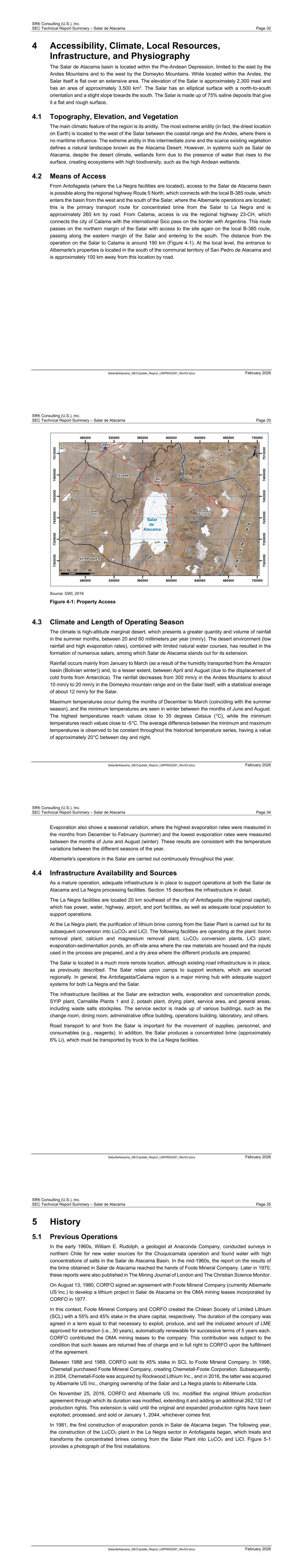 SRK Consulting (U.S.), Inc. SEC Technical Report Summary – Salar de Atacama Page 32 SalardeAtacama_SECUpdate_Report_USPR002291_Rev03.docx February 2026 4 Accessibility, Climate, Local Resources, Infrastructure, and Physiography The Salar de Atacama basin is located within the Pre-Andean Depression, limited to the east by the Andes Mountains and to the west by the Domeyko Mountains. While located within the Andes, the Salar itself is flat over an extensive area. The elevation of the Salar is approximately 2,300 masl and has an area of approximately 3,500 km2. The Salar has an elliptical surface with a north-to-south orientation and a slight slope towards the south. The Salar is made up of 75% saline deposits that give it a flat and rough surface. 4.1 Topography, Elevation, and Vegetation The main climatic feature of the region is its aridity. The most extreme aridity (in fact, the driest location on Earth) is located to the west of the Salar between the coastal range and the Andes, where there is no maritime influence. The extreme aridity in this intermediate zone and the scarce existing vegetation defines a natural landscape known as the Atacama Desert. However, in systems such as Salar de Atacama, despite the desert climate, wetlands form due to the presence of water that rises to the surface, creating ecosystems with high biodiversity, such as the high Andean wetlands. 4.2 Means of Access From Antofagasta (where the La Negra facilities are located), access to the Salar de Atacama basin is possible along the regional highway Route 5 North, which connects with the local B-385 route, which enters the basin from the west and the south of the Salar, where the Albemarle operations are located; this is the primary transport route for concentrated brine from the Salar to La Negra and is approximately 260 km by road. From Calama, access is via the regional highway 23-CH, which connects the city of Calama with the international Sico pass on the border with Argentina. This route passes on the northern margin of the Salar with access to the site again on the local B-385 route, passing along the eastern margin of the Salar and entering to the south. The distance from the operation on the Salar to Calama is around 190 km (Figure 4-1). At the local level, the entrance to Albemarle's properties is located in the south of the communal territory of San Pedro de Atacama and is approximately 100 km away from this location by road. SRK Consulting (U.S.), Inc. SEC Technical Report Summary – Salar de Atacama Page 33 SalardeAtacama_SECUpdate_Report_USPR002291_Rev03.docx February 2026 Source: GWI, 2019 Figure 4-1: Property Access 4.3 Climate and Length of Operating Season The climate is high-altitude marginal desert, which presents a greater quantity and volume of rainfall in the summer months, between 20 and 60 millimeters per year (mm/y). The desert environment (low rainfall and high evaporation rates), combined with limited natural water courses, has resulted in the formation of numerous salars, among which Salar de Atacama stands out for its extension. Rainfall occurs mainly from January to March (as a result of the humidity transported from the Amazon basin (Bolivian winter)) and, to a lesser extent, between April and August (due to the displacement of cold fronts from Antarctica). The rainfall decreases from 300 mm/y in the Andes Mountains to about 10 mm/y to 20 mm/y in the Domeyko mountain range and on the Salar itself, with a statistical average of about 12 mm/y for the Salar. Maximum temperatures occur during the months of December to March (coinciding with the summer season), and the minimum temperatures are seen in winter between the months of June and August. The highest temperatures reach values close to 35 degrees Celsius (°C), while the minimum temperatures reach values close to -5°C. The average difference between the minimum and maximum temperatures is observed to be constant throughout the historical temperature series, having a value of approximately 20°C between day and night. SRK Consulting (U.S.), Inc. SEC Technical Report Summary – Salar de Atacama Page 34 SalardeAtacama_SECUpdate_Report_USPR002291_Rev03.docx February 2026 Evaporation also shows a seasonal variation, where the highest evaporation rates were measured in the months from December to February (summer) and the lowest evaporation rates were measured between the months of June and August (winter). These results are consistent with the temperature variations between the different seasons of the year. Albemarle's operations in the Salar are carried out continuously throughout the year. 4.4 Infrastructure Availability and Sources As a mature operation, adequate infrastructure is in place to support operations at both the Salar de Atacama and La Negra processing facilities. Section 15 describes the infrastructure in detail. The La Negra facilities are located 20 km southeast of the city of Antofagasta (the regional capital), which has power, water, highway, airport, and port facilities, as well as adequate local population to support operations. At the La Negra plant, the purification of lithium brine coming from the Salar Plant is carried out for its subsequent conversion into Li2CO3 and LiCl. The following facilities are operating at the plant: boron removal plant, calcium and magnesium removal plant, Li2CO3 conversion plants, LiCl plant, evaporation-sedimentation ponds, an off-site area where the raw materials are housed and the inputs used in the process are prepared, and a dry area where the different products are prepared. The Salar is located in a much more remote location, although existing road infrastructure is in place, as previously described. The Salar relies upon camps to support workers, which are sourced regionally. In general, the Antofagasta/Calama region is a major mining hub with adequate support systems for both La Negra and the Salar. The infrastructure facilities at the Salar are extraction wells, ev