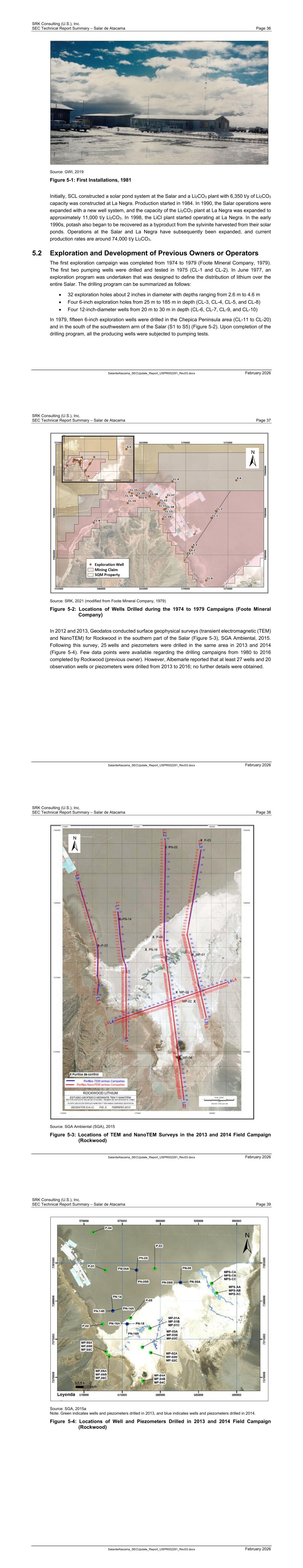SRK Consulting (U.S.), Inc. SEC Technical Report Summary – Salar de Atacama Page 36 SalardeAtacama_SECUpdate_Report_USPR002291_Rev03.docx February 2026 Source: GWI, 2019 Figure 5-1: First Installations, 1981 Initially, SCL constructed a solar pond system at the Salar and a Li2CO3 plant with 6,350 t/y of Li2CO3 capacity was constructed at La Negra. Production started in 1984. In 1990, the Salar operations were expanded with a new well system, and the capacity of the Li2CO3 plant at La Negra was expanded to approximately 11,000 t/y Li2CO3. In 1998, the LiCl plant started operating at La Negra. In the early 1990s, potash also began to be recovered as a byproduct from the sylvinite harvested from their solar ponds. Operations at the Salar and La Negra have subsequently been expanded, and current production rates are around 74,000 t/y Li2CO3. 5.2 Exploration and Development of Previous Owners or Operators The first exploration campaign was completed from 1974 to 1979 (Foote Mineral Company, 1979). The first two pumping wells were drilled and tested in 1975 (CL-1 and CL-2). In June 1977, an exploration program was undertaken that was designed to define the distribution of lithium over the entire Salar. The drilling program can be summarized as follows: 32 exploration holes about 2 inches in diameter with depths ranging from 2.6 m to 4.6 m Four 6-inch exploration holes from 25 m to 185 m in depth (CL-3, CL-4, CL-5, and CL-8) Four 12-inch-diameter wells from 20 m to 30 m in depth (CL-6, CL-7, CL-9, and CL-10) In 1979, fifteen 6-inch exploration wells were drilled in the Chepica Peninsula area (CL-11 to CL-20) and in the south of the southwestern arm of the Salar (S1 to S5) (Figure 5-2). Upon completion of the drilling program, all the producing wells were subjected to pumping tests. SRK Consulting (U.S.), Inc. SEC Technical Report Summary – Salar de Atacama Page 37 SalardeAtacama_SECUpdate_Report_USPR002291_Rev03.docx February 2026 Source: SRK, 2021 (modified from Foote Mineral Company, 1979) Figure 5-2: Locations of Wells Drilled during the 1974 to 1979 Campaigns (Foote Mineral Company) In 2012 and 2013, Geodatos conducted surface geophysical surveys (transient electromagnetic (TEM) and NanoTEM) for Rockwood in the southern part of the Salar (Figure 5-3), SGA Ambiental, 2015. Following this survey, 25 wells and piezometers were drilled in the same area in 2013 and 2014 (Figure 5-4). Few data points were available regarding the drilling campaigns from 1980 to 2016 completed by Rockwood (previous owner). However, Albemarle reported that at least 27 wells and 20 observation wells or piezometers were drilled from 2013 to 2016; no further details were obtained. SRK Consulting (U.S.), Inc. SEC Technical Report Summary – Salar de Atacama Page 38 SalardeAtacama_SECUpdate_Report_USPR002291_Rev03.docx February 2026 Source: SGA Ambiental (SGA), 2015 Figure 5-3: Locations of TEM and NanoTEM Surveys in the 2013 and 2014 Field Campaign (Rockwood) SRK Consulting (U.S.), Inc. SEC Technical Report Summary – Salar de Atacama Page 39 SalardeAtacama_SECUpdate_Report_USPR002291_Rev03.docx February 2026 Source: SGA, 2015a Note: Green indicates wells and piezometers drilled in 2013, and blue indicates wells and piezometers drilled in 2014. Figure 5-4: Locations of Well and Piezometers Drilled in 2013 and 2014 Field Campaign (Rockwood)