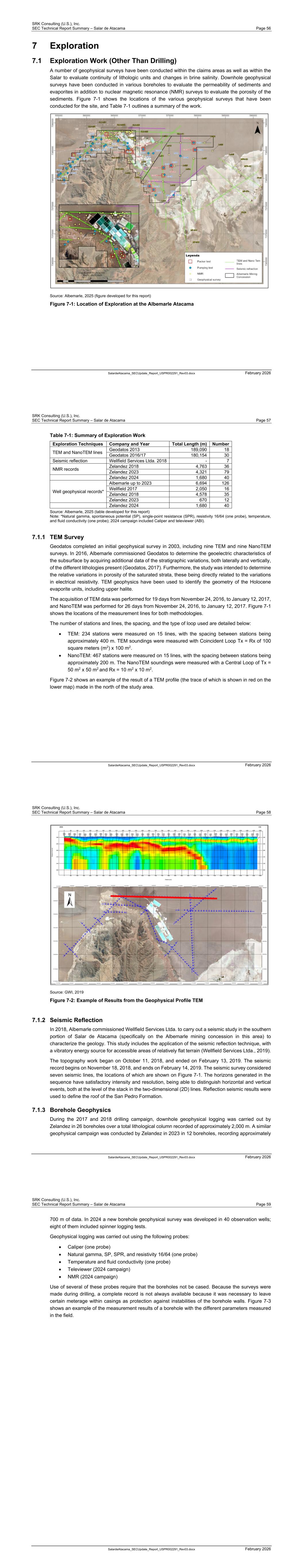 SRK Consulting (U.S.), Inc. SEC Technical Report Summary – Salar de Atacama Page 56 SalardeAtacama_SECUpdate_Report_USPR002291_Rev03.docx February 2026 7 Exploration 7.1 Exploration Work (Other Than Drilling) A number of geophysical surveys have been conducted within the claims areas as well as within the Salar to evaluate continuity of lithologic units and changes in brine salinity. Downhole geophysical surveys have been conducted in various boreholes to evaluate the permeability of sediments and evaporites in addition to nuclear magnetic resonance (NMR) surveys to evaluate the porosity of the sediments. Figure 7-1 shows the locations of the various geophysical surveys that have been conducted for the site, and Table 7-1 outlines a summary of the work. Source: Albemarle, 2025 (figure developed for this report) Figure 7-1: Location of Exploration at the Albemarle Atacama SRK Consulting (U.S.), Inc. SEC Technical Report Summary – Salar de Atacama Page 57 SalardeAtacama_SECUpdate_Report_USPR002291_Rev03.docx February 2026 Table 7-1: Summary of Exploration Work Exploration Techniques Company and Year Total Length (m) Number TEM and NanoTEM lines Geodatos 2013 189,090 18 Geodatos 2016/17 180,154 30 Seismic reflection Wellfield Services Ltda. 2018 - 7 NMR records Zelandez 2018 4,763 36 Zelandez 2023 4,321 79 Zelandez 2024 1,680 40 Well geophysical records* Albemarle up to 2023 6,694 126 Wellfield 2017 2,050 16 Zelandez 2018 4,578 35 Zelandez 2023 670 12 Zelandez 2024 1,680 40 Source: Albemarle, 2025 (table developed for this report) Note: *Natural gamma, spontaneous potential (SP), single-point resistance (SPR), resistivity 16/64 (one probe), temperature, and fluid conductivity (one probe); 2024 campaign included Caliper and televiewer (ABI). 7.1.1 TEM Survey Geodatos completed an initial geophysical survey in 2003, including nine TEM and nine NanoTEM surveys. In 2016, Albemarle commissioned Geodatos to determine the geoelectric characteristics of the subsurface by acquiring additional data of the stratigraphic variations, both laterally and vertically, of the different lithologies present (Geodatos, 2017). Furthermore, the study was intended to determine the relative variations in porosity of the saturated strata, these being directly related to the variations in electrical resistivity. TEM geophysics have been used to identify the geometry of the Holocene evaporite units, including upper halite. The acquisition of TEM data was performed for 19 days from November 24, 2016, to January 12, 2017, and NanoTEM was performed for 26 days from November 24, 2016, to January 12, 2017. Figure 7-1 shows the locations of the measurement lines for both methodologies. The number of stations and lines, the spacing, and the type of loop used are detailed below: TEM: 234 stations were measured on 15 lines, with the spacing between stations being approximately 400 m. TEM soundings were measured with Coincident Loop Tx = Rx of 100 square meters (m2) x 100 m2. NanoTEM: 467 stations were measured on 15 lines, with the spacing between stations being approximately 200 m. The NanoTEM soundings were measured with a Central Loop of Tx = 50 m2 x 50 m2 and Rx = 10 m2 x 10 m2. Figure 7-2 shows an example of the result of a TEM profile (the trace of which is shown in red on the lower map) made in the north of the study area. SRK Consulting (U.S.), Inc. SEC Technical Report Summary – Salar de Atacama Page 58 SalardeAtacama_SECUpdate_Report_USPR002291_Rev03.docx February 2026 Source: GWI, 2019 Figure 7-2: Example of Results from the Geophysical Profile TEM 7.1.2 Seismic Reflection In 2018, Albemarle commissioned Wellfield Services Ltda. to carry out a seismic study in the southern portion of Salar de Atacama (specifically on the Albemarle mining concession in this area) to characterize the geology. This study includes the application of the seismic reflection technique, with a vibratory energy source for accessible areas of relatively flat terrain (Wellfield Services Ltda., 2019). The topography work began on October 11, 2018, and ended on February 13, 2019. The seismic record begins on November 18, 2018, and ends on February 14, 2019. The seismic survey considered seven seismic lines, the locations of which are shown on Figure 7-1. The horizons generated in the sequence have satisfactory intensity and resolution, being able to distinguish horizontal and vertical events, both at the level of the stack in the two-dimensional (2D) lines. Reflection seismic results were used to define the roof of the San Pedro Formation. 7.1.3 Borehole Geophysics During the 2017 and 2018 drilling campaign, downhole geophysical logging was carried out by Zelandez in 26 boreholes over a total lithological column recorded of approximately 2,000 m. A similar geophysical campaign was conducted by Zelandez in 2023 in 12 boreholes, recording approximately SRK Consulting (U.S.), Inc. SEC Technical Report Summary – Salar de Atacama Page 59 SalardeAtacama_SECUpdate_Report_USPR002291_Rev03.docx February 2026 700 m of data. In 2024 a new borehole geophysical survey was developed in 40 observation wells; eight of them included spinner logging tests. Geophysical logging was carried out using the following probes: Caliper (one probe) Natural gamma, SP, SPR, and resistivity 16/64 (one probe) Temperature and fluid conductivity (one probe) Televiewer (2024 campaign) NMR (2024 campaign) Use of several of these probes require that the boreholes not be cased. Because the surveys were made during drilling, a complete record is not always available because it was necessary to leave certain meterage within casings as protection against instabilities of the borehole walls. Figure 7-3 shows an example of the measurement results of a borehole with the different parameters measured in the field.