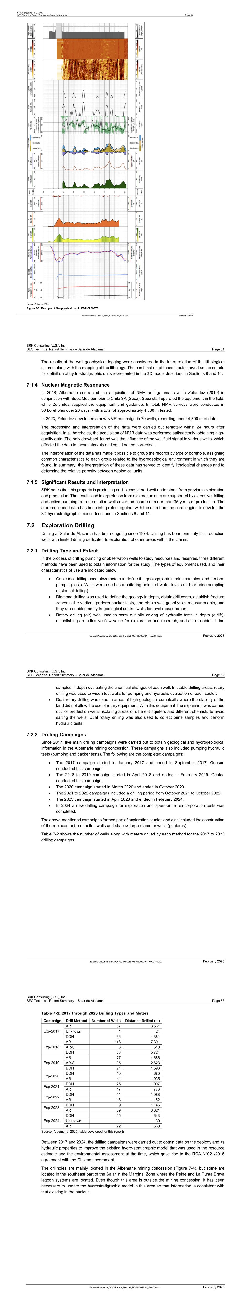 SRK Consulting (U.S.), Inc. SEC Technical Report Summary – Salar de Atacama Page 60 SalardeAtacama_SECUpdate_Report_USPR002291_Rev03.docx February 2026 Source: Zelandez, 2024 Figure 7-3: Example of Geophysical Log in Well CLO-376 SRK Consulting (U.S.), Inc. SEC Technical Report Summary – Salar de Atacama Page 61 SalardeAtacama_SECUpdate_Report_USPR002291_Rev03.docx February 2026 The results of the well geophysical logging were considered in the interpretation of the lithological column along with the mapping of the lithology. The combination of these inputs served as the criteria for definition of hydrostratigraphic units represented in the 3D model described in Sections 6 and 11. 7.1.4 Nuclear Magnetic Resonance In 2018, Albemarle contracted the acquisition of NMR and gamma rays to Zelandez (2019) in conjunction with Suez Medioambiente Chile SA (Suez). Suez staff operated the equipment in the field, while Zelandez supplied the equipment and guidance. In total, NMR surveys were conducted in 36 boreholes over 26 days, with a total of approximately 4,800 m tested. In 2023, Zelandez developed a new NMR campaign in 79 wells, recording about 4,300 m of data. The processing and interpretation of the data were carried out remotely within 24 hours after acquisition. In all boreholes, the acquisition of NMR data was performed satisfactorily, obtaining high- quality data. The only drawback found was the influence of the well fluid signal in various wells, which affected the data in these intervals and could not be corrected. The interpretation of the data has made it possible to group the records by type of borehole, assigning common characteristics to each group related to the hydrogeological environment in which they are found. In summary, the interpretation of these data has served to identify lithological changes and to determine the relative porosity between geological units. 7.1.5 Significant Results and Interpretation SRK notes that this property is producing and is considered well-understood from previous exploration and production. The results and interpretation from exploration data are supported by extensive drilling and active pumping from production wells over the course of more than 35 years of production. The aforementioned data has been interpreted together with the data from the core logging to develop the 3D hydrostratigraphic model described in Sections 6 and 11. 7.2 Exploration Drilling Drilling at Salar de Atacama has been ongoing since 1974. Drilling has been primarily for production wells with limited drilling dedicated to exploration of other areas within the claims. 7.2.1 Drilling Type and Extent In the process of drilling pumping or observation wells to study resources and reserves, three different methods have been used to obtain information for the study. The types of equipment used, and their characteristics of use are indicated below: Cable tool drilling used piezometers to define the geology, obtain brine samples, and perform pumping tests. Wells were used as monitoring points of water levels and for brine sampling (historical drilling). Diamond drilling was used to define the geology in depth, obtain drill cores, establish fracture zones in the vertical, perform packer tests, and obtain well geophysics measurements, and they are enabled as hydrogeological control wells for level measurement. Rotary drilling (air) was used to carry out pile driving of hydraulic tests in depth (airlift), establishing an indicative flow value for exploration and research, and also to obtain brine SRK Consulting (U.S.), Inc. SEC Technical Report Summary – Salar de Atacama Page 62 SalardeAtacama_SECUpdate_Report_USPR002291_Rev03.docx February 2026 samples in depth evaluating the chemical changes of each well. In stable drilling areas, rotary drilling was used to widen test wells for pumping and hydraulic evaluation of each sector. Dual-rotary drilling was used in areas of high geological complexity where the stability of the land did not allow the use of rotary equipment. With this equipment, the expansion was carried out for production wells, isolating areas of different aquifers and different chemists to avoid salting the wells. Dual rotary drilling was also used to collect brine samples and perform hydraulic tests. 7.2.2 Drilling Campaigns Since 2017, five main drilling campaigns were carried out to obtain geological and hydrogeological information in the Albemarle mining concession. These campaigns also included pumping hydraulic tests (pumping and packer tests). The following are the completed campaigns: The 2017 campaign started in January 2017 and ended in September 2017. Geosud conducted this campaign. The 2018 to 2019 campaign started in April 2018 and ended in February 2019. Geotec conducted this campaign. The 2020 campaign started in March 2020 and ended in October 2020. The 2021 to 2022 campaigns included a drilling period from October 2021 to October 2022. The 2023 campaign started in April 2023 and ended in February 2024. In 2024 a new drilling campaign for exploration and spent-brine reincorporation tests was completed. The above-mentioned campaigns formed part of exploration studies and also included the construction of the replacement production wells and shallow large-diameter wells (punteras). Table 7-2 shows the number of wells along with meters drilled by each method for the 2017 to 2023 drilling campaigns. SRK Consulting (U.S.), Inc. SEC Technical Report Summary – Salar de Atacama Page 63 SalardeAtacama_SECUpdate_Report_USPR002291_Rev03.docx February 2026 Table 7-2: 2017 through 2023 Drilling Types and Meters Campaign Drill Method Number of Wells Distance Drilled (m) Exp-2017 AR 57 3,561 Unknown 1 24 DDH 36 4,381 Exp-2018 AR 148 7,391 AR-S 8 610 DDH 63 5,724 Exp-2019 AR 77 4,686 AR-S 35 2,623 DDH 21 1,593 Exp-2020 DDH 10 680 AR 41 1,935 Exp-2021 DDH 25 1,097 AR 17 776 Exp-2022 DDH 11 1,088 AR 18 1,152 Exp-2023 DDH 9 1,146 AR 69 3,621 Exp-2024 DDH 15 643 Unkn