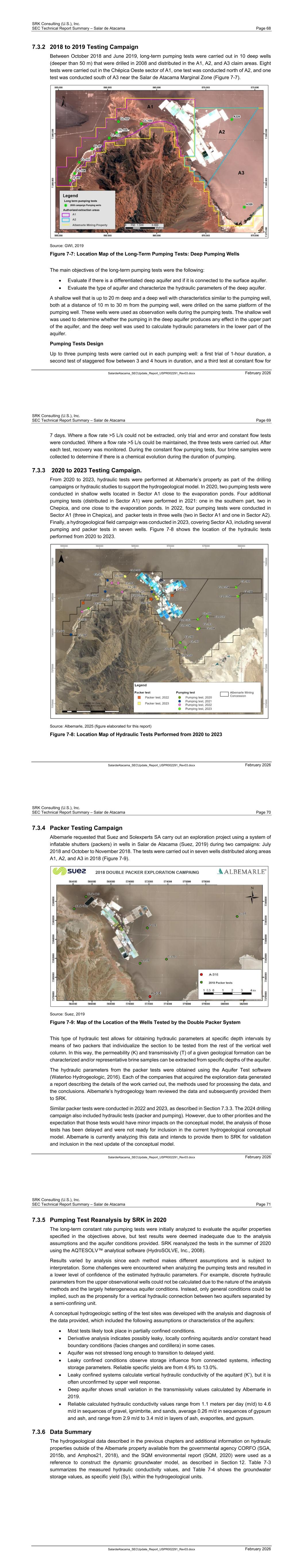 SRK Consulting (U.S.), Inc. SEC Technical Report Summary – Salar de Atacama Page 68 SalardeAtacama_SECUpdate_Report_USPR002291_Rev03.docx February 2026 7.3.2 2018 to 2019 Testing Campaign Between October 2018 and June 2019, long-term pumping tests were carried out in 10 deep wells (deeper than 50 m) that were drilled in 2008 and distributed in the A1, A2, and A3 claim areas. Eight tests were carried out in the Chépica Oeste sector of A1, one test was conducted north of A2, and one test was conducted south of A3 near the Salar de Atacama Marginal Zone (Figure 7-7). Source: GWI, 2019 Figure 7-7: Location Map of the Long-Term Pumping Tests: Deep Pumping Wells The main objectives of the long-term pumping tests were the following: Evaluate if there is a differentiated deep aquifer and if it is connected to the surface aquifer. Evaluate the type of aquifer and characterize the hydraulic parameters of the deep aquifer. A shallow well that is up to 20 m deep and a deep well with characteristics similar to the pumping well, both at a distance of 10 m to 30 m from the pumping well, were drilled on the same platform of the pumping well. These wells were used as observation wells during the pumping tests. The shallow well was used to determine whether the pumping in the deep aquifer produces any effect in the upper part of the aquifer, and the deep well was used to calculate hydraulic parameters in the lower part of the aquifer. Pumping Tests Design Up to three pumping tests were carried out in each pumping well: a first trial of 1-hour duration, a second test of staggered flow between 3 and 4 hours in duration, and a third test at constant flow for SRK Consulting (U.S.), Inc. SEC Technical Report Summary – Salar de Atacama Page 69 SalardeAtacama_SECUpdate_Report_USPR002291_Rev03.docx February 2026 7 days. Where a flow rate >5 L/s could not be extracted, only trial and error and constant flow tests were conducted. Where a flow rate >5 L/s could be maintained, the three tests were carried out. After each test, recovery was monitored. During the constant flow pumping tests, four brine samples were collected to determine if there is a chemical evolution during the duration of pumping. 7.3.3 2020 to 2023 Testing Campaign. From 2020 to 2023, hydraulic tests were performed at Albemarle’s property as part of the drilling campaigns or hydraulic studies to support the hydrogeological model. In 2020, two pumping tests were conducted in shallow wells located in Sector A1 close to the evaporation ponds. Four additional pumping tests (distributed in Sector A1) were performed in 2021: one in the southern part, two in Chepica, and one close to the evaporation ponds. In 2022, four pumping tests were conducted in Sector A1 (three in Chepica), and packer tests in three wells (two in Sector A1 and one in Sector A2). Finally, a hydrogeological field campaign was conducted in 2023, covering Sector A3, including several pumping and packer tests in seven wells. Figure 7-8 shows the location of the hydraulic tests performed from 2020 to 2023. Source: Albemarle, 2025 (figure elaborated for this report) Figure 7-8: Location Map of Hydraulic Tests Performed from 2020 to 2023 SRK Consulting (U.S.), Inc. SEC Technical Report Summary – Salar de Atacama Page 70 SalardeAtacama_SECUpdate_Report_USPR002291_Rev03.docx February 2026 7.3.4 Packer Testing Campaign Albemarle requested that Suez and Solexperts SA carry out an exploration project using a system of inflatable shutters (packers) in wells in Salar de Atacama (Suez, 2019) during two campaigns: July 2018 and October to November 2018. The tests were carried out in seven wells distributed along areas A1, A2, and A3 in 2018 (Figure 7-9). Source: Suez, 2019 Figure 7-9: Map of the Location of the Wells Tested by the Double Packer System This type of hydraulic test allows for obtaining hydraulic parameters at specific depth intervals by means of two packers that individualize the section to be tested from the rest of the vertical well column. In this way, the permeability (K) and transmissivity (T) of a given geological formation can be characterized and/or representative brine samples can be extracted from specific depths of the aquifer. The hydraulic parameters from the packer tests were obtained using the Aquifer Test software (Waterloo Hydrogeologic, 2016). Each of the companies that acquired the exploration data generated a report describing the details of the work carried out, the methods used for processing the data, and the conclusions. Albemarle’s hydrogeology team reviewed the data and subsequently provided them to SRK. Similar packer tests were conducted in 2022 and 2023, as described in Section 7.3.3. The 2024 drilling campaign also included hydraulic tests (packer and pumping). However, due to other priorities and the expectation that those tests would have minor impacts on the conceptual model, the analysis of those tests has been delayed and were not ready for inclusion in the current hydrogeological conceptual model. Albemarle is currently analyzing this data and intends to provide them to SRK for validation and inclusion in the next update of the conceptual model. SRK Consulting (U.S.), Inc. SEC Technical Report Summary – Salar de Atacama Page 71 SalardeAtacama_SECUpdate_Report_USPR002291_Rev03.docx February 2026 7.3.5 Pumping Test Reanalysis by SRK in 2020 The long-term constant rate pumping tests were initially analyzed to evaluate the aquifer properties specified in the objectives above, but test results were deemed inadequate due to the analysis assumptions and the aquifer conditions provided. SRK reanalyzed the tests in the summer of 2020 using the AQTESOLV™ analytical software (HydroSOLVE, Inc., 2008). Results varied by analysis since each method makes different assumptions and is subject to interpretation. Some challenges were encountered when analyzing the pumping tests and resulted in a lower level of confidence of the estimated hydraulic para