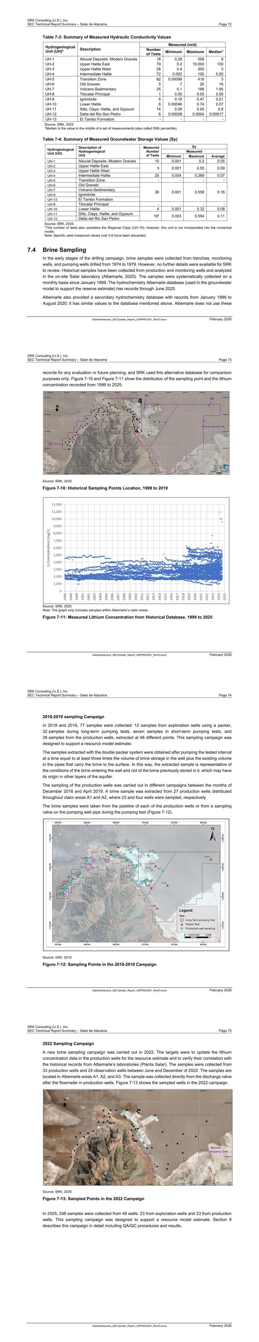 SRK Consulting (U.S.), Inc. SEC Technical Report Summary – Salar de Atacama Page 72 SalardeAtacama_SECUpdate_Report_USPR002291_Rev03.docx February 2026 Table 7-3: Summary of Measured Hydraulic Conductivity Values Hydrogeological Unit (UH)5 Description Measured (m/d) Number of Tests Minimum Maximum Median1 UH-1 Alluvial Deposits -Modern Gravels 18 0.29 558 8 UH-2 Upper Halite East 79 0.2 10,000 100 UH-3 Upper Halite West 26 0.4 500 3 UH-4 Intermediate Halite 72 0.002 100 0.55 UH-5 Transition Zone 62 0.00099 416 3 UH-6 Old Gravels 5 7 26 16 UH-7 Volcano-Sedimentary 35 0.1 188 1.95 UH-8 Tilocalar Principal 1 0.05 0.05 0.05 UH-9 Ignimbrite 5 0.16 0.47 0.21 UH-10 Lower Halite 6 0.00046 0.74 0.07 UH-11 Silts, Clays, Halite, and Gypsum 14 0.09 5.45 0.9 UH-12 Delta del Rio San Pedro 6 0.00008 0.0004 0.00017 UH-13 El Tambo Formation - - - - Source: SRK, 2025 1Median is the value in the middle of a set of measurements (also called 50th percentile). Table 7-4: Summary of Measured Groundwater Storage Values (Sy) Hydrogeological Unit (UH) Description of Hydrogeological Unit Measured Number of Tests Sy Measured Minimum Maximum Average UH-1 Alluvial Deposits -Modern Gravels 10 0.001 0.2 0.05 UH-2 Upper Halite East 9 0.001 0.55 0.09 UH-3 Upper Halite West UH-4 Intermediate Halite 25 0.004 0.269 0.07 UH-5 Transition Zone - - - - UH-6 Old Gravels 36 0.001 0.558 0.16 UH-7 Volcano-Sedimentary UH-9 Ignimbrite UH-13 El Tambo Formation UH-8 Tilocalar Principal - - - - UH-10 Lower Halite 4 0.001 0.32 0.08 UH-11 Silts, Clays, Halite, and Gypsum 191 0.003 0.554 0.11 UH-12 Delta del Rio San Pedro Source: SRK, 2025 1This number of tests also considers the Regional Clays (UH-16); however, this unit is not incorporated into the numerical model. Note: Specific yield measured values over 0.6 have been discarded. 7.4 Brine Sampling In the early stages of the drilling campaign, brine samples were collected from trenches, monitoring wells, and pumping wells drilled from 1974 to 1979. However, no further details were available for SRK to review. Historical samples have been collected from production and monitoring wells and analyzed in the on-site Salar laboratory (Albemarle, 2025). The samples were systematically collected on a monthly basis since January 1999. The hydrochemistry Albemarle database (used in the groundwater model to support the reserve estimate) has records through June 2025. Albemarle also provided a secondary hydrochemistry database with records from January 1999 to August 2020; it has similar values to the database mentioned above. Albemarle does not use these SRK Consulting (U.S.), Inc. SEC Technical Report Summary – Salar de Atacama Page 73 SalardeAtacama_SECUpdate_Report_USPR002291_Rev03.docx February 2026 records for any evaluation or future planning, and SRK used this alternative database for comparison purposes only. Figure 7-10 and Figure 7-11 show the distribution of the sampling point and the lithium concentration recorded from 1999 to 2025. Source: SRK, 2025 Figure 7-10: Historical Sampling Points Location, 1999 to 2019 Source: SRK, 2025 Note: The graph only includes samples within Albemarle’s claim areas. Figure 7-11: Measured Lithium Concentration from Historical Database, 1999 to 2025 SRK Consulting (U.S.), Inc. SEC Technical Report Summary – Salar de Atacama Page 74 SalardeAtacama_SECUpdate_Report_USPR002291_Rev03.docx February 2026 2018-2019 sampling Campaign In 2018 and 2019, 77 samples were collected: 12 samples from exploration wells using a packer, 32 samples during long-term pumping tests, seven samples in short-term pumping tests, and 26 samples from the production wells, extracted at 48 different points. This sampling campaign was designed to support a resource model estimate. The samples extracted with the double packer system were obtained after pumping the tested interval at a time equal to at least three times the volume of brine storage in the well plus the existing volume in the pipes that carry the brine to the surface. In this way, the extracted sample is representative of the conditions of the brine entering the well and not of the brine previously stored in it, which may have its origin in other layers of the aquifer. The sampling of the production wells was carried out in different campaigns between the months of December 2018 and April 2019. A brine sample was extracted from 27 production wells distributed throughout claim areas A1 and A2, where 23 and four wells were sampled, respectively. The brine samples were taken from the pipeline of each of the production wells or from a sampling valve on the pumping well pipe during the pumping test (Figure 7-12). Source: GWI, 2019 Figure 7-12: Sampling Points in the 2018-2019 Campaign SRK Consulting (U.S.), Inc. SEC Technical Report Summary – Salar de Atacama Page 75 SalardeAtacama_SECUpdate_Report_USPR002291_Rev03.docx February 2026 2022 Sampling Campaign A new brine sampling campaign was carried out in 2022. The targets were to update the lithium concentration data in the production wells for the resource estimate and to verify their correlation with the historical records from Albemarle’s laboratories (Planta Salar). The samples were collected from 33 production wells and 24 observation wells between June and December of 2022. The samples are located in Albemarle areas A1, A2, and A3. The sample was collected directly from the discharge valve after the flowmeter in production wells. Figure 7-13 shows the sampled wells in the 2022 campaign. Source: SRK, 2025 Figure 7-13: Sampled Points in the 2022 Campaign In 2025, 246 samples were collected from 46 wells: 23 from exploration wells and 23 from production wells. This sampling campaign was designed to support a resource model estimate. Section 8 describes this campaign in detail including QA/QC procedures and results.