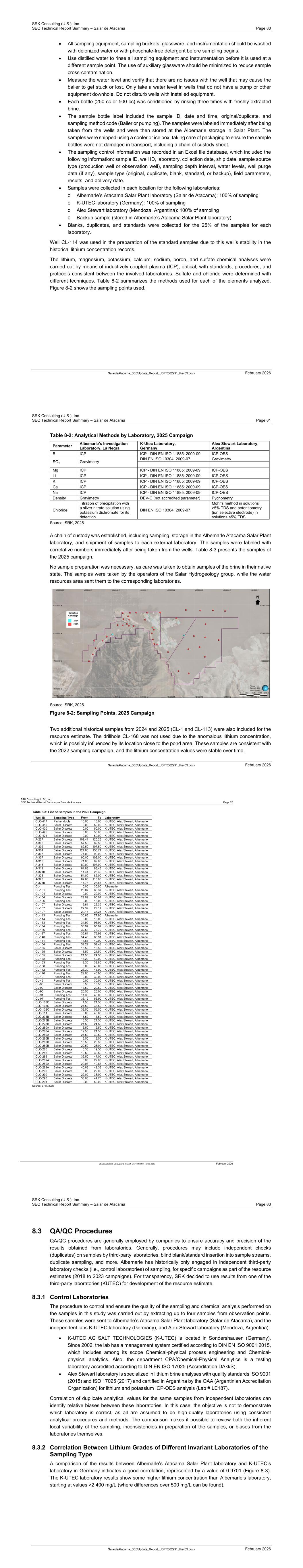 SRK Consulting (U.S.), Inc. SEC Technical Report Summary – Salar de Atacama Page 84 SalardeAtacama_SECUpdate_Report_USPR002291_Rev03.docx February 2026 Source: SRK, 2025 Figure 8-3: Scatter Diagram Comparing the Results Obtained for Lithium between Albemarle’s Atacama Salar Plant and K-UTEC Laboratories The correlation between the Alex Stewart and Albemarle’s Atacama Salar Plant laboratories is also high (0.9757). A bias can be observed, showing a minor overestimation in the lithium concentration tested in Albemarle’s laboratory. Samples above 3,000 mg/L trends lower in Alex Stewart laboratory, reaching differences up to 250 mg/L. Measured values below 3,300 mg/L are generally very similar (Figure 8-4). SRK Consulting (U.S.), Inc. SEC Technical Report Summary – Salar de Atacama Page 85 SalardeAtacama_SECUpdate_Report_USPR002291_Rev03.docx February 2026 Source: SRK, 2025 Figure 8-4: Scatter Diagram Comparing the Results Obtained for Lithium between Albemarle’s Atacama Salar Plant and Alex Stewart Laboratories The correlation between Alex Stewart and K-UTEC laboratories is extremely good (0.9906). Despite this high correlation, Alex Stewart laboratory returns a few lower lithium concentrations than K-UTEC when the values are >5,000 mg/L. Below this value, the samples present a strong correlation (Figure 8-5). SRK Consulting (U.S.), Inc. SEC Technical Report Summary – Salar de Atacama Page 86 SalardeAtacama_SECUpdate_Report_USPR002291_Rev03.docx February 2026 Source: SRK, 2025 Figure 8-5: Scatter Diagram Comparing the Results Obtained for Lithium between Alex Stewart and K-UTEC Laboratories In summary, Albemarle’s Atacama Salar Plant laboratory presents a good correlation; however, few samples underestimate the lithium content in the high concentration interval. Alex Stewart and K-UTEC laboratories show a consistent correlation, with some exceptions in concentration above 5,000 mg/L. 8.3.3 Standards, Blanks, and Duplicates The 2025 campaign considered blank, duplicates, and standards for approximately 25% of the samples for each laboratory. The standards were prepared by using the production well CL-114. This well presents very stable and consistent values in the historical production database. Sixty-three standard samples were sent to the four laboratories. The standard samples analyzed from Alex Stewart and K-UTEC laboratories are consistent with the standards values (Figure 8-6). SRK Consulting (U.S.), Inc. SEC Technical Report Summary – Salar de Atacama Page 87 SalardeAtacama_SECUpdate_Report_USPR002291_Rev03.docx February 2026 Source: SRK, 2025 STD: Standard deviation Figure 8-6: Standard Samples A total of 22 duplicates were sampled and analyzed in K-UTEC and Alex Stewart laboratories. The results show a good correlation between duplicates and original, however, K-UTEC presents a couple of discrepancies in concentrations above 5,000 mg/L (Figure 8-7).