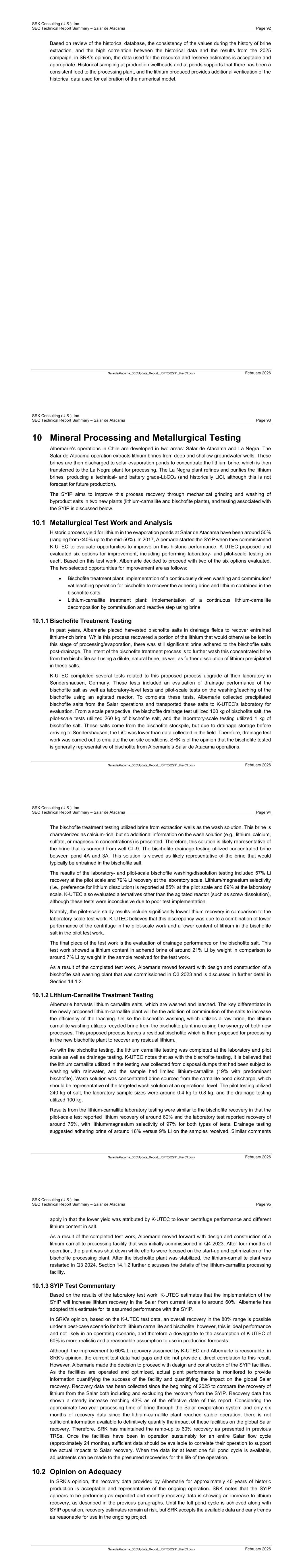 SRK Consulting (U.S.), Inc. SEC Technical Report Summary – Salar de Atacama Page 92 SalardeAtacama_SECUpdate_Report_USPR002291_Rev03.docx February 2026 Based on review of the historical database, the consistency of the values during the history of brine extraction, and the high correlation between the historical data and the results from the 2025 campaign, in SRK’s opinion, the data used for the resource and reserve estimates is acceptable and appropriate. Historical sampling at production wellheads and at ponds supports that there has been a consistent feed to the processing plant, and the lithium produced provides additional verification of the historical data used for calibration of the numerical model. SRK Consulting (U.S.), Inc. SEC Technical Report Summary – Salar de Atacama Page 93 SalardeAtacama_SECUpdate_Report_USPR002291_Rev03.docx February 2026 10 Mineral Processing and Metallurgical Testing Albemarle's operations in Chile are developed in two areas: Salar de Atacama and La Negra. The Salar de Atacama operation extracts lithium brines from deep and shallow groundwater wells. These brines are then discharged to solar evaporation ponds to concentrate the lithium brine, which is then transferred to the La Negra plant for processing. The La Negra plant refines and purifies the lithium brines, producing a technical- and battery grade-Li2CO3 (and historically LiCl, although this is not forecast for future production). The SYIP aims to improve this process recovery through mechanical grinding and washing of byproduct salts in two new plants (lithium-carnallite and bischofite plants), and testing associated with the SYIP is discussed below. 10.1 Metallurgical Test Work and Analysis Historic process yield for lithium in the evaporation ponds at Salar de Atacama have been around 50% (ranging from <40% up to the mid-50%). In 2017, Albemarle started the SYIP when they commissioned K-UTEC to evaluate opportunities to improve on this historic performance. K-UTEC proposed and evaluated six options for improvement, including performing laboratory- and pilot-scale testing on each. Based on this test work, Albemarle decided to proceed with two of the six options evaluated. The two selected opportunities for improvement are as follows: Bischofite treatment plant: implementation of a continuously driven washing and comminution/ vat leaching operation for bischofite to recover the adhering brine and lithium contained in the bischofite salts. Lithium-carnallite treatment plant: implementation of a continuous lithium-carnallite decomposition by comminution and reactive step using brine. 10.1.1 Bischofite Treatment Testing In past years, Albemarle placed harvested bischofite salts in drainage fields to recover entrained lithium-rich brine. While this process recovered a portion of the lithium that would otherwise be lost in this stage of processing/evaporation, there was still significant brine adhered to the bischofite salts post-drainage. The intent of the bischofite treatment process is to further wash this concentrated brine from the bischofite salt using a dilute, natural brine, as well as further dissolution of lithium precipitated in these salts. K-UTEC completed several tests related to this proposed process upgrade at their laboratory in Sondershausen, Germany. These tests included an evaluation of drainage performance of the bischofite salt as well as laboratory-level tests and pilot-scale tests on the washing/leaching of the bischofite using an agitated reactor. To complete these tests, Albemarle collected precipitated bischofite salts from the Salar operations and transported these salts to K-UTEC’s laboratory for evaluation. From a scale perspective, the bischofite drainage test utilized 100 kg of bischofite salt, the pilot-scale tests utilized 260 kg of bischofite salt, and the laboratory-scale testing utilized 1 kg of bischofite salt. These salts come from the bischofite stockpile, but due to drainage storage before arriving to Sondershausen, the LiCl was lower than data collected in the field. Therefore, drainage test work was carried out to emulate the on-site conditions. SRK is of the opinion that the bischofite tested is generally representative of bischofite from Albemarle’s Salar de Atacama operations. SRK Consulting (U.S.), Inc. SEC Technical Report Summary – Salar de Atacama Page 94 SalardeAtacama_SECUpdate_Report_USPR002291_Rev03.docx February 2026 The bischofite treatment testing utilized brine from extraction wells as the wash solution. This brine is characterized as calcium-rich, but no additional information on the wash solution (e.g., lithium, calcium, sulfate, or magnesium concentrations) is presented. Therefore, this solution is likely representative of the brine that is sourced from well CL-9. The bischofite drainage testing utilized concentrated brine between pond 4A and 3A. This solution is viewed as likely representative of the brine that would typically be entrained in the bischofite salt. The results of the laboratory- and pilot-scale bischofite washing/dissolution testing included 57% Li recovery at the pilot scale and 79% Li recovery at the laboratory scale. Lithium/magnesium selectivity (i.e., preference for lithium dissolution) is reported at 85% at the pilot scale and 89% at the laboratory scale. K-UTEC also evaluated alternatives other than the agitated reactor (such as screw dissolution), although these tests were inconclusive due to poor test implementation. Notably, the pilot-scale study results include significantly lower lithium recovery in comparison to the laboratory-scale test work. K-UTEC believes that this discrepancy was due to a combination of lower performance of the centrifuge in the pilot-scale work and a lower content of lithium in the bischofite salt in the pilot test work. The final piece of the test work is the evaluation of drainage performance on the bischofite salt. This test work showed a lithium content in adhered brine of