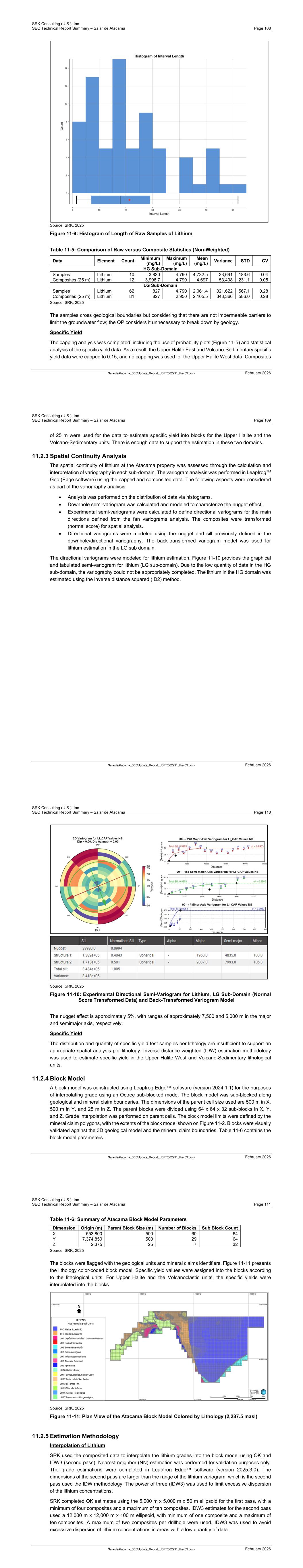 SRK Consulting (U.S.), Inc. SEC Technical Report Summary – Salar de Atacama Page 108 SalardeAtacama_SECUpdate_Report_USPR002291_Rev03.docx February 2026 Source: SRK, 2025 Figure 11-9: Histogram of Length of Raw Samples of Lithium Table 11-5: Comparison of Raw versus Composite Statistics (Non-Weighted) Data Element Count Minimum (mg/L) Maximum (mg/L) Mean (mg/L) Variance STD CV HG Sub-Domain Samples Lithium 10 3,830 4,790 4,732.5 33,691 183.6 0.04 Composites (25 m) Lithium 12 3,996.7 4,790 4,697 53,408 231.1 0.05 LG Sub-Domain Samples Lithium 62 827 4,790 2,061.4 321,622 567.1 0.28 Composites (25 m) Lithium 81 827 2,950 2,105.5 343,366 586.0 0.28 Source: SRK, 2025 The samples cross geological boundaries but considering that there are not impermeable barriers to limit the groundwater flow; the QP considers it unnecessary to break down by geology. Specific Yield The capping analysis was completed, including the use of probability plots (Figure 11-5) and statistical analysis of the specific yield data. As a result, the Upper Halite East and Volcano-Sedimentary specific yield data were capped to 0.15, and no capping was used for the Upper Halite West data. Composites SRK Consulting (U.S.), Inc. SEC Technical Report Summary – Salar de Atacama Page 109 SalardeAtacama_SECUpdate_Report_USPR002291_Rev03.docx February 2026 of 25 m were used for the data to estimate specific yield into blocks for the Upper Halite and the Volcano-Sedimentary units. There is enough data to support the estimation in these two domains. 11.2.3 Spatial Continuity Analysis The spatial continuity of lithium at the Atacama property was assessed through the calculation and interpretation of variography in each sub-domain. The variogram analysis was performed in LeapfrogTM Geo (Edge software) using the capped and composited data. The following aspects were considered as part of the variography analysis: Analysis was performed on the distribution of data via histograms. Downhole semi-variogram was calculated and modeled to characterize the nugget effect. Experimental semi-variograms were calculated to define directional variograms for the main directions defined from the fan variograms analysis. The composites were transformed (normal score) for spatial analysis. Directional variograms were modeled using the nugget and sill previously defined in the downhole/directional variography. The back-transformed variogram model was used for lithium estimation in the LG sub domain. The directional variograms were modeled for lithium estimation. Figure 11-10 provides the graphical and tabulated semi-variogram for lithium (LG sub-domain). Due to the low quantity of data in the HG sub-domain, the variography could not be appropriately completed. The lithium in the HG domain was estimated using the inverse distance squared (ID2) method. SRK Consulting (U.S.), Inc. SEC Technical Report Summary – Salar de Atacama Page 110 SalardeAtacama_SECUpdate_Report_USPR002291_Rev03.docx February 2026 Source: SRK, 2025 Figure 11-10: Experimental Directional Semi-Variogram for Lithium, LG Sub-Domain (Normal Score Transformed Data) and Back-Transformed Variogram Model The nugget effect is approximately 5%, with ranges of approximately 7,500 and 5,000 m in the major and semimajor axis, respectively. Specific Yield The distribution and quantity of specific yield test samples per lithology are insufficient to support an appropriate spatial analysis per lithology. Inverse distance weighted (IDW) estimation methodology was used to estimate specific yield in the Upper Halite West and Volcano-Sedimentary lithological units. 11.2.4 Block Model A block model was constructed using Leapfrog Edge™ software (version 2024.1.1) for the purposes of interpolating grade using an Octree sub-blocked mode. The block model was sub-blocked along geological and mineral claim boundaries. The dimensions of the parent cell size used are 500 m in X, 500 m in Y, and 25 m in Z. The parent blocks were divided using 64 x 64 x 32 sub-blocks in X, Y, and Z. Grade interpolation was performed on parent cells. The block model limits were defined by the mineral claim polygons, with the extents of the block model shown on Figure 11-2. Blocks were visually validated against the 3D geological model and the mineral claim boundaries. Table 11-6 contains the block model parameters. SRK Consulting (U.S.), Inc. SEC Technical Report Summary – Salar de Atacama Page 111 SalardeAtacama_SECUpdate_Report_USPR002291_Rev03.docx February 2026 Table 11-6: Summary of Atacama Block Model Parameters Dimension Origin (m) Parent Block Size (m) Number of Blocks Sub Block Count X 553,800 500 60 64 Y 7,374,850 500 29 64 Z 2,375 25 7 32 Source: SRK, 2025 The blocks were flagged with the geological units and mineral claims identifiers. Figure 11-11 presents the lithology color-coded block model. Specific yield values were assigned into the blocks according to the lithological units. For Upper Halite and the Volcanoclastic units, the specific yields were interpolated into the blocks. Source: SRK, 2025 Figure 11-11: Plan View of the Atacama Block Model Colored by Lithology (2,287.5 masl) 11.2.5 Estimation Methodology Interpolation of Lithium SRK used the composited data to interpolate the lithium grades into the block model using OK and IDW3 (second pass). Nearest neighbor (NN) estimation was performed for validation purposes only. The grade estimations were completed in Leapfrog Edge™ software (version 2025.3.0). The dimensions of the second pass are larger than the range of the lithium variogram, which is the second pass used the IDW methodology. The power of three (IDW3) was used to limit excessive dispersion of the lithium concentrations. SRK completed OK estimates using the 5,000 m x 5,000 m x 50 m ellipsoid for the first pass, with a minimum of four composites and a maximum of ten composites. IDW3 estimates for the second pass used a 12,000 m x 12,000 m x 100 m ellipsoid, with minimum of one composite and a