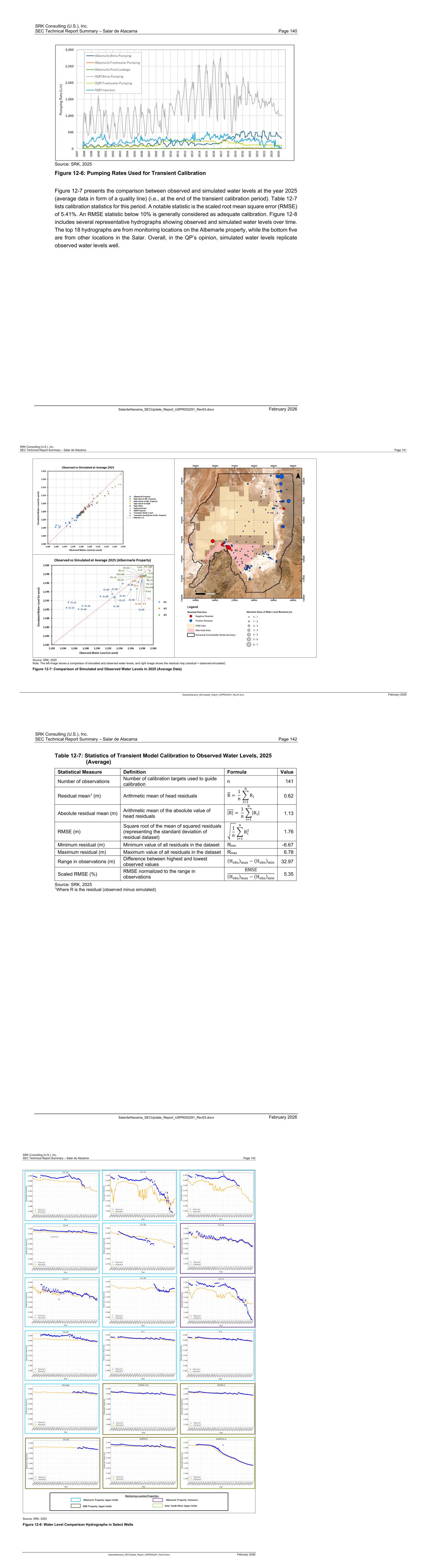 SRK Consulting (U.S.), Inc. SEC Technical Report Summary – Salar de Atacama Page 140 SalardeAtacama_SECUpdate_Report_USPR002291_Rev03.docx February 2026 Source: SRK, 2025 Figure 12-6: Pumping Rates Used for Transient Calibration Figure 12-7 presents the comparison between observed and simulated water levels at the year 2025 (average data in form of a quality line) (i.e., at the end of the transient calibration period). Table 12-7 lists calibration statistics for this period. A notable statistic is the scaled root mean square error (RMSE) of 5.41%. An RMSE statistic below 10% is generally considered as adequate calibration. Figure 12-8 includes several representative hydrographs showing observed and simulated water levels over time. The top 18 hydrographs are from monitoring locations on the Albemarle property, while the bottom five are from other locations in the Salar. Overall, in the QP’s opinion, simulated water levels replicate observed water levels well. SRK Consulting (U.S.), Inc. SEC Technical Report Summary – Salar de Atacama Page 141 SalardeAtacama_SECUpdate_Report_USPR002291_Rev03.docx February 2026 Source: SRK, 2025 Note: The left image shows a comparison of simulated and observed water levels, and right image shows the residual map (residual = observed-simulated). Figure 12-7: Comparison of Simulated and Observed Water Levels in 2025 (Average Data) SRK Consulting (U.S.), Inc. SEC Technical Report Summary – Salar de Atacama Page 142 SalardeAtacama_SECUpdate_Report_USPR002291_Rev03.docx February 2026 Table 12-7: Statistics of Transient Model Calibration to Observed Water Levels, 2025 (Average) Statistical Measure Definition Formula Value Number of observations Number of calibration targets used to guide calibration n 141 Residual mean1 (m) Arithmetic mean of head residuals R 1 n R 0.62 Absolute residual mean (m) Arithmetic mean of the absolute value of head residuals |R| 1 n |R | 1.13 RMSE (m) Square root of the mean of squared residuals (representing the standard deviation of residual dataset) 1 n R 1.76 Minimum residual (m) Minimum value of all residuals in the dataset Rmin -6.67 Maximum residual (m) Maximum value of all residuals in the dataset Rmax 6.78 Range in observations (m) Difference between highest and lowest observed values H H 32.97 Scaled RMSE (%) RMSE normalized to the range in observations RMSE H H 5.35 Source: SRK, 2025 1Where R is the residual (observed minus simulated) SRK Consulting (U.S.), Inc. SEC Technical Report Summary – Salar de Atacama Page 143 SalardeAtacama_SECUpdate_Report_USPR002291_Rev03.docx February 2026 Source: SRK, 2025 Figure 12-8: Water Level Comparison Hydrographs in Select Wells