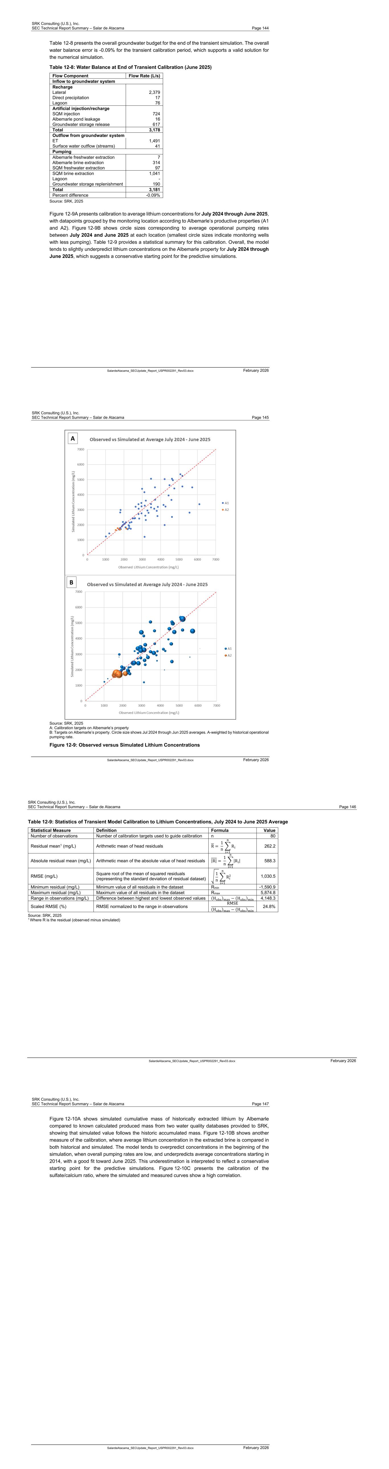 SRK Consulting (U.S.), Inc. SEC Technical Report Summary – Salar de Atacama Page 144 SalardeAtacama_SECUpdate_Report_USPR002291_Rev03.docx February 2026 Table 12-8 presents the overall groundwater budget for the end of the transient simulation. The overall water balance error is -0.09% for the transient calibration period, which supports a valid solution for the numerical simulation. Table 12-8: Water Balance at End of Transient Calibration (June 2025) Flow Component Flow Rate (L/s) Inflow to groundwater system Recharge Lateral 2,379 Direct precipitation 17 Lagoon 76 Artificial injection/recharge SQM injection 724 Albemarle pond leakage 16 Groundwater storage release 617 Total 3,178 Outflow from groundwater system ET 1,491 Surface water outflow (streams) 41 Pumping Albemarle freshwater extraction 7 Albemarle brine extraction 314 SQM freshwater extraction 97 SQM brine extraction 1,041 Lagoon - Groundwater storage replenishment 190 Total 3,181 Percent difference -0.09% Source: SRK, 2025 Figure 12-9A presents calibration to average lithium concentrations for July 2024 through June 2025, with datapoints grouped by the monitoring location according to Albemarle’s productive properties (A1 and A2). Figure 12-9B shows circle sizes corresponding to average operational pumping rates between July 2024 and June 2025 at each location (smallest circle sizes indicate monitoring wells with less pumping). Table 12-9 provides a statistical summary for this calibration. Overall, the model tends to slightly underpredict lithium concentrations on the Albemarle property for July 2024 through June 2025, which suggests a conservative starting point for the predictive simulations. SRK Consulting (U.S.), Inc. SEC Technical Report Summary – Salar de Atacama Page 145 SalardeAtacama_SECUpdate_Report_USPR002291_Rev03.docx February 2026 Source: SRK, 2025 A: Calibration targets on Albemarle’s property B: Targets on Albemarle’s property. Circle size shows Jul 2024 through Jun 2025 averages. A-weighted by historical operational pumping rate. Figure 12-9: Observed versus Simulated Lithium Concentrations SRK Consulting (U.S.), Inc. SEC Technical Report Summary – Salar de Atacama Page 146 SalardeAtacama_SECUpdate_Report_USPR002291_Rev03.docx February 2026 Table 12-9: Statistics of Transient Model Calibration to Lithium Concentrations, July 2024 to June 2025 Average Statistical Measure Definition Formula Value Number of observations Number of calibration targets used to guide calibration n 80 Residual mean1 (mg/L) Arithmetic mean of head residuals R 1 n R 262.2 Absolute residual mean (mg/L) Arithmetic mean of the absolute value of head residuals |R| 1 n |R | 588.3 RMSE (mg/L) Square root of the mean of squared residuals (representing the standard deviation of residual dataset) 1 n R 1,030.5 Minimum residual (mg/L) Minimum value of all residuals in the dataset Rmin -1,590.9 Maximum residual (mg/L) Maximum value of all residuals in the dataset Rmax 5,874.8 Range in observations (mg/L) Difference between highest and lowest observed values H H 4,148.3 Scaled RMSE (%) RMSE normalized to the range in observations RMSE H H 24.8% Source: SRK, 2025 1 Where R is the residual (observed minus simulated) SRK Consulting (U.S.), Inc. SEC Technical Report Summary – Salar de Atacama Page 147 SalardeAtacama_SECUpdate_Report_USPR002291_Rev03.docx February 2026 Figure 12-10A shows simulated cumulative mass of historically extracted lithium by Albemarle compared to known calculated produced mass from two water quality databases provided to SRK, showing that simulated value follows the historic accumulated mass. Figure 12-10B shows another measure of the calibration, where average lithium concentration in the extracted brine is compared in both historical and simulated. The model tends to overpredict concentrations in the beginning of the simulation, when overall pumping rates are low, and underpredicts average concentrations starting in 2014, with a good fit toward June 2025. This underestimation is interpreted to reflect a conservative starting point for the predictive simulations. Figure 12-10C presents the calibration of the sulfate/calcium ratio, where the simulated and measured curves show a high correlation.