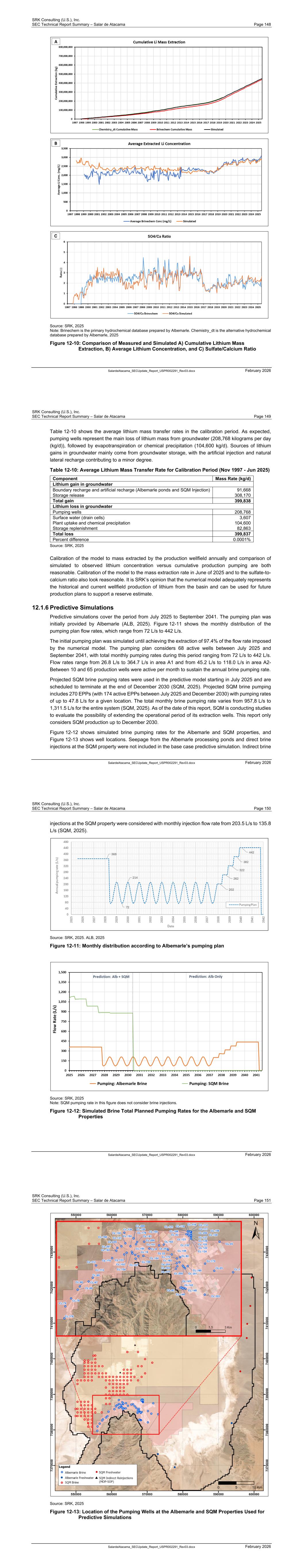 SRK Consulting (U.S.), Inc. SEC Technical Report Summary – Salar de Atacama Page 148 SalardeAtacama_SECUpdate_Report_USPR002291_Rev03.docx February 2026 Source: SRK, 2025 Note: Brinechem is the primary hydrochemical database prepared by Albemarle. Chemistry_dt is the alternative hydrochemical database prepared by Albemarle, 2025 Figure 12-10: Comparison of Measured and Simulated A) Cumulative Lithium Mass Extraction, B) Average Lithium Concentration, and C) Sulfate/Calcium Ratio SRK Consulting (U.S.), Inc. SEC Technical Report Summary – Salar de Atacama Page 149 SalardeAtacama_SECUpdate_Report_USPR002291_Rev03.docx February 2026 Table 12-10 shows the average lithium mass transfer rates in the calibration period. As expected, pumping wells represent the main loss of lithium mass from groundwater (208,768 kilograms per day (kg/d)), followed by evapotranspiration or chemical precipitation (104,600 kg/d). Sources of lithium gains in groundwater mainly come from groundwater storage, with the artificial injection and natural lateral recharge contributing to a minor degree. Table 12-10: Average Lithium Mass Transfer Rate for Calibration Period (Nov 1997 - Jun 2025) Component Mass Rate (kg/d) Lithium gain in groundwater Boundary recharge and artificial recharge (Albemarle ponds and SQM Injection) 91,668 Storage release 308,170 Total gain 399,838 Lithium loss in groundwater Pumping wells 208,768 Surface water (drain cells) 3,607 Plant uptake and chemical precipitation 104,600 Storage replenishment 82,863 Total loss 399,837 Percent difference 0.0001% Source: SRK, 2025 Calibration of the model to mass extracted by the production wellfield annually and comparison of simulated to observed lithium concentration versus cumulative production pumping are both reasonable. Calibration of the model to the mass extraction rate in June of 2025 and to the sulfate-to- calcium ratio also look reasonable. It is SRK’s opinion that the numerical model adequately represents the historical and current wellfield production of lithium from the basin and can be used for future production plans to support a reserve estimate. 12.1.6 Predictive Simulations Predictive simulations cover the period from July 2025 to September 2041. The pumping plan was initially provided by Albemarle (ALB, 2025). Figure 12-11 shows the monthly distribution of the pumping plan flow rates, which range from 72 L/s to 442 L/s. The initial pumping plan was simulated until achieving the extraction of 97.4% of the flow rate imposed by the numerical model. The pumping plan considers 68 active wells between July 2025 and September 2041, with total monthly pumping rates during this period ranging from 72 L/s to 442 L/s. Flow rates range from 26.8 L/s to 364.7 L/s in area A1 and from 45.2 L/s to 118.0 L/s in area A2- Between 10 and 65 production wells were active per month to sustain the annual brine pumping rate. Projected SQM brine pumping rates were used in the predictive model starting in July 2025 and are scheduled to terminate at the end of December 2030 (SQM, 2025). Projected SQM brine pumping includes 270 EPPs (with 174 active EPPs between July 2025 and December 2030) with pumping rates of up to 47.8 L/s for a given location. The total monthly brine pumping rate varies from 957,8 L/s to 1,311.5 L/s for the entire system (SQM, 2025). As of the date of this report, SQM is conducting studies to evaluate the possibility of extending the operational period of its extraction wells. This report only considers SQM production up to December 2030. Figure 12-12 shows simulated brine pumping rates for the Albemarle and SQM properties, and Figure 12-13 shows well locations. Seepage from the Albemarle processing ponds and direct brine injections at the SQM property were not included in the base case predictive simulation. Indirect brine SRK Consulting (U.S.), Inc. SEC Technical Report Summary – Salar de Atacama Page 150 SalardeAtacama_SECUpdate_Report_USPR002291_Rev03.docx February 2026 injections at the SQM property were considered with monthly injection flow rate from 203.5 L/s to 135.8 L/s (SQM, 2025). Source: SRK, 2025. ALB, 2025 Figure 12-11: Monthly distribution according to Albemarle’s pumping plan Source: SRK, 2025 Note: SQM pumping rate in this figure does not consider brine injections. Figure 12-12: Simulated Brine Total Planned Pumping Rates for the Albemarle and SQM Properties SRK Consulting (U.S.), Inc. SEC Technical Report Summary – Salar de Atacama Page 151 SalardeAtacama_SECUpdate_Report_USPR002291_Rev03.docx February 2026 Source: SRK, 2025 Figure 12-13: Location of the Pumping Wells at the Albemarle and SQM Properties Used for Predictive Simulations