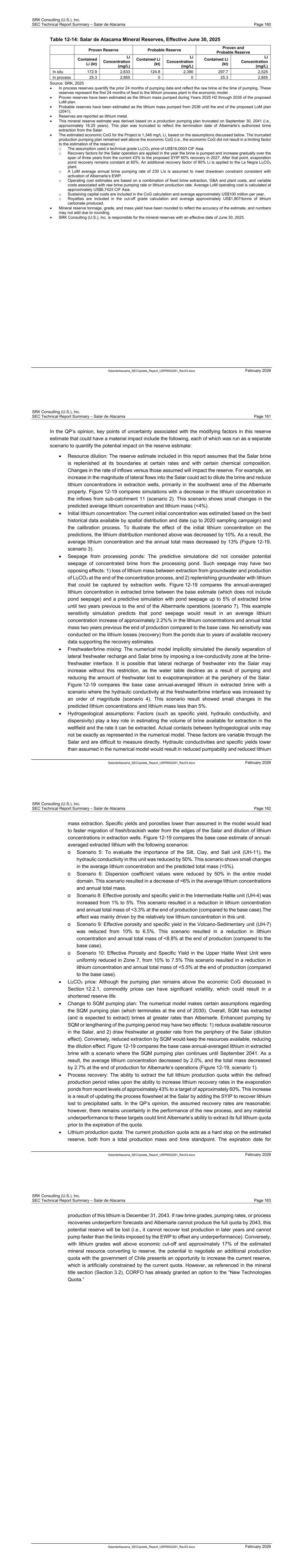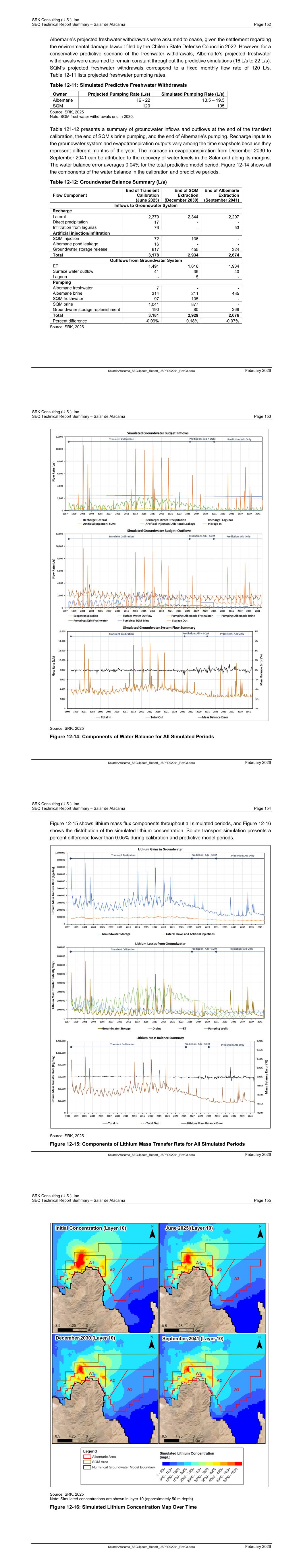 SRK Consulting (U.S.), Inc. SEC Technical Report Summary – Salar de Atacama Page 152 SalardeAtacama_SECUpdate_Report_USPR002291_Rev03.docx February 2026 Albemarle’s projected freshwater withdrawals were assumed to cease, given the settlement regarding the environmental damage lawsuit filed by the Chilean State Defense Council in 2022. However, for a conservative predictive scenario of the freshwater withdrawals, Albemarle’s projected freshwater withdrawals were assumed to remain constant throughout the predictive simulations (16 L/s to 22 L/s). SQM’s projected freshwater withdrawals correspond to a fixed monthly flow rate of 120 L/s. Table 12-11 lists projected freshwater pumping rates. Table 12-11: Simulated Predictive Freshwater Withdrawals Owner Projected Pumping Rate (L/s) Simulated Pumping Rate (L/s) Albemarle 16 - 22 13.5 – 19.5 SQM 120 105 Source: SRK, 2025 Note: SQM freshwater withdrawals end in 2030. Table 121-12 presents a summary of groundwater inflows and outflows at the end of the transient calibration, the end of SQM’s brine pumping, and the end of Albemarle’s pumping. Recharge inputs to the groundwater system and evapotranspiration outputs vary among the time snapshots because they represent different months of the year. The increase in evapotranspiration from December 2030 to September 2041 can be attributed to the recovery of water levels in the Salar and along its margins. The water balance error averages 0.04% for the total predictive model period. Figure 12-14 shows all the components of the water balance in the calibration and predictive periods. Table 12-12: Groundwater Balance Summary (L/s) Flow Component End of Transient Calibration (June 2025) End of SQM Extraction (December 2030) End of Albemarle Extraction (September 2041) Inflows to Groundwater System Recharge Lateral 2,379 2,344 2,297 Direct precipitation 17 - - Infiltration from lagunas 76 - 53 Artificial injection/infiltration SQM injection 72 136 - Albemarle pond leakage 16 - - Groundwater storage release 617 455 324 Total 3,178 2,934 2,674 Outflows from Groundwater System ET 1,491 1,616 1,934 Surface water outflow 41 35 40 Lagoon - 5 - Pumping Albemarle freshwater 7 - - Albemarle brine 314 211 435 SQM freshwater 97 105 - SQM brine 1,041 877 - Groundwater storage replenishment 190 80 268 Total 3,181 2,929 2,676 Percent difference -0.09% 0.18% -0.07% Source: SRK, 2025 SRK Consulting (U.S.), Inc. SEC Technical Report Summary – Salar de Atacama Page 153 SalardeAtacama_SECUpdate_Report_USPR002291_Rev03.docx February 2026 Source: SRK, 2025 Figure 12-14: Components of Water Balance for All Simulated Periods SRK Consulting (U.S.), Inc. SEC Technical Report Summary – Salar de Atacama Page 154 SalardeAtacama_SECUpdate_Report_USPR002291_Rev03.docx February 2026 Figure 12-15 shows lithium mass flux components throughout all simulated periods, and Figure 12-16 shows the distribution of the simulated lithium concentration. Solute transport simulation presents a percent difference lower than 0.05% during calibration and predictive model periods. Source: SRK, 2025 Figure 12-15: Components of Lithium Mass Transfer Rate for All Simulated Periods SRK Consulting (U.S.), Inc. SEC Technical Report Summary – Salar de Atacama Page 155 SalardeAtacama_SECUpdate_Report_USPR002291_Rev03.docx February 2026 Source: SRK, 2025 Note: Simulated concentrations are shown in layer 10 (approximately 50 m depth). Figure 12-16: Simulated Lithium Concentration Map Over Time