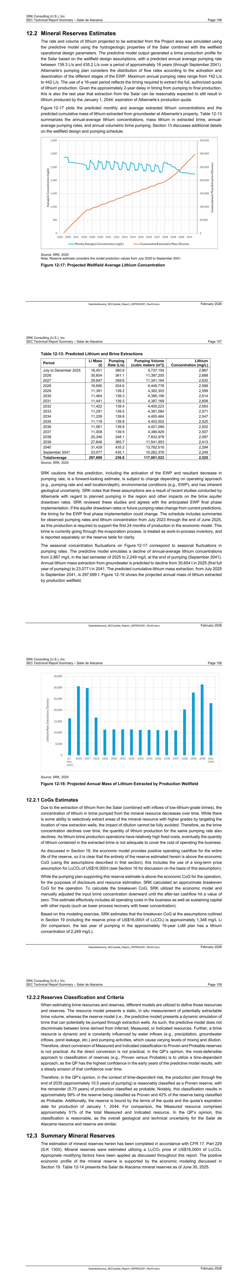 SRK Consulting (U.S.), Inc. SEC Technical Report Summary – Salar de Atacama Page 156 SalardeAtacama_SECUpdate_Report_USPR002291_Rev03.docx February 2026 12.2 Mineral Reserves Estimates The rate and volume of lithium projected to be extracted from the Project area was simulated using the predictive model using the hydrogeologic properties of the Salar combined with the wellfield operational design parameters. The predictive model output generated a brine production profile for the Salar based on the wellfield design assumptions, with a predicted annual average pumping rate between 139.3 L/s and 435.2 L/s over a period of approximately 16 years (through September 2041). Albemarle’s pumping plan considers the distribution of flow rates according to the activation and deactivation of the different stages of the EWP. Maximum annual pumping rates range from 142 L/s to 442 L/s. The use of a 16-year period reflects the timing required to extract the full, authorized quota of lithium production. Given the approximately 2-year delay in timing from pumping to final production, this is also the last year that extraction from the Salar can be reasonably expected to still result in lithium produced by the January 1, 2044, expiration of Albemarle’s production quota. Figure 12-17 plots the predicted monthly and average extracted lithium concentrations and the predicted cumulative mass of lithium extracted from groundwater at Albemarle’s property. Table 12-13 summarizes the annual-average lithium concentrations, mass lithium in extracted brine, annual- average pumping rates, and annual volumetric brine pumping. Section 13 discusses additional details on the wellfield design and pumping schedule. Source: SRK, 2025 Note: Reserve estimate considers the model prediction values from July 2025 to September 2041. Figure 12-17: Projected Wellfield Average Lithium Concentration SRK Consulting (U.S.), Inc. SEC Technical Report Summary – Salar de Atacama Page 157 SalardeAtacama_SECUpdate_Report_USPR002291_Rev03.docx February 2026 Table 12-13: Predicted Lithium and Brine Extractions Period Li Mass (t) Pumping Rate (L/s) Pumping Volume (cubic meters (m3)) Lithium Concentration (mg/L) July to December 2025 16,451 360.9 5,737,154 2,867 2026 30,604 361.1 11,387,205 2,688 2027 29,847 359.6 11,341,164 2,632 2028 16,690 204.6 6,449,776 2,588 2029 11,391 139.2 4,382,303 2,599 2030 11,464 139.3 4,385,156 2,614 2031 11,441 139.3 4,387,169 2,608 2032 11,422 139.4 4,405,223 2,593 2033 11,291 139.5 4,391,584 2,571 2034 11,209 139.8 4,400,464 2,547 2035 11,119 139.9 4,403,502 2,525 2036 11,061 139.9 4,421,069 2,502 2037 11,008 139.5 4,389,929 2,507 2038 20,346 248.1 7,832,978 2,597 2039 27,848 365.7 11,541,953 2,413 2040 31,429 435.2 13,762,516 2,284 September 2041 23,077 435.1 10,262,376 2,249 Total/average 297,699 236.8 117,881,523 2,525 Source: SRK, 2025 SRK cautions that this prediction, including the activation of the EWP and resultant decrease in pumping rate, is a forward-looking estimate, is subject to change depending on operating approach (e.g., pumping rate and well location/depth), environmental conditions (e.g., EWP), and has inherent geological uncertainty. SRK notes that these assumptions are a result of recent studies conducted by Albemarle with regard to planned pumping in the region and other impacts on the brine aquifer drawdown rates. SRK reviewed these studies and agrees with the anticipated EWP final phase implementation. If the aquifer drawdown rates or future pumping rates change from current predictions, the timing for the EWP final phase implementation could change. The schedule includes summaries for observed pumping rates and lithium concentration from July 2023 through the end of June 2025, as this production is required to support the first 24 months of production in the economic model. This brine is currently going through the evaporation process, is treated as work-in-process inventory, and is reported separately on the reserve table for clarity. The seasonal concentration fluctuations on Figure 12-17 correspond to seasonal fluctuations in pumping rates. The predictive model simulates a decline of annual-average lithium concentrations from 2,867 mg/L in the last semester of 2025 to 2,249 mg/L at the end of pumping (September 2041). Annual lithium mass extraction from groundwater is predicted to decline from 30,604 t in 2025 (first full year of pumping) to 23,077 t in 2041. The predicted cumulative lithium mass extraction, from July 2025 to September 2041, is 297,699 t. Figure 12-18 shows the projected annual mass of lithium extracted by production wellfield. SRK Consulting (U.S.), Inc. SEC Technical Report Summary – Salar de Atacama Page 158 SalardeAtacama_SECUpdate_Report_USPR002291_Rev03.docx February 2026 Source: SRK, 2025 Figure 12-18: Projected Annual Mass of Lithium Extracted by Production Wellfield 12.2.1 CoGs Estimates Due to the extraction of lithium from the Salar (combined with inflows of low-lithium-grade brines), the concentration of lithium in brine pumped from the mineral resource decreases over time. While there is some ability to selectively extract areas of the mineral resource with higher grades by targeting the location of new extraction wells, the impact of dilution cannot be fully avoided. Therefore, as the brine concentration declines over time, the quantity of lithium production for the same pumping rate also declines. As lithium brine production operations have relatively high fixed costs, eventually the quantity of lithium contained in the extracted brine is not adequate to cover the cost of operating the business. As discussed in Section 19, the economic model provides positive operating cashflow for the entire life of the reserve, so it is clear that the entirety of the reserve estimated herein is above the economic CoG (using the assumptions described in that section); this includes the use of a long-term price assumption for Li2CO3 of US$16,000/t (see Secti