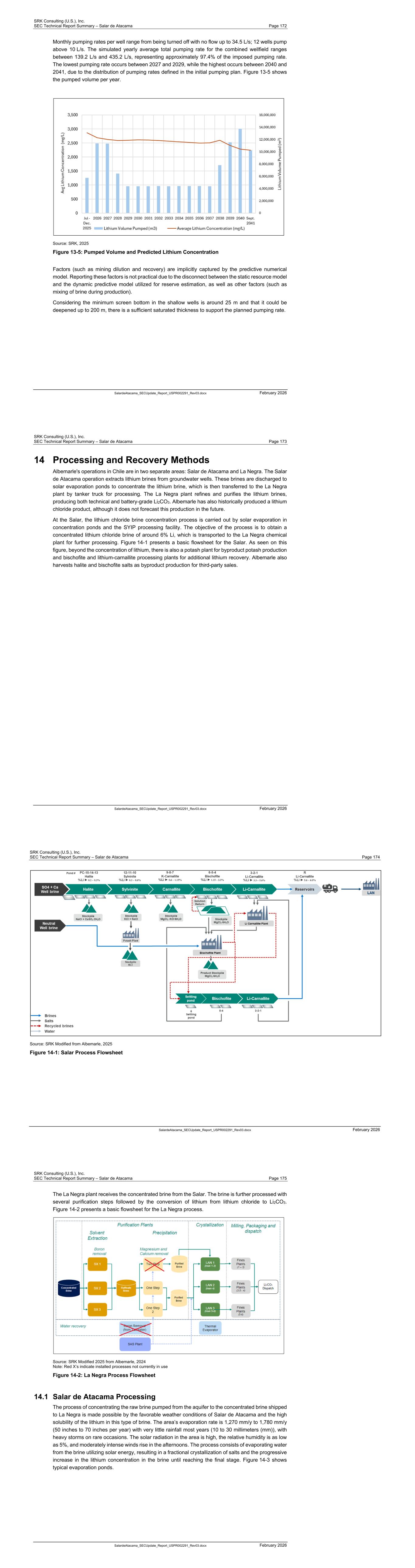 SRK Consulting (U.S.), Inc. SEC Technical Report Summary – Salar de Atacama Page 172 SalardeAtacama_SECUpdate_Report_USPR002291_Rev03.docx February 2026 Monthly pumping rates per well range from being turned off with no flow up to 34.5 L/s; 12 wells pump above 10 L/s. The simulated yearly average total pumping rate for the combined wellfield ranges between 139.2 L/s and 435.2 L/s, representing approximately 97.4% of the imposed pumping rate. The lowest pumping rate occurs between 2027 and 2029, while the highest occurs between 2040 and 2041, due to the distribution of pumping rates defined in the initial pumping plan. Figure 13-5 shows the pumped volume per year. Source: SRK, 2025 Figure 13-5: Pumped Volume and Predicted Lithium Concentration Factors (such as mining dilution and recovery) are implicitly captured by the predictive numerical model. Reporting these factors is not practical due to the disconnect between the static resource model and the dynamic predictive model utilized for reserve estimation, as well as other factors (such as mixing of brine during production). Considering the minimum screen bottom in the shallow wells is around 25 m and that it could be deepened up to 200 m, there is a sufficient saturated thickness to support the planned pumping rate. SRK Consulting (U.S.), Inc. SEC Technical Report Summary – Salar de Atacama Page 173 SalardeAtacama_SECUpdate_Report_USPR002291_Rev03.docx February 2026 14 Processing and Recovery Methods Albemarle's operations in Chile are in two separate areas: Salar de Atacama and La Negra. The Salar de Atacama operation extracts lithium brines from groundwater wells. These brines are discharged to solar evaporation ponds to concentrate the lithium brine, which is then transferred to the La Negra plant by tanker truck for processing. The La Negra plant refines and purifies the lithium brines, producing both technical and battery-grade Li2CO3. Albemarle has also historically produced a lithium chloride product, although it does not forecast this production in the future. At the Salar, the lithium chloride brine concentration process is carried out by solar evaporation in concentration ponds and the SYIP processing facility. The objective of the process is to obtain a concentrated lithium chloride brine of around 6% Li, which is transported to the La Negra chemical plant for further processing. Figure 14-1 presents a basic flowsheet for the Salar. As seen on this figure, beyond the concentration of lithium, there is also a potash plant for byproduct potash production and bischofite and lithium-carnallite processing plants for additional lithium recovery. Albemarle also harvests halite and bischofite salts as byproduct production for third-party sales. SRK Consulting (U.S.), Inc. SEC Technical Report Summary – Salar de Atacama Page 174 SalardeAtacama_SECUpdate_Report_USPR002291_Rev03.docx February 2026 Source: SRK Modified from Albemarle, 2025 Figure 14-1: Salar Process Flowsheet SRK Consulting (U.S.), Inc. SEC Technical Report Summary – Salar de Atacama Page 175 SalardeAtacama_SECUpdate_Report_USPR002291_Rev03.docx February 2026 The La Negra plant receives the concentrated brine from the Salar. The brine is further processed with several purification steps followed by the conversion of lithium from lithium chloride to Li2CO3. Figure 14-2 presents a basic flowsheet for the La Negra process. Source: SRK Modified 2025 from Albemarle, 2024 Note: Red X’s indicate installed processes not currently in use Figure 14-2: La Negra Process Flowsheet 14.1 Salar de Atacama Processing The process of concentrating the raw brine pumped from the aquifer to the concentrated brine shipped to La Negra is made possible by the favorable weather conditions of Salar de Atacama and the high solubility of the lithium in this type of brine. The area’s evaporation rate is 1,270 mm/y to 1,780 mm/y (50 inches to 70 inches per year) with very little rainfall most years (10 to 30 millimeters (mm)), with heavy storms on rare occasions. The solar radiation in the area is high, the relative humidity is as low as 5%, and moderately intense winds rise in the afternoons. The process consists of evaporating water from the brine utilizing solar energy, resulting in a fractional crystallization of salts and the progressive increase in the lithium concentration in the brine until reaching the final stage. Figure 14-3 shows typical evaporation ponds.