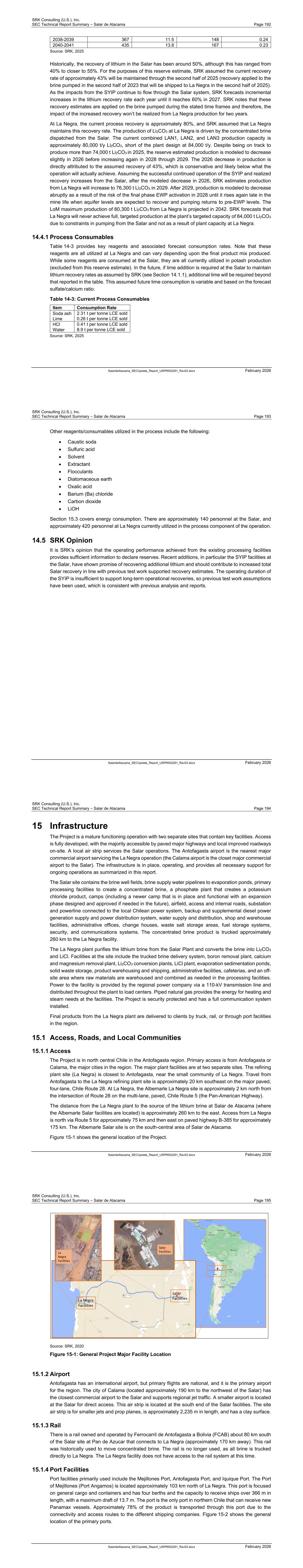 SRK Consulting (U.S.), Inc. SEC Technical Report Summary – Salar de Atacama Page 192 SalardeAtacama_SECUpdate_Report_USPR002291_Rev03.docx February 2026 2038-2039 367 11.5 148 0.24 2040-2041 435 13.8 167 0.23 Source: SRK, 2025 Historically, the recovery of lithium in the Salar has been around 50%, although this has ranged from 40% to closer to 55%. For the purposes of this reserve estimate, SRK assumed the current recovery rate of approximately 43% will be maintained through the second half of 2025 (recovery applied to the brine pumped in the second half of 2023 that will be shipped to La Negra in the second half of 2025). As the impacts from the SYIP continue to flow through the Salar system, SRK forecasts incremental increases in the lithium recovery rate each year until it reaches 60% in 2027. SRK notes that these recovery estimates are applied on the brine pumped during the stated time frames and therefore, the impact of the increased recovery won’t be realized from La Negra production for two years. At La Negra, the current process recovery is approximately 80%, and SRK assumed that La Negra maintains this recovery rate. The production of Li2CO3 at La Negra is driven by the concentrated brine dispatched from the Salar. The current combined LAN1, LAN2, and LAN3 production capacity is approximately 80,000 t/y Li2CO3, short of the plant design at 84,000 t/y. Despite being on track to produce more than 74,000 t Li2CO3 in 2025, the reserve estimated production is modeled to decrease slightly in 2026 before increasing again in 2028 through 2029. The 2026 decrease in production is directly attributed to the assumed recovery of 43%, which is conservative and likely below what the operation will actually achieve. Assuming the successful continued operation of the SYIP and realized recovery increases from the Salar, after the modeled decrease in 2026, SRK estimates production from La Negra will increase to 76,300 t Li2CO3 in 2029. After 2029, production is modeled to decrease abruptly as a result of the risk of the final phase EWP activation in 2028 until it rises again late in the mine life when aquifer levels are expected to recover and pumping returns to pre-EWP levels. The LoM maximum production of 80,300 t Li2CO3 from La Negra is projected in 2042. SRK forecasts that La Negra will never achieve full, targeted production at the plant’s targeted capacity of 84,000 t Li2CO3 due to constraints in pumping from the Salar and not as a result of plant capacity at La Negra. 14.4.1 Process Consumables Table 14-3 provides key reagents and associated forecast consumption rates. Note that these reagents are all utilized at La Negra and can vary depending upon the final product mix produced. While some reagents are consumed at the Salar, they are all currently utilized in potash production (excluded from this reserve estimate). In the future, if lime addition is required at the Salar to maintain lithium recovery rates as assumed by SRK (see Section 14.1.1), additional lime will be required beyond that reported in the table. This assumed future lime consumption is variable and based on the forecast sulfate/calcium ratio. Table 14-3: Current Process Consumables Item Consumption Rate Soda ash 2.31 t per tonne LCE sold Lime 0.26 t per tonne LCE sold HCl 0.41 t per tonne LCE sold Water 8.9 t per tonne LCE sold Source: SRK, 2025 SRK Consulting (U.S.), Inc. SEC Technical Report Summary – Salar de Atacama Page 193 SalardeAtacama_SECUpdate_Report_USPR002291_Rev03.docx February 2026 Other reagents/consumables utilized in the process include the following: Caustic soda Sulfuric acid Solvent Extractant Flocculants Diatomaceous earth Oxalic acid Barium (Ba) chloride Carbon dioxide LiOH Section 15.3 covers energy consumption. There are approximately 140 personnel at the Salar, and approximately 420 personnel at La Negra currently utilized in the process component of the operation. 14.5 SRK Opinion It is SRK’s opinion that the operating performance achieved from the existing processing facilities provides sufficient information to declare reserves. Recent additions, in particular the SYIP facilities at the Salar, have shown promise of recovering additional lithium and should contribute to increased total Salar recovery in line with previous test work supported recovery estimates. The operating duration of the SYIP is insufficient to support long-term operational recoveries, so previous test work assumptions have been used, which is consistent with previous analysis and reports. SRK Consulting (U.S.), Inc. SEC Technical Report Summary – Salar de Atacama Page 194 SalardeAtacama_SECUpdate_Report_USPR002291_Rev03.docx February 2026 15 Infrastructure The Project is a mature functioning operation with two separate sites that contain key facilities. Access is fully developed, with the majority accessible by paved major highways and local improved roadways on-site. A local air strip services the Salar operations. The Antofagasta airport is the nearest major commercial airport servicing the La Negra operation (the Calama airport is the closet major commercial airport to the Salar). The infrastructure is in place, operating, and provides all necessary support for ongoing operations as summarized in this report. The Salar site contains the brine well fields, brine supply water pipelines to evaporation ponds, primary processing facilities to create a concentrated brine, a phosphate plant that creates a potassium chloride product, camps (including a newer camp that is in place and functional with an expansion phase designed and approved if needed in the future), airfield, access and internal roads, substation and powerline connected to the local Chilean power system, backup and supplemental diesel power generation supply and power distribution system, water supply and distribution, shop and warehouse facilities, administrative offices, change houses, waste salt storage areas, fuel storage systems, security, and commu