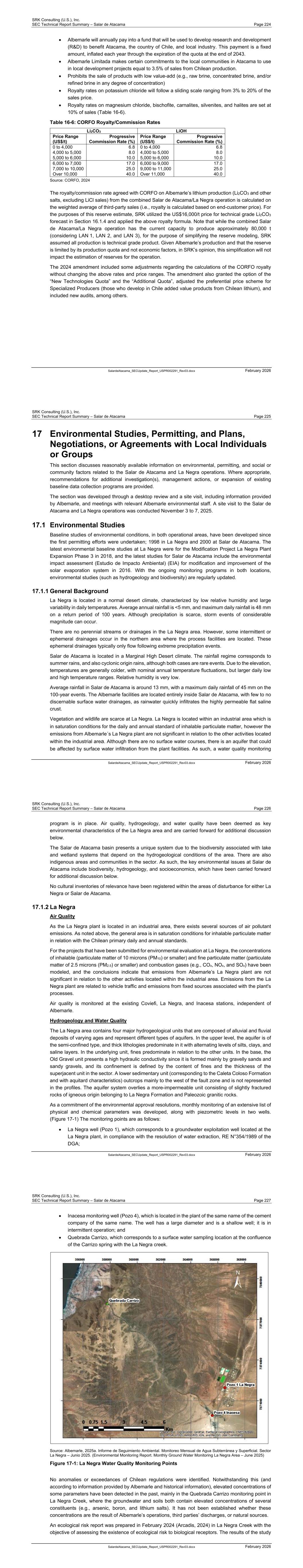 SRK Consulting (U.S.), Inc. SEC Technical Report Summary – Salar de Atacama Page 236 SalardeAtacama_SECUpdate_Report_USPR002291_Rev03.docx February 2026 Albemarle exploits brine from Salar de Atacama by means of extraction wells, with an authorized exploitation extraction rate of 442 L/s. As noted above, the extraction of brine and freshwater by Albemarle and other companies in the basin has the potential to cause groundwater levels to drop, which could impact lagoon and wetland systems of high ecological value. Albemarle has an environmental water monitoring plan (EWMP), a biodiversity monitoring plan, and an EWP, oriented to follow up on critical variables and prevent unexpected effects on these systems that are being monitored. These plans are described in the monitoring section. 17.1.7 Monitoring La Negra The monitoring at La Negra is related with the commitments from the main environmental approvals (RCA Nº46/1999 and RCA Nº 279/2017), according to the following details: RCA N°46/1999: monitoring points are La Negra well, Well Nº4 of INACESA, and a spring in Carrizo drainage. RCA N° 279/2017: five monitoring points are committed to when the TP-6 pond is built (not yet). Table 17-1 presents the parameters measured at the RCA N°46/1999 monitoring points. SRK Consulting (U.S.), Inc. SEC Technical Report Summary – Salar de Atacama Page 237 SalardeAtacama_SECUpdate_Report_USPR002291_Rev03.docx February 2026 Table 17-1: La Negra Water Monitoring Parameters Parameters Number of Monitoring Points Frequency Temperature pH Density Total alkalinity (reported expressed as CO3) Chlorine (Cl) SO4 Ca total Na total Mg total K total Li total B total Iron(III) (expressed as Fe2O3) In situ parameters Water level 8 Monthly pH (s.u.) EC Temperature1 In laboratory pH1 81 Monthly EC TDS Density1 Total alkalinity1 (reported expressed as CO3) Chlorine (Cl) dissolved SO4 dissolved 1 Bicarbonate (HCO3) dissolved Nitrate (NO3) dissolved Ca total1 and dissolved Na total1 and dissolved Mg total1 and dissolved K total1 and dissolved Li total1 B total1 Sr total Fe total Iron(III)1 (expressed as Fe2O3) Source: Albemarle, 2020c Salar de Atacama EWMP At Salar de Atacama, an EWMP has been implemented that includes meteorological, hydrological, and hydrogeological data from the Salar de Atacama core, its eastern and southern edges, and the Marginal Zone, where the Soncor, Aguas de Quelana, Peine, and La Punta-La Brava lagoon systems are located. These data are used to update the numerical model developed to evaluate the behavior and cumulative effects of the different brine and freshwater extraction projects that coexist in the Salar de Atacama area. SRK Consulting (U.S.), Inc. SEC Technical Report Summary – Salar de Atacama Page 238 SalardeAtacama_SECUpdate_Report_USPR002291_Rev03.docx February 2026 Monitoring is carried out in four sectors, determined according to their hydrological and hydrogeological characteristics: La Punta-La Brava areas Peine area North and east sides of Salar de Atacama Salar de Atacama area Table 17-2 presents a summary of the environmental variables and parameters. SRK Consulting (U.S.), Inc. SEC Technical Report Summary – Salar de Atacama Page 239 SalardeAtacama_SECUpdate_Report_USPR002291_Rev03.docx February 2026 Table 17-2: Salar de Atacama Environmental Monitoring Points Environment Component Environment Variable Parameters Number of Measurements Frequency Climate and meteorology Meteorological variables Daily precipitation (mm), atmospheric temperature (ºC), evaporation (mm), and atmospheric pressure (millibars (mbar)) 1 Daily (continuous) Hydrology Surface covered by lagoons Area of lagoon systems (m2) 4 Biannual Limnimetric level of the lagoons Water level (masl) 20 Monthly Surface flow rate Flow rate (L/s) 6 Quarterly Hydrogeology Evapotranspiration Evaporation rate (mm/day) 22 Quarterly Phreatic levels in brine and freshwater Depth level (masl) 125 Monthly Saline interface position Electrical conductivity (microsiemens per centimeter (µS/cm)) versus depth (masl) 13 Quarterly Brine and freshwater pumped flow Brine flow rate (L/s) 74 Monthly Industrial water flow rate (L/s) 3 Monthly Water quality Chemical quality of surface and groundwater Physical parameters in situ: pH, EC, temperature, TDS, and dissolved oxygen (DO) Laboratory physical-chemical parameters: pH, EC, TDS, and density Major elements: Cl, SO4, HCO3, NO3, Ca, Mg, Na, and K Minor elements and dissolved traces: B, Li, Sr Minor elements and total traces: aluminum (Al), As, B, Fe, Li, silicon (Si), Sr 40 Quarterly Source: Albemarle, 2020b; answers for internal audit by SRK