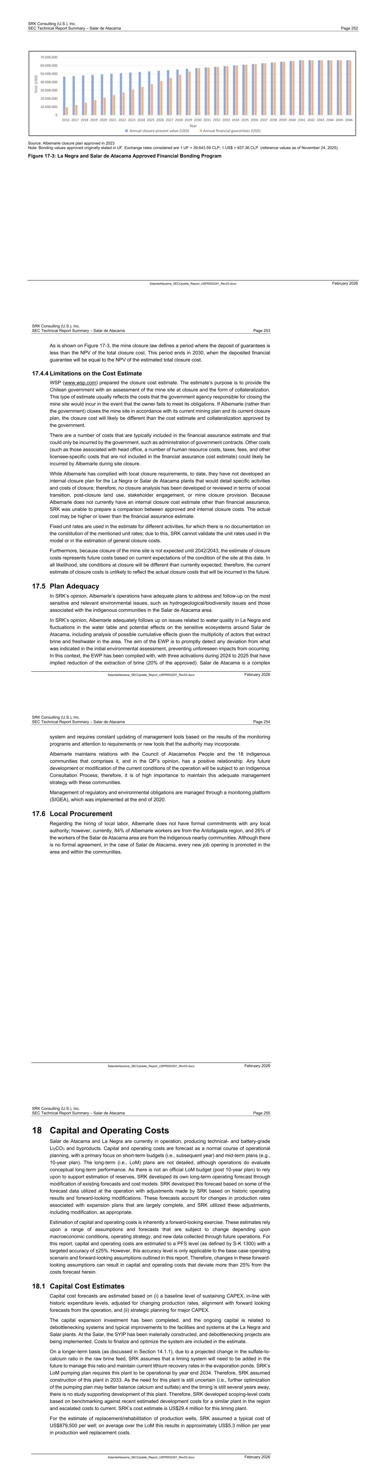 SRK Consulting (U.S.), Inc. SEC Technical Report Summary – Salar de Atacama Page 252 SalardeAtacama_SECUpdate_Report_USPR002291_Rev03.docx February 2026 Source: Albemarle closure plan approved in 2023 Note: Bonding values approved originally stated in UF. Exchange rates considered are 1 UF = 39,643.59 CLP; 1 US$ = 937.36 CLP. (reference values as of November 24, 2025). Figure 17-3: La Negra and Salar de Atacama Approved Financial Bonding Program SRK Consulting (U.S.), Inc. SEC Technical Report Summary – Salar de Atacama Page 253 SalardeAtacama_SECUpdate_Report_USPR002291_Rev03.docx February 2026 As is shown on Figure 17-3, the mine closure law defines a period where the deposit of guarantees is less than the NPV of the total closure cost. This period ends in 2030, when the deposited financial guarantee will be equal to the NPV of the estimated total closure cost. 17.4.4 Limitations on the Cost Estimate WSP (www.wsp.com) prepared the closure cost estimate. The estimate’s purpose is to provide the Chilean government with an assessment of the mine site at closure and the form of collateralization. This type of estimate usually reflects the costs that the government agency responsible for closing the mine site would incur in the event that the owner fails to meet its obligations. If Albemarle (rather than the government) closes the mine site in accordance with its current mining plan and its current closure plan, the closure cost will likely be different than the cost estimate and collateralization approved by the government. There are a number of costs that are typically included in the financial assurance estimate and that could only be incurred by the government, such as administration of government contracts. Other costs (such as those associated with head office, a number of human resource costs, taxes, fees, and other licensee-specific costs that are not included in the financial assurance cost estimate) could likely be incurred by Albemarle during site closure. While Albemarle has complied with local closure requirements, to date, they have not developed an internal closure plan for the La Negra or Salar de Atacama plants that would detail specific activities and costs of closure; therefore, no closure analysis has been developed or reviewed in terms of social transition, post-closure land use, stakeholder engagement, or mine closure provision. Because Albemarle does not currently have an internal closure cost estimate other than financial assurance, SRK was unable to prepare a comparison between approved and internal closure costs. The actual cost may be higher or lower than the financial assurance estimate. Fixed unit rates are used in the estimate for different activities, for which there is no documentation on the constitution of the mentioned unit rates; due to this, SRK cannot validate the unit rates used in the model or in the estimation of general closure costs. Furthermore, because closure of the mine site is not expected until 2042/2043, the estimate of closure costs represents future costs based on current expectations of the condition of the site at this date. In all likelihood, site conditions at closure will be different than currently expected; therefore, the current estimate of closure costs is unlikely to reflect the actual closure costs that will be incurred in the future. 17.5 Plan Adequacy In SRK’s opinion, Albemarle’s operations have adequate plans to address and follow-up on the most sensitive and relevant environmental issues, such as hydrogeological/biodiversity issues and those associated with the indigenous communities in the Salar de Atacama area. In SRK’s opinion, Albemarle adequately follows up on issues related to water quality in La Negra and fluctuations in the water table and potential effects on the sensitive ecosystems around Salar de Atacama, including analysis of possible cumulative effects given the multiplicity of actors that extract brine and freshwater in the area. The aim of the EWP is to promptly detect any deviation from what was indicated in the initial environmental assessment, preventing unforeseen impacts from occurring. In this context, the EWP has been complied with, with three activations during 2024 to 2025 that have implied reduction of the extraction of brine (20% of the approved). Salar de Atacama is a complex SRK Consulting (U.S.), Inc. SEC Technical Report Summary – Salar de Atacama Page 254 SalardeAtacama_SECUpdate_Report_USPR002291_Rev03.docx February 2026 system and requires constant updating of management tools based on the results of the monitoring programs and attention to requirements or new tools that the authority may incorporate. Albemarle maintains relations with the Council of Atacameños People and the 18 indigenous communities that comprises it, and in the QP’s opinion, has a positive relationship. Any future development or modification of the current conditions of the operation will be subject to an Indigenous Consultation Process; therefore, it is of high importance to maintain this adequate management strategy with these communities. Management of regulatory and environmental obligations are managed through a monitoring platform (SIGEA), which was implemented at the end of 2020. 17.6 Local Procurement Regarding the hiring of local labor, Albemarle does not have formal commitments with any local authority; however, currently, 84% of Albemarle workers are from the Antofagasta region, and 26% of the workers of the Salar de Atacama area are from the indigenous nearby communities. Although there is no formal agreement, in the case of Salar de Atacama, every new job opening is promoted in the area and within the communities. SRK Consulting (U.S.), Inc. SEC Technical Report Summary – Salar de Atacama Page 255 SalardeAtacama_SECUpdate_Report_USPR002291_Rev03.docx February 2026 18 Capital and Operating Costs Salar de Atacama and La Negra are currently in operation, producing technical- and battery-grade
