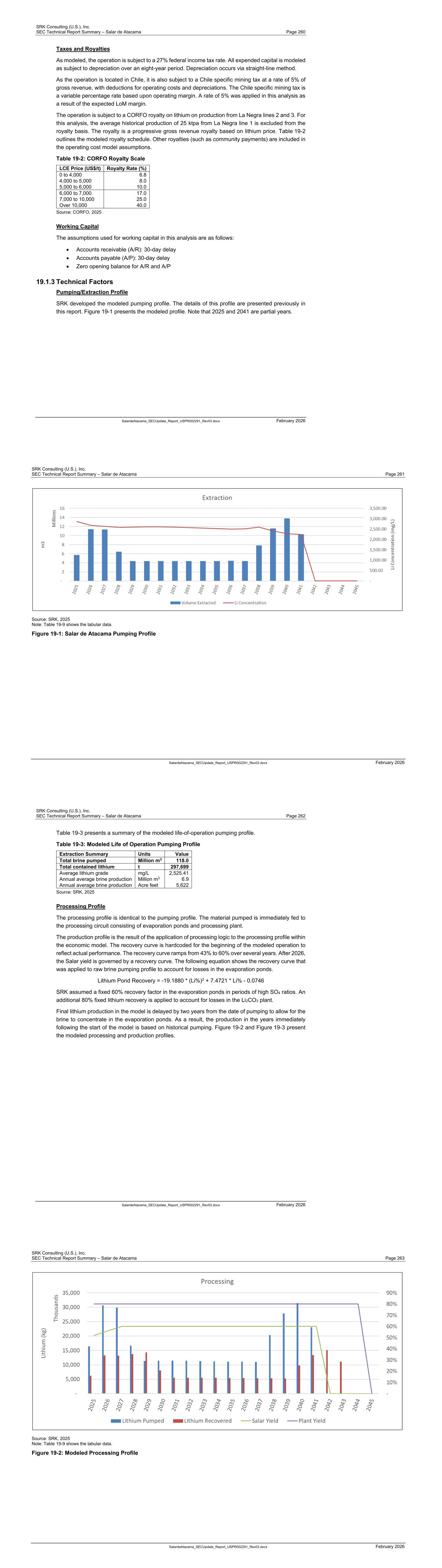 SRK Consulting (U.S.), Inc. SEC Technical Report Summary – Salar de Atacama Page 260 SalardeAtacama_SECUpdate_Report_USPR002291_Rev03.docx February 2026 Taxes and Royalties As modeled, the operation is subject to a 27% federal income tax rate. All expended capital is modeled as subject to depreciation over an eight-year period. Depreciation occurs via straight-line method. As the operation is located in Chile, it is also subject to a Chile specific mining tax at a rate of 5% of gross revenue, with deductions for operating costs and depreciations. The Chile specific mining tax is a variable percentage rate based upon operating margin. A rate of 5% was applied in this analysis as a result of the expected LoM margin. The operation is subject to a CORFO royalty on lithium on production from La Negra lines 2 and 3. For this analysis, the average historical production of 25 ktpa from La Negra line 1 is excluded from the royalty basis. The royalty is a progressive gross revenue royalty based on lithium price. Table 19-2 outlines the modeled royalty schedule. Other royalties (such as community payments) are included in the operating cost model assumptions. Table 19-2: CORFO Royalty Scale LCE Price (US$/t) Royalty Rate (%) 0 to 4,000 6.8 4,000 to 5,000 8.0 5,000 to 6,000 10.0 6,000 to 7,000 17.0 7,000 to 10,000 25.0 Over 10,000 40.0 Source: CORFO, 2025 Working Capital The assumptions used for working capital in this analysis are as follows: Accounts receivable (A/R): 30-day delay Accounts payable (A/P): 30-day delay Zero opening balance for A/R and A/P 19.1.3 Technical Factors Pumping/Extraction Profile SRK developed the modeled pumping profile. The details of this profile are presented previously in this report. Figure 19-1 presents the modeled profile. Note that 2025 and 2041 are partial years. SRK Consulting (U.S.), Inc. SEC Technical Report Summary – Salar de Atacama Page 261 SalardeAtacama_SECUpdate_Report_USPR002291_Rev03.docx February 2026 Source: SRK, 2025 Note: Table 19-9 shows the tabular data. Figure 19-1: Salar de Atacama Pumping Profile SRK Consulting (U.S.), Inc. SEC Technical Report Summary – Salar de Atacama Page 262 SalardeAtacama_SECUpdate_Report_USPR002291_Rev03.docx February 2026 Table 19-3 presents a summary of the modeled life-of-operation pumping profile. Table 19-3: Modeled Life of Operation Pumping Profile Extraction Summary Units Value Total brine pumped Million m3 118.0 Total contained lithium t 297,699 Average lithium grade mg/L 2,525.41 Annual average brine production Million m3 6.9 Annual average brine production Acre feet 5,622 Source: SRK, 2025 Processing Profile The processing profile is identical to the pumping profile. The material pumped is immediately fed to the processing circuit consisting of evaporation ponds and processing plant. The production profile is the result of the application of processing logic to the processing profile within the economic model. The recovery curve is hardcoded for the beginning of the modeled operation to reflect actual performance. The recovery curve ramps from 43% to 60% over several years. After 2026, the Salar yield is governed by a recovery curve. The following equation shows the recovery curve that was applied to raw brine pumping profile to account for losses in the evaporation ponds. Lithium Pond Recovery = -19.1880 * (Li%)2 + 7.4721 * Li% - 0.0746 SRK assumed a fixed 60% recovery factor in the evaporation ponds in periods of high SO4 ratios. An additional 80% fixed lithium recovery is applied to account for losses in the Li2CO3 plant. Final lithium production in the model is delayed by two years from the date of pumping to allow for the brine to concentrate in the evaporation ponds. As a result, the production in the years immediately following the start of the model is based on historical pumping. Figure 19-2 and Figure 19-3 present the modeled processing and production profiles. SRK Consulting (U.S.), Inc. SEC Technical Report Summary – Salar de Atacama Page 263 SalardeAtacama_SECUpdate_Report_USPR002291_Rev03.docx February 2026 Source: SRK, 2025 Note: Table 19-9 shows the tabular data. Figure 19-2: Modeled Processing Profile