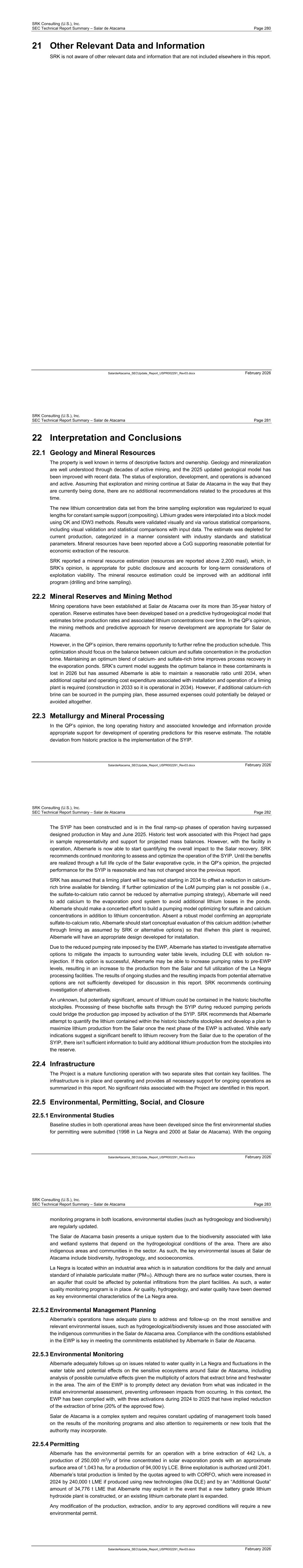 SRK Consulting (U.S.), Inc. SEC Technical Report Summary – Salar de Atacama Page 280 SalardeAtacama_SECUpdate_Report_USPR002291_Rev03.docx February 2026 21 Other Relevant Data and Information SRK is not aware of other relevant data and information that are not included elsewhere in this report. SRK Consulting (U.S.), Inc. SEC Technical Report Summary – Salar de Atacama Page 281 SalardeAtacama_SECUpdate_Report_USPR002291_Rev03.docx February 2026 22 Interpretation and Conclusions 22.1 Geology and Mineral Resources The property is well known in terms of descriptive factors and ownership. Geology and mineralization are well understood through decades of active mining, and the 2025 updated geological model has been improved with recent data. The status of exploration, development, and operations is advanced and active. Assuming that exploration and mining continue at Salar de Atacama in the way that they are currently being done, there are no additional recommendations related to the procedures at this time. The new lithium concentration data set from the brine sampling exploration was regularized to equal lengths for constant sample support (compositing). Lithium grades were interpolated into a block model using OK and IDW3 methods. Results were validated visually and via various statistical comparisons, including visual validation and statistical comparisons with input data. The estimate was depleted for current production, categorized in a manner consistent with industry standards and statistical parameters. Mineral resources have been reported above a CoG supporting reasonable potential for economic extraction of the resource. SRK reported a mineral resource estimation (resources are reported above 2,200 masl), which, in SRK’s opinion, is appropriate for public disclosure and accounts for long-term considerations of exploitation viability. The mineral resource estimation could be improved with an additional infill program (drilling and brine sampling). 22.2 Mineral Reserves and Mining Method Mining operations have been established at Salar de Atacama over its more than 35-year history of operation. Reserve estimates have been developed based on a predictive hydrogeological model that estimates brine production rates and associated lithium concentrations over time. In the QP’s opinion, the mining methods and predictive approach for reserve development are appropriate for Salar de Atacama. However, in the QP’s opinion, there remains opportunity to further refine the production schedule. This optimization should focus on the balance between calcium and sulfate concentration in the production brine. Maintaining an optimum blend of calcium- and sulfate-rich brine improves process recovery in the evaporation ponds. SRK’s current model suggests the optimum balance in these contaminants is lost in 2026 but has assumed Albemarle is able to maintain a reasonable ratio until 2034, when additional capital and operating cost expenditure associated with installation and operation of a liming plant is required (construction in 2033 so it is operational in 2034). However, if additional calcium-rich brine can be sourced in the pumping plan, these assumed expenses could potentially be delayed or avoided altogether. 22.3 Metallurgy and Mineral Processing In the QP’s opinion, the long operating history and associated knowledge and information provide appropriate support for development of operating predictions for this reserve estimate. The notable deviation from historic practice is the implementation of the SYIP. SRK Consulting (U.S.), Inc. SEC Technical Report Summary – Salar de Atacama Page 282 SalardeAtacama_SECUpdate_Report_USPR002291_Rev03.docx February 2026 The SYIP has been constructed and is in the final ramp-up phases of operation having surpassed designed production in May and June 2025. Historic test work associated with this Project had gaps in sample representativity and support for projected mass balances. However, with the facility in operation, Albemarle is now able to start quantifying the overall impact to the Salar recovery. SRK recommends continued monitoring to assess and optimize the operation of the SYIP. Until the benefits are realized through a full life cycle of the Salar evaporative cycle, in the QP’s opinion, the projected performance for the SYIP is reasonable and has not changed since the previous report. SRK has assumed that a liming plant will be required starting in 2034 to offset a reduction in calcium- rich brine available for blending. If further optimization of the LoM pumping plan is not possible (i.e., the sulfate-to-calcium ratio cannot be reduced by alternative pumping strategy), Albemarle will need to add calcium to the evaporation pond system to avoid additional lithium losses in the ponds. Albemarle should make a concerted effort to build a pumping model optimizing for sulfate and calcium concentrations in addition to lithium concentration. Absent a robust model confirming an appropriate sulfate-to-calcium ratio, Albemarle should start conceptual evaluation of this calcium addition (whether through liming as assumed by SRK or alternative options) so that if/when this plant is required, Albemarle will have an appropriate design developed for installation. Due to the reduced pumping rate imposed by the EWP, Albemarle has started to investigate alternative options to mitigate the impacts to surrounding water table levels, including DLE with solution re- injection. If this option is successful, Albemarle may be able to increase pumping rates to pre-EWP levels, resulting in an increase to the production from the Salar and full utilization of the La Negra processing facilities. The results of ongoing studies and the resulting impacts from potential alternative options are not sufficiently developed for discussion in this report. SRK recommends continuing investigation of alternatives. An unknown, but potentially significant, amount of lithium could be