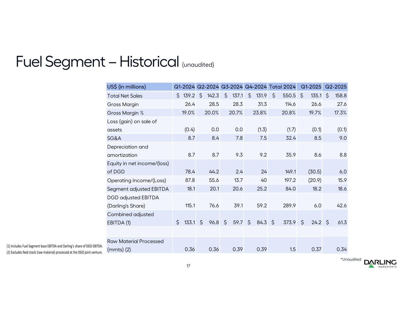 Food Segment – Historical (unaudited) 16 *Unaudited US$ (in millions) Q1-2024 Q2-2024 Q3-2024 Q4-2024 Total 2024 Q1-2025 Q2-2025 Total Net Sales $ 391.3 $ 378.8 $ 357.3 $ 361.7 $ 1,489.1 $ 349.2 $ 386.1 Gross Margin 93.1 102.1 85.4 93.1 373.8 102.5 103.9 Gross Margin % 23.8% 26.9% 23.9% 25.7% 25.1% 29.3% 26.9% Loss (gain) on sale of assets (0.3) 0.0 0.0 (1.6) (1.8) 0.1 0.0 SG&A 31.7 28.8 28.4 30.7 119.6 29.6 34.0 SG&A Margin % 8.1% 7.6% 7.9% 8.5% 8.0% 8.5% 8.8% Operating Income 32.8 45.8 30.3 35.7 144.7 41.4 42.6 Segment Adjusted EBITDA 61.7 73.2 57.0 64.0 255.9 70.9 69.9 Raw Material Processed (mmts) 0.30 0.30 0.31 0.32 1.23 0.33 0.32