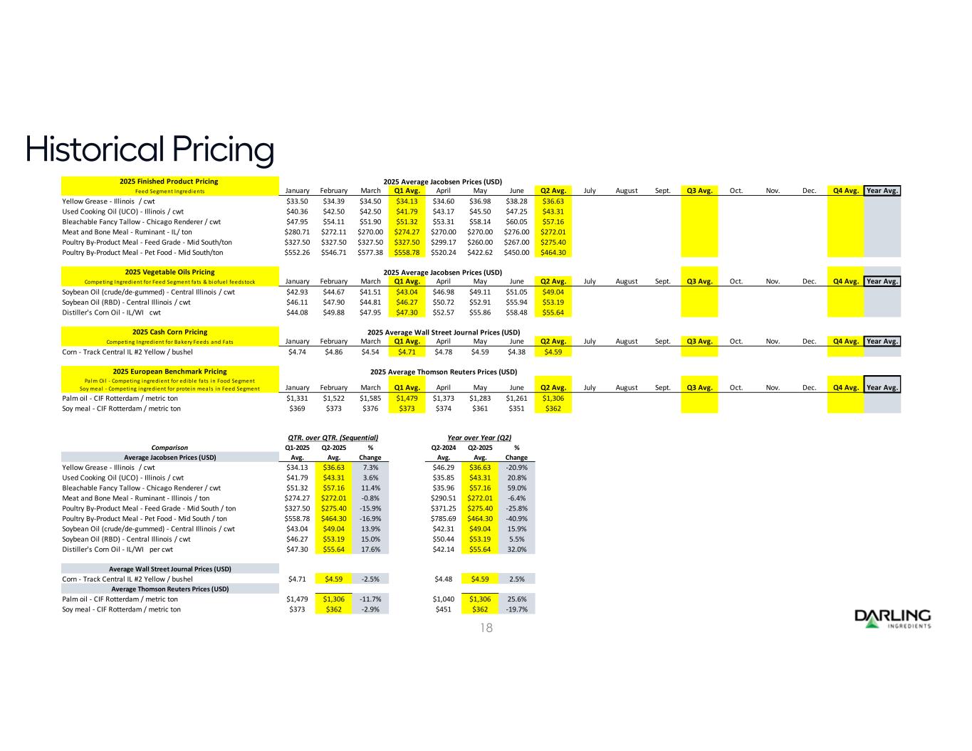 2025 Finished Product Pricing Feed Segment Ingredients January February March Q1 Avg. April May June Q2 Avg. July August Sept. Q3 Avg. Oct. Nov. Dec. Q4 Avg. Year Avg. Yellow Grease - Illinois / cwt $33.50 $34.39 $34.50 $34.13 $34.60 $36.98 $38.28 $36.63 Used Cooking Oil (UCO) - Illinois / cwt $40.36 $42.50 $42.50 $41.79 $43.17 $45.50 $47.25 $43.31 Bleachable Fancy Tallow - Chicago Renderer / cwt $47.95 $54.11 $51.90 $51.32 $53.31 $58.14 $60.05 $57.16 Meat and Bone Meal - Ruminant - IL/ ton $280.71 $272.11 $270.00 $274.27 $270.00 $270.00 $276.00 $272.01 Poultry By-Product Meal - Feed Grade - Mid South/ton $327.50 $327.50 $327.50 $327.50 $299.17 $260.00 $267.00 $275.40 Poultry By-Product Meal - Pet Food - Mid South/ton $552.26 $546.71 $577.38 $558.78 $520.24 $422.62 $450.00 $464.30 2025 Vegetable Oils Pricing Competing Ingredient for Feed Segment fa ts & biofuel feedstock January February March Q1 Avg. April May June Q2 Avg. July August Sept. Q3 Avg. Oct. Nov. Dec. Q4 Avg. Year Avg. Soybean Oil (crude/de-gummed) - Central Illinois / cwt $42.93 $44.67 $41.51 $43.04 $46.98 $49.11 $51.05 $49.04 Soybean Oil (RBD) - Central Illinois / cwt $46.11 $47.90 $44.81 $46.27 $50.72 $52.91 $55.94 $53.19 Distiller's Corn Oil - IL/WI cwt $44.08 $49.88 $47.95 $47.30 $52.57 $55.86 $58.48 $55.64 2025 Cash Corn Pricing Competing Ingredient for Bakery Feeds and Fats January February March Q1 Avg. April May June Q2 Avg. July August Sept. Q3 Avg. Oct. Nov. Dec. Q4 Avg. Year Avg. Corn - Track Central IL #2 Yellow / bushel $4.74 $4.86 $4.54 $4.71 $4.78 $4.59 $4.38 $4.59 2025 European Benchmark Pricing Pa lm Oi l - Competing ingredient for edible fats in Food Segment Soy meal - Competing ingredient for protein meals in Feed Segment January February March Q1 Avg. April May June Q2 Avg. July August Sept. Q3 Avg. Oct. Nov. Dec. Q4 Avg. Year Avg. Palm oil - CIF Rotterdam / metric ton $1,331 $1,522 $1,585 $1,479 $1,373 $1,283 $1,261 $1,306 Soy meal - CIF Rotterdam / metric ton $369 $373 $376 $373 $374 $361 $351 $362 QTR. over QTR. (Sequential) Year over Year (Q2) Comparison Q1-2025 Q2-2025 % Q2-2024 Q2-2025 % Average Jacobsen Prices (USD) Avg. Avg. Change Avg. Avg. Change Yellow Grease - Illinois / cwt $34.13 $36.63 7.3% $46.29 $36.63 -20.9% Used Cooking Oil (UCO) - Illinois / cwt $41.79 $43.31 3.6% $35.85 $43.31 20.8% Bleachable Fancy Tallow - Chicago Renderer / cwt $51.32 $57.16 11.4% $35.96 $57.16 59.0% Meat and Bone Meal - Ruminant - Illinois / ton $274.27 $272.01 -0.8% $290.51 $272.01 -6.4% Poultry By-Product Meal - Feed Grade - Mid South / ton $327.50 $275.40 -15.9% $371.25 $275.40 -25.8% Poultry By-Product Meal - Pet Food - Mid South / ton $558.78 $464.30 -16.9% $785.69 $464.30 -40.9% Soybean Oil (crude/de-gummed) - Central Illinois / cwt $43.04 $49.04 13.9% $42.31 $49.04 15.9% Soybean Oil (RBD) - Central Illinois / cwt $46.27 $53.19 15.0% $50.44 $53.19 5.5% Distiller's Corn Oil - IL/WI per cwt $47.30 $55.64 17.6% $42.14 $55.64 32.0% Average Wall Street Journal Prices (USD) Corn - Track Central IL #2 Yellow / bushel $4.71 $4.59 -2.5% $4.48 $4.59 2.5% Average Thomson Reuters Prices (USD) Palm oil - CIF Rotterdam / metric ton $1,479 $1,306 -11.7% $1,040 $1,306 25.6% Soy meal - CIF Rotterdam / metric ton $373 $362 -2.9% $451 $362 -19.7% 2025 Average Jacobsen Prices (USD) 2025 Average Jacobsen Prices (USD) 2025 Average Wall Street Journal Prices (USD) 2025 Average Thomson Reuters Prices (USD) 18 Historical Pricing