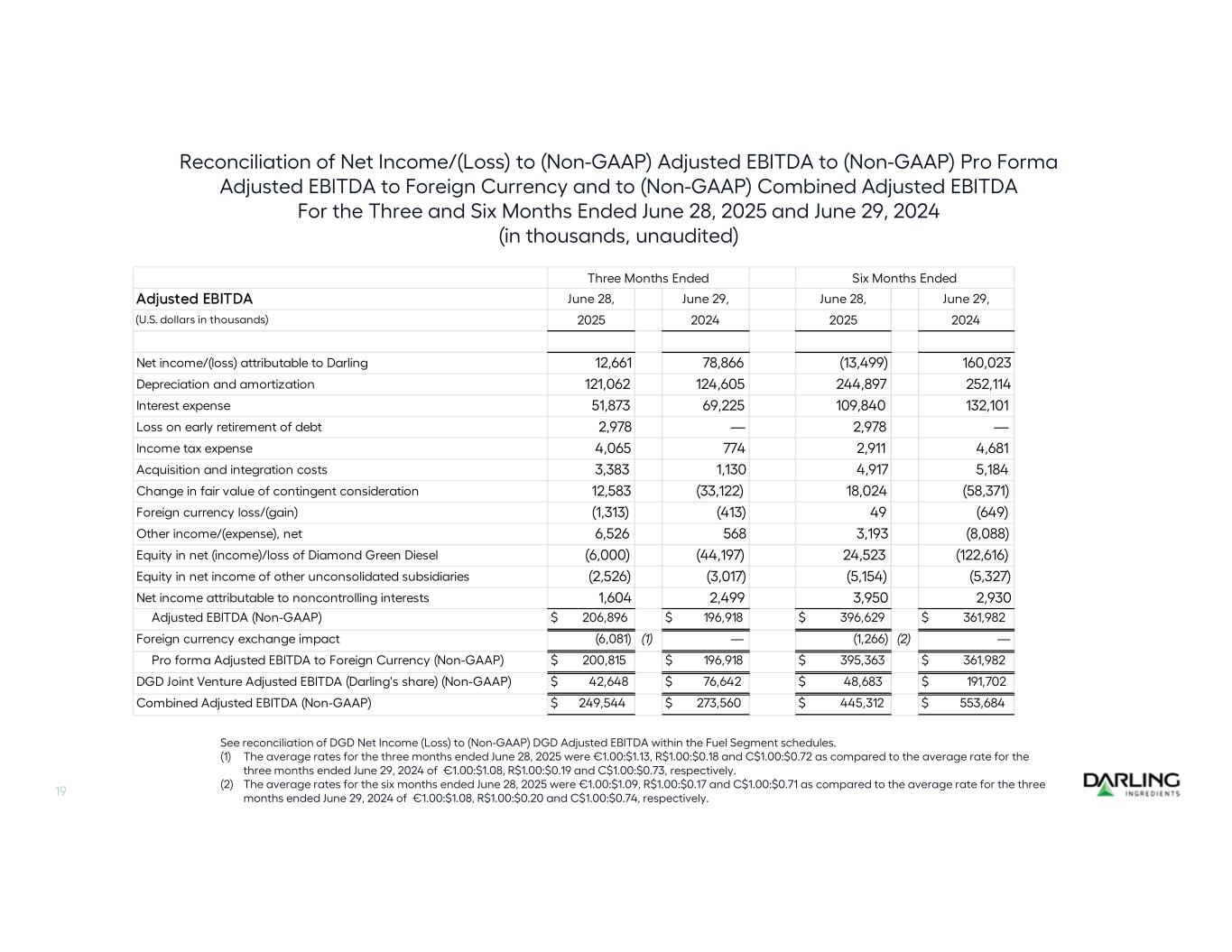 19 See reconciliation of DGD Net Income (Loss) to (Non-GAAP) DGD Adjusted EBITDA within the Fuel Segment schedules. (1) The average rates for the three months ended June 28, 2025 were €1.00:$1.13, R$1.00:$0.18 and C$1.00:$0.72 as compared to the average rate for the three months ended June 29, 2024 of €1.00:$1.08, R$1.00:$0.19 and C$1.00:$0.73, respectively. (2) The average rates for the six months ended June 28, 2025 were €1.00:$1.09, R$1.00:$0.17 and C$1.00:$0.71 as compared to the average rate for the three months ended June 29, 2024 of €1.00:$1.08, R$1.00:$0.20 and C$1.00:$0.74, respectively. Reconciliation of Net Income/(Loss) to (Non-GAAP) Adjusted EBITDA to (Non-GAAP) Pro Forma Adjusted EBITDA to Foreign Currency and to (Non-GAAP) Combined Adjusted EBITDA For the Three and Six Months Ended June 28, 2025 and June 29, 2024 (in thousands, unaudited) Adjusted EBITDA June 28, June 29, June 28, June 29, (U.S. dollars in thousands) 2025 2024 2025 2024 Net income/(loss) attributable to Darling 12,661 78,866 (13,499) 160,023 Depreciation and amortization 121,062 124,605 244,897 252,114 Interest expense 51,873 69,225 109,840 132,101 Loss on early retirement of debt 2,978 — 2,978 — Income tax expense 4,065 774 2,911 4,681 Acquisition and integration costs 3,383 1,130 4,917 5,184 Change in fair value of contingent consideration 12,583 (33,122) 18,024 (58,371) Foreign currency loss/(gain) (1,313) (413) 49 (649) Other income/(expense), net 6,526 568 3,193 (8,088) Equity in net (income)/loss of Diamond Green Diesel (6,000) (44,197) 24,523 (122,616) Equity in net income of other unconsolidated subsidiaries (2,526) (3,017) (5,154) (5,327) Net income attributable to noncontrolling interests 1,604 2,499 3,950 2,930 Adjusted EBITDA (Non-GAAP) $ 206,896 $ 196,918 $ 396,629 $ 361,982 Foreign currency exchange impact (6,081) (1) — (1,266) (2) — Pro forma Adjusted EBITDA to Foreign Currency (Non-GAAP) $ 200,815 $ 196,918 $ 395,363 $ 361,982 DGD Joint Venture Adjusted EBITDA (Darling's share) (Non-GAAP) $ 42,648 $ 76,642 $ 48,683 $ 191,702 Combined Adjusted EBITDA (Non-GAAP) $ 249,544 $ 273,560 $ 445,312 $ 553,684 Three Months Ended Six Months Ended