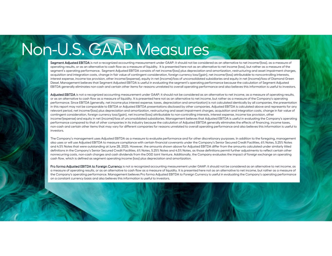 Presentation title on one to three lines Segment Adjusted EBITDA is not a recognized accounting measurement under GAAP; it should not be considered as an alternative to net income/(loss), as a measure of operating results, or as an alternative to cash flow as a measure of liquidity. It is presented here not as an alternative to net income (loss), but rather as a measure of the segment’s operating performance. Segment Adjusted EBITDA consists of net income/(loss) plus depreciation and amortization, restructuring and asset impairment charges, acquisition and integration costs, change in fair value of contingent consideration, foreign currency loss/(gain), net income/(loss) attributable to noncontrolling interests, interest expense, income tax provision, other income/(expense), equity in net (income)/loss of unconsolidated subsidiaries and equity in net (income)/loss of Diamond Green Diesel. Management believes that Segment Adjusted EBITDA is useful in evaluating the segment’s operating performance because the calculation of Segment Adjusted EBITDA generally eliminates non-cash and certain other items for reasons unrelated to overall operating performance and also believes this information is useful to investors. Adjusted EBITDA is not a recognized accounting measurement under GAAP; it should not be considered as an alternative to net income, as a measure of operating results, or as an alternative to cash flow as a measure of liquidity. It is presented here not as an alternative to net income, but rather as a measure of the Company's operating performance. Since EBITDA (generally, net income plus interest expense, taxes, depreciation and amortization) is not calculated identically by all companies, the presentation in this report may not be comparable to EBITDA or Adjusted EBITDA presentations disclosed by other companies. Adjusted EBITDA is calculated above and represents for any relevant period, net income/(loss) plus depreciation and amortization, restructuring and asset impairment charges, acquisition and integration costs, change in fair value of contingent consideration, foreign currency loss/(gain), net income/(loss) attributable to non-controlling interests, interest expense, income tax provision, other income/(expense) and equity in net (income)/loss of unconsolidated subsidiaries. Management believes that Adjusted EBITDA is useful in evaluating the Company's operating performance compared to that of other companies in its industry because the calculation of Adjusted EBITDA generally eliminates the effects of financing, income taxes, non-cash and certain other items that may vary for different companies for reasons unrelated to overall operating performance and also believes this information is useful to investors. The Company’s management uses Adjusted EBITDA as a measure to evaluate performance and for other discretionary purposes. In addition to the foregoing, management also uses or will use Adjusted EBITDA to measure compliance with certain financial covenants under the Company’s Senior Secured Credit Facilities, 6% Notes, 5.25% Notes and 4.5% Notes that were outstanding at June 28, 2025. However, the amounts shown above for Adjusted EBITDA differ from the amounts calculated under similarly titled definitions in the Company’s Senior Secured Credit Facilities, 6% Notes, 5.25% Notes and 4.5% Notes, as those definitions permit further adjustments to reflect certain other nonrecurring costs, non-cash charges and cash dividends from the DGD Joint Venture. Additionally, the Company evaluates the impact of foreign exchange on operating cash flow, which is defined as segment operating income (loss) plus depreciation and amortization. Pro forma Adjusted EBITDA to Foreign Currency is not a recognized accounting measurement under GAAP; it should not be considered as an alternative to net income, as a measure of operating results, or as an alternative to cash flow as a measure of liquidity. It is presented here not as an alternative to net income, but rather as a measure of the Company's operating performance. Management believes Pro forma Adjusted EBITDA to Foreign Currency is useful in evaluating the Company’s operating performance on a constant currency basis and also believes this information is useful to investors. Non-U.S. GAAP Measures