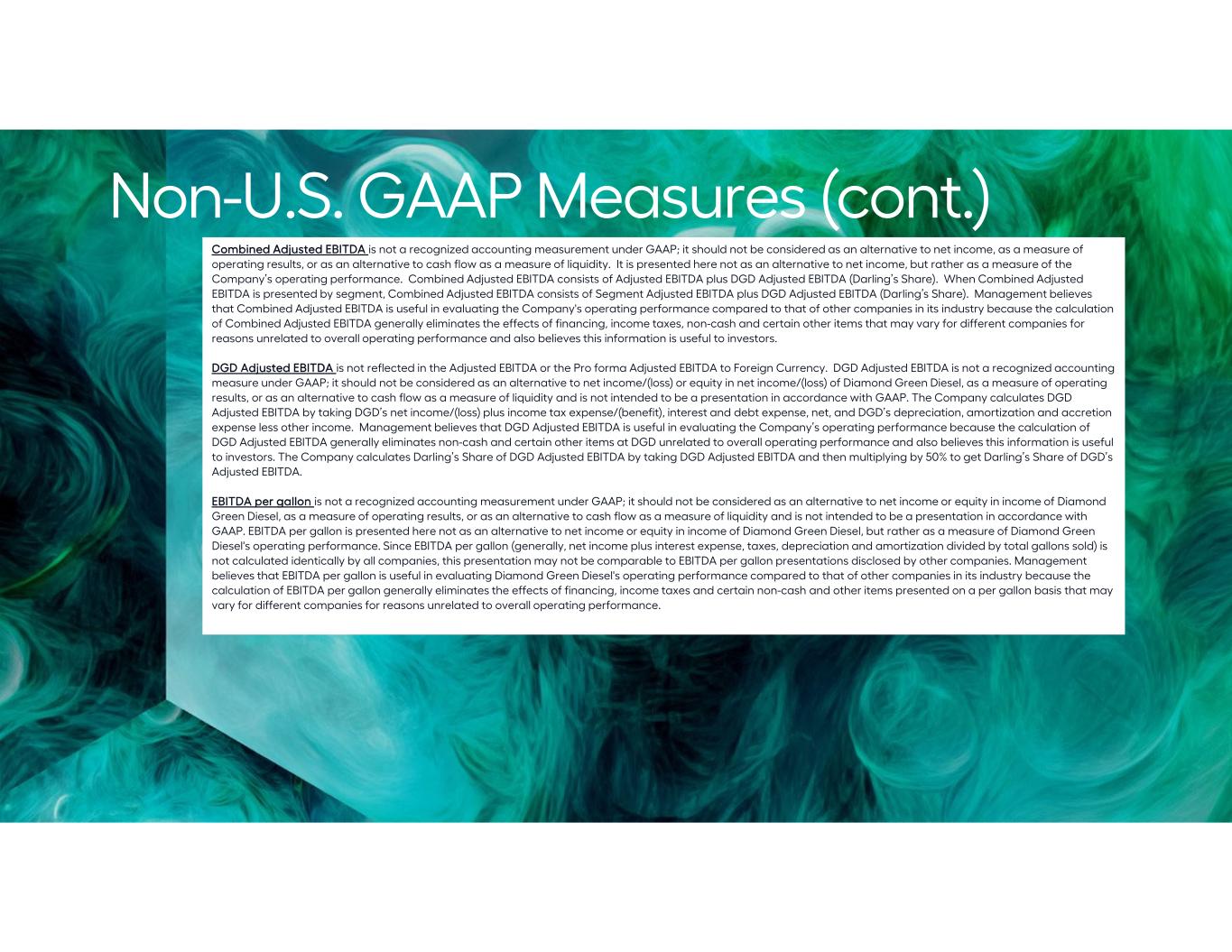 Presentation title on one to three lines Non-U.S. GAAP Measures (cont.) Combined Adjusted EBITDA is not a recognized accounting measurement under GAAP; it should not be considered as an alternative to net income, as a measure of operating results, or as an alternative to cash flow as a measure of liquidity. It is presented here not as an alternative to net income, but rather as a measure of the Company’s operating performance. Combined Adjusted EBITDA consists of Adjusted EBITDA plus DGD Adjusted EBITDA (Darling’s Share). When Combined Adjusted EBITDA is presented by segment, Combined Adjusted EBITDA consists of Segment Adjusted EBITDA plus DGD Adjusted EBITDA (Darling’s Share). Management believes that Combined Adjusted EBITDA is useful in evaluating the Company's operating performance compared to that of other companies in its industry because the calculation of Combined Adjusted EBITDA generally eliminates the effects of financing, income taxes, non-cash and certain other items that may vary for different companies for reasons unrelated to overall operating performance and also believes this information is useful to investors. DGD Adjusted EBITDA is not reflected in the Adjusted EBITDA or the Pro forma Adjusted EBITDA to Foreign Currency. DGD Adjusted EBITDA is not a recognized accounting measure under GAAP; it should not be considered as an alternative to net income/(loss) or equity in net income/(loss) of Diamond Green Diesel, as a measure of operating results, or as an alternative to cash flow as a measure of liquidity and is not intended to be a presentation in accordance with GAAP. The Company calculates DGD Adjusted EBITDA by taking DGD’s net income/(loss) plus income tax expense/(benefit), interest and debt expense, net, and DGD’s depreciation, amortization and accretion expense less other income. Management believes that DGD Adjusted EBITDA is useful in evaluating the Company’s operating performance because the calculation of DGD Adjusted EBITDA generally eliminates non-cash and certain other items at DGD unrelated to overall operating performance and also believes this information is useful to investors. The Company calculates Darling’s Share of DGD Adjusted EBITDA by taking DGD Adjusted EBITDA and then multiplying by 50% to get Darling’s Share of DGD’s Adjusted EBITDA. EBITDA per gallon is not a recognized accounting measurement under GAAP; it should not be considered as an alternative to net income or equity in income of Diamond Green Diesel, as a measure of operating results, or as an alternative to cash flow as a measure of liquidity and is not intended to be a presentation in accordance with GAAP. EBITDA per gallon is presented here not as an alternative to net income or equity in income of Diamond Green Diesel, but rather as a measure of Diamond Green Diesel's operating performance. Since EBITDA per gallon (generally, net income plus interest expense, taxes, depreciation and amortization divided by total gallons sold) is not calculated identically by all companies, this presentation may not be comparable to EBITDA per gallon presentations disclosed by other companies. Management believes that EBITDA per gallon is useful in evaluating Diamond Green Diesel's operating performance compared to that of other companies in its industry because the calculation of EBITDA per gallon generally eliminates the effects of financing, income taxes and certain non-cash and other items presented on a per gallon basis that may vary for different companies for reasons unrelated to overall operating performance.
