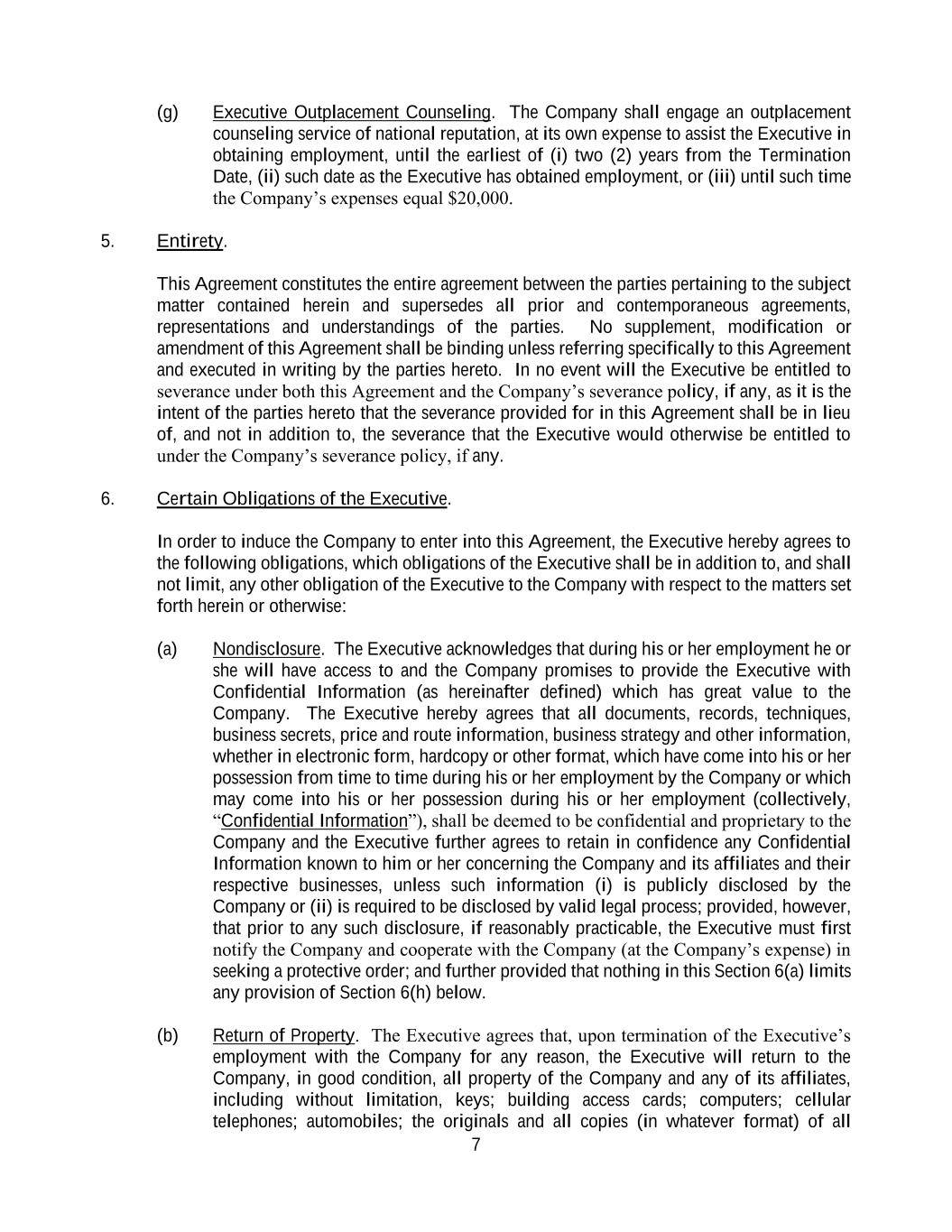 7 (g) Executive Outplacement Counseling. The Company shall engage an outplacement counseling service of national reputation, at its own expense to assist the Executive in obtaining employment, until the earliest of (i) two (2) years from the Termination Date, (ii) such date as the Executive has obtained employment, or (iii) until such time the Company’s expenses equal $20,000. 5. Entirety. This Agreement constitutes the entire agreement between the parties pertaining to the subject matter contained herein and supersedes all prior and contemporaneous agreements, representations and understandings of the parties. No supplement, modification or amendment of this Agreement shall be binding unless referring specifically to this Agreement and executed in writing by the parties hereto. In no event will the Executive be entitled to severance under both this Agreement and the Company’s severance policy, if any, as it is the intent of the parties hereto that the severance provided for in this Agreement shall be in lieu of, and not in addition to, the severance that the Executive would otherwise be entitled to under the Company’s severance policy, if any. 6. Certain Obligations of the Executive. In order to induce the Company to enter into this Agreement, the Executive hereby agrees to the following obligations, which obligations of the Executive shall be in addition to, and shall not limit, any other obligation of the Executive to the Company with respect to the matters set forth herein or otherwise: (a) Nondisclosure. The Executive acknowledges that during his or her employment he or she will have access to and the Company promises to provide the Executive with Confidential Information (as hereinafter defined) which has great value to the Company. The Executive hereby agrees that all documents, records, techniques, business secrets, price and route information, business strategy and other information, whether in electronic form, hardcopy or other format, which have come into his or her possession from time to time during his or her employment by the Company or which may come into his or her possession during his or her employment (collectively, “Confidential Information”), shall be deemed to be confidential and proprietary to the Company and the Executive further agrees to retain in confidence any Confidential Information known to him or her concerning the Company and its affiliates and their respective businesses, unless such information (i) is publicly disclosed by the Company or (ii) is required to be disclosed by valid legal process; provided, however, that prior to any such disclosure, if reasonably practicable, the Executive must first notify the Company and cooperate with the Company (at the Company’s expense) in seeking a protective order; and further provided that nothing in this Section 6(a) limits any provision of Section 6(h) below. (b) Return of Property. The Executive agrees that, upon termination of the Executive’s employment with the Company for any reason, the Executive will return to the Company, in good condition, all property of the Company and any of its affiliates, including without limitation, keys; building access cards; computers; cellular telephones; automobiles; the originals and all copies (in whatever format) of all