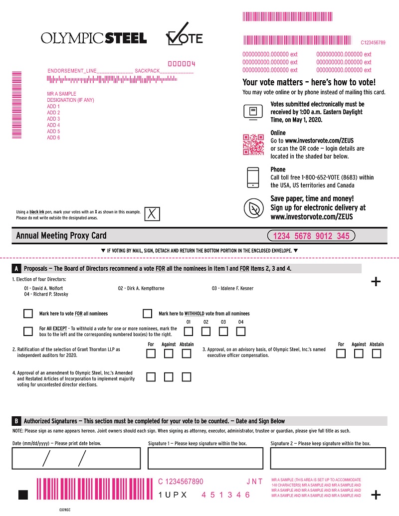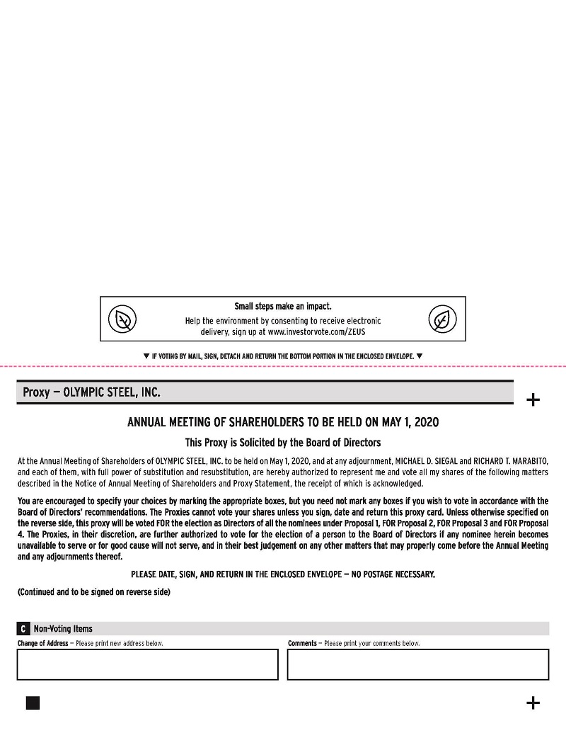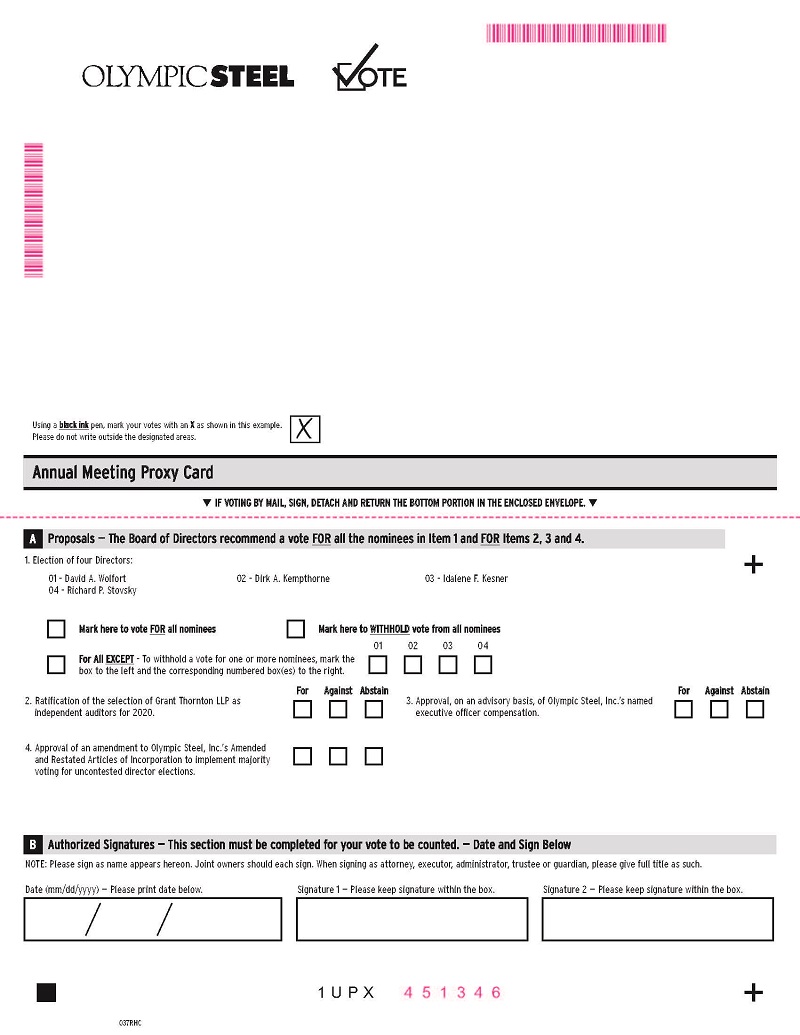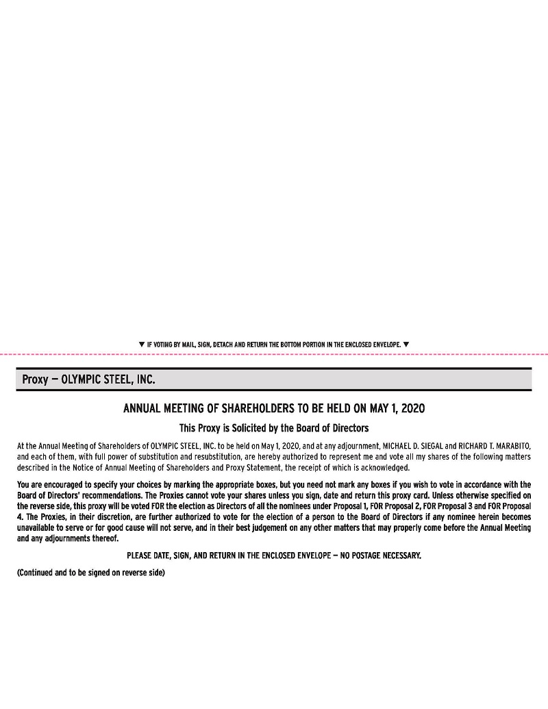 You are asked to: (1) approve the election of Directors nominated by the Board of Directors; (2) ratify the selection of Olympic Steel, Inc.’s independent auditors for the year ending December 31, 2020; (3) approve, on an advisory basis, our named executive officer compensation; and (4) approve an amendment to the Company’s Amended and Restated Articles of Incorporation to implement majority voting for uncontested director elections. Your Board of Directors unanimously recommends that you vote “FOR” all of the Director nominees nominated by the Board of Directors and “FOR” all other proposals. Please carefully review the Proxy Statement and then complete and sign your Proxy and return it promptly. If you attend the meeting and decide to vote in person, you may withdraw your Proxy at the meeting.