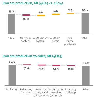 | • Iron ore production totaled 90.4 Mt in Q4, 6% (5.1 Mt) higher y/y, driven by Brucutu’s robust performance and the continued ramp-up of the Capanema and VGR1 projects. Pellets output totaled 8.3 Mt in Q4, 9% (0.8 Mt) lower y/y, reflecting market conditions. Iron ore sales reached 84.9 Mt in Q4, up 5% (3.7 Mt) y/y, consistent with higher production volumes. | ||