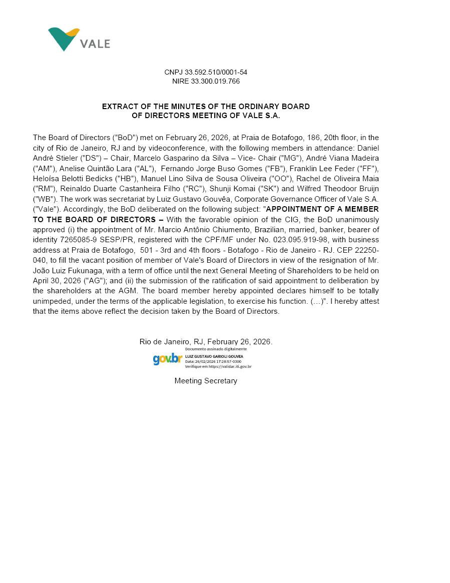 CNPJ 33.592.510/0001-54 NIRE 33.300.019.766 EXTRACT OF THE MINUTES OF THE ORDINARY BOARD OF DIRECTORS MEETING OF VALE S.A. The Board of Directors ("BoD") met on February 26, 2026, at Praia de Botafogo, 186, 20th floor, in the city of Rio de Janeiro, RJ and by videoconference, with the following members in attendance: Daniel André Stieler ("DS") – Chair, Marcelo Gasparino da Silva – Vice- Chair ("MG"), André Viana Madeira ("AM"), Anelise Quintão Lara ("AL"), Fernando Jorge Buso Gomes ("FB"), Franklin Lee Feder ("FF"), Heloísa Belotti Bedicks ("HB"), Manuel Lino Silva de Sousa Oliveira ("OO"), Rachel de Oliveira Maia ("RM"), Reinaldo Duarte Castanheira Filho ("RC"), Shunji Komai ("SK") and Wilfred Theodoor Bruijn ("WB"). The work was secretariat by Luiz Gustavo Gouvêa, Corporate Governance Officer of Vale S.A. ("Vale"). Accordingly, the BoD deliberated on the following subject: "APPOINTMENT OF A MEMBER TO THE BOARD OF DIRECTORS – With the favorable opinion of the CIG, the BoD unanimously approved (i) the appointment of Mr. Marcio Antônio Chiumento, Brazilian, married, banker, bearer of identity 7265085-9 SESP/PR, registered with the CPF/MF under No. 023.095.919-98, with business address at Praia de Botafogo, 501 - 3rd and 4th floors - Botafogo - Rio de Janeiro - RJ. CEP 22250- 040, to fill the vacant position of member of Vale's Board of Directors in view of the resignation of Mr. João Luiz Fukunaga, with a term of office until the next General Meeting of Shareholders to be held on April 30, 2026 ("AG"); and (ii) the submission of the ratification of said appointment to deliberation by the shareholders at the AGM. The board member hereby appointed declares himself to be totally unimpeded, under the terms of the applicable legislation, to exercise his function. (…)". I hereby attest that the items above reflect the decision taken by the Board of Directors. Rio de Janeiro, RJ, February 26, 2026. Luiz Gustavo Gouvêa Meeting Secretary