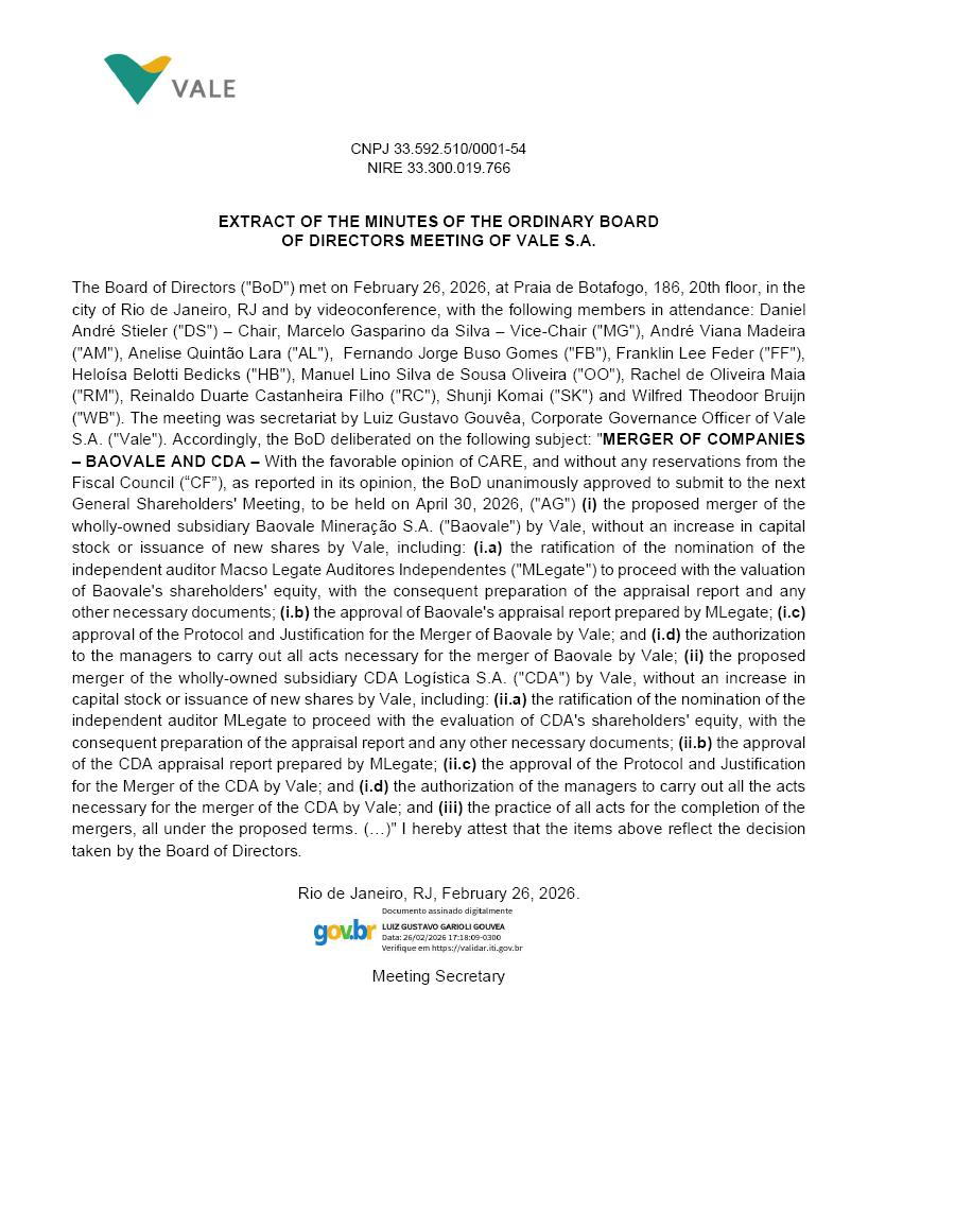 CNPJ 33.592.510/0001-54 NIRE 33.300.019.766 EXTRACT OF THE MINUTES OF THE ORDINARY BOARD OF DIRECTORS MEETING OF VALE S.A. The Board of Directors ("BoD") met on February 26, 2026, at Praia de Botafogo, 186, 20th floor, in the city of Rio de Janeiro, RJ and by videoconference, with the following members in attendance: Daniel André Stieler ("DS") – Chair, Marcelo Gasparino da Silva – Vice-Chair ("MG"), André Viana Madeira ("AM"), Anelise Quintão Lara ("AL"), Fernando Jorge Buso Gomes ("FB"), Franklin Lee Feder ("FF"), Heloísa Belotti Bedicks ("HB"), Manuel Lino Silva de Sousa Oliveira ("OO"), Rachel de Oliveira Maia ("RM"), Reinaldo Duarte Castanheira Filho ("RC"), Shunji Komai ("SK") and Wilfred Theodoor Bruijn ("WB"). The meeting was secretariat by Luiz Gustavo Gouvêa, Corporate Governance Officer of Vale S.A. ("Vale"). Accordingly, the BoD deliberated on the following subject: "MERGER OF COMPANIES – BAOVALE AND CDA – With the favorable opinion of CARE, and without any reservations from the Fiscal Council (“CF”), as reported in its opinion, the BoD unanimously approved to submit to the next General Shareholders' Meeting, to be held on April 30, 2026, ("AG") (i) the proposed merger of the wholly-owned subsidiary Baovale Mineração S.A. ("Baovale") by Vale, without an increase in capital stock or issuance of new shares by Vale, including: (i.a) the ratification of the nomination of the independent auditor Macso Legate Auditores Independentes ("MLegate") to proceed with the valuation of Baovale's shareholders' equity, with the consequent preparation of the appraisal report and any other necessary documents; (i.b) the approval of Baovale's appraisal report prepared by MLegate; (i.c) approval of the Protocol and Justification for the Merger of Baovale by Vale; and (i.d) the authorization to the managers to carry out all acts necessary for the merger of Baovale by Vale; (ii) the proposed merger of the wholly-owned subsidiary CDA Logística S.A. ("CDA") by Vale, without an increase in capital stock or issuance of new shares by Vale, including: (ii.a) the ratification of the nomination of the independent auditor MLegate to proceed with the evaluation of CDA's shareholders' equity, with the consequent preparation of the appraisal report and any other necessary documents; (ii.b) the approval of the CDA appraisal report prepared by MLegate; (ii.c) the approval of the Protocol and Justification for the Merger of the CDA by Vale; and (i.d) the authorization of the managers to carry out all the acts necessary for the merger of the CDA by Vale; and (iii) the practice of all acts for the completion of the mergers, all under the proposed terms. (…)" I hereby attest that the items above reflect the decision taken by the Board of Directors. Rio de Janeiro, RJ, February 26, 2026. Luiz Gustavo Gouvêa Meeting Secretary