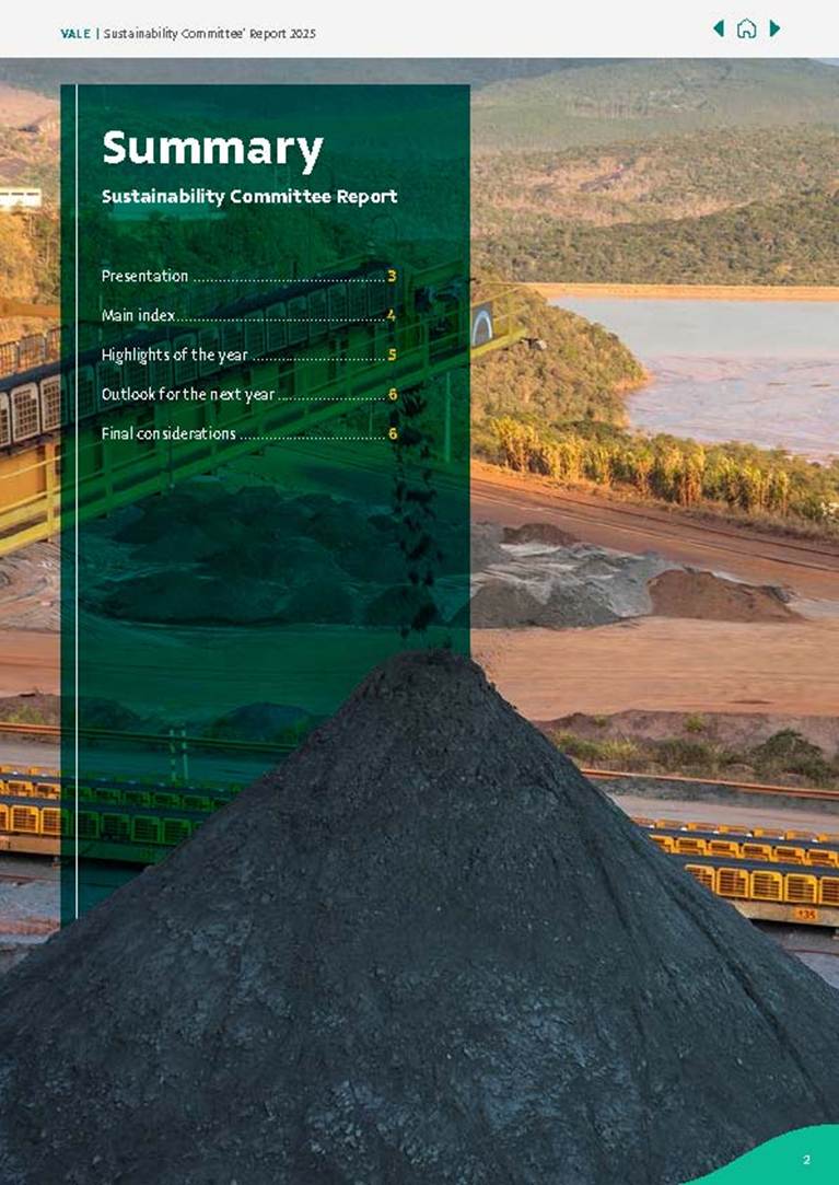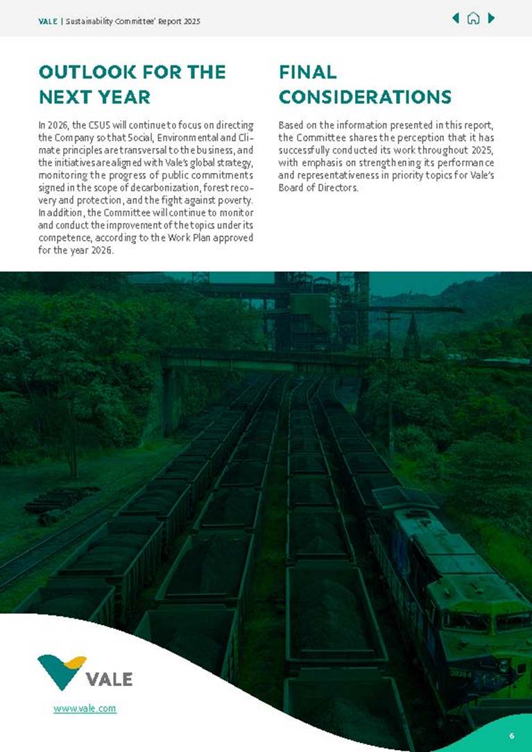 Sustainability Committee Report 2025 Summary Sustainability Committee Report Presentation............................................... 3 Main index...................................................4 Highlights of the year ................................ 5 Outlook for the next year........................... 6 Final considerations.................................... 6 VALE | Sustainability Committee’ Report 2025 2 This report aims to present the main actions carried out by the Sustainability Committee (“Committee”) in 2025 and its main prospects for 2026. PRESENTATION Committee creation date The Committee, focused on social, environmental and climate issues, was created in November 2017 and since then has evolved in its duties, including the debate on updated topics aligned with the Company’s strategy. Committee’s composition and structure The Committee is composed of Rachel Oliveira Maia, as Chair, André Madeira Viana, Franklin Lee Feder, Manuel Lino Silva de Sousa Oliveira (Ollie) and Wagner Vasconcelos Xavier, as members since May 2025. Additionally, it should be noted that Mr. João Luiz Fukunaga acted as a Member until February 20, 2026. Rachel Oliveira Maia Chair André Madeira Viana Committee member Manuel Lino Silva de Sousa Oliveira (Ollie) Committee member Wagner Vasconcelos Xavier Committee member Franklin Lee Feder Committee member VALE | Sustainability Committee’ Report 2025 3 Committee main attributions and responsibilities The Committee aims to advise the Board of Directors (“BoD”) in decision-making to ensure the alignment of the Company’s policies and practices with sustainability in the social, environmental, climate and economic dimensions, enhancing strategic discussions between executives and directors, through its recommendations and proposed challenges. MAIN INDEX Quantitative analysis of meetings The Committee met 12 times in 2025 (8 times in 2024), with 11 ordinary meetings and 1 extraordinary meeting, representing an increase in the total number of meetings compared to the previous year, as a result of the strengthening of this Committee. Adherence rate of the Committee members Members had an attendance of 79% during the meetings, considering the period from May to December 2025, relative to the current term. Average lasting of the Committee’s meetings Throughout 2025, the Committee met for 39 hours, with its meetings lasting an average of 3h33. Its meetings were divided into 118 agenda items, distributed in 110 informative themes and 8 deliberative themes. Quantitative analysis of the Committee’s workplan and demands The meetings held in 2025 fulfilled 100% of the schedule provided for in the respective annual work plan, with the percentage resulting from the prioritization of strategic themes, with a view to optimizing dynamics, which was even considered as a driver for the construction of the work plan for the year 2026. In addition, 104 demands for clarification and extra recommendations from the members of the Committee were addressed in the period. VALE | Sustainability Committee’ Report 2025 4 HIGHLIGHTS OF THE YEAR Summary of the main activities carried out by the Committee in 2025 During 2025, the Committee exercised its duties, in accordance with the competencies provided for in its internal regulations and in line with the Company’s strategy, among which the following stand out: • Strengthening the company’s culture of sustainability, promoting sustainability intrinsic to Vale’s businesses and projects, through the implementation of socio-environmental analysis tools; • Consolidated monitoring of the Company’s sustainability initiatives, through Vale’s Sustainability strategic performance panel; • Monitoring progress and challenges of the company’s public commitments in 2025, such as decarbonization and climate change, forest recovery and protection, and combating extreme poverty; • Monitoring of Vale initiatives and performance at COP30, held in November 2025 in Belém do Pará, Brazil, with the participation of Board members; • Monitoring of the company’s communication strategy with its stakeholders, including employees; • Monitoring of Vale’s institutional action strategy, mainly in the areas of Environment, Licensing and Sustainability; • Monitoring of the socio-environmental recovery plan of Brumadinho; • Evaluation and guidance on the guidelines of the Integrated Report 2024; • Monitoring of the company’s communication strategy with its stakeholders; • Analysis of issues related to Environmental, Social and Climate themes, through specific sessions on nature and biodiversity, water resources management, environmental licensing, social action plan, education and technical training, human rights, and circular mining; • Monitoring Vale’s participation in sustainability events, such as NY Climate Week; • Monitoring of Vale’ s external socio-environmental and institutional expenditures, and recommendation of the budget proposal for the year 2026 so that the Company advances with the 2030 commitments; • The Committee’s performance in the discussions on the update of the Climate Change Policy, in October 2025. • Promotion of Literacy sessions for the entire Board of Directors on topics such as Indigenous Peoples. VALE | Sustainability Committee’ Report 2025 5 www.vale.com OUTLOOK FOR THE NEXT YEAR In 2026, the CSUS will continue to focus on directing the Company so that Social, Environmental and Climate principles are transversal to the business, and the initiatives are aligned with Vale’s global strategy, monitoring the progress of public commitments signed in the scope of decarbonization, forest recovery and protection, and the fight against poverty. In addition, the Committee will continue to monitor and conduct the improvement of the topics under its competence, according to the Work Plan approved for the year 2026. FINAL CONSIDERATIONS Based on the information pres